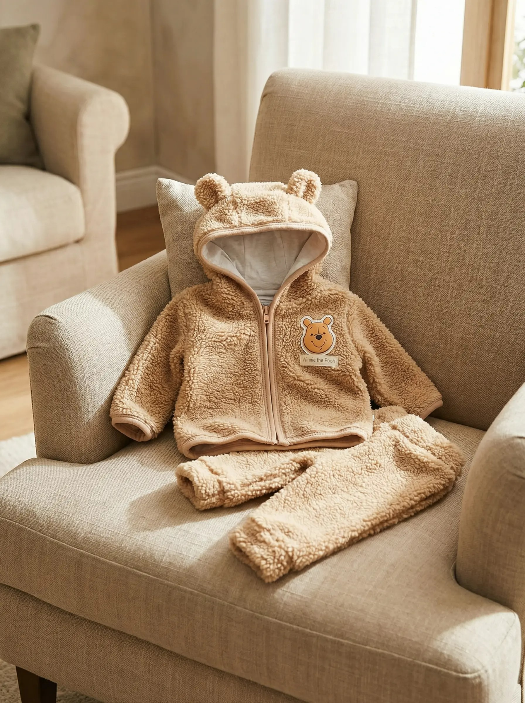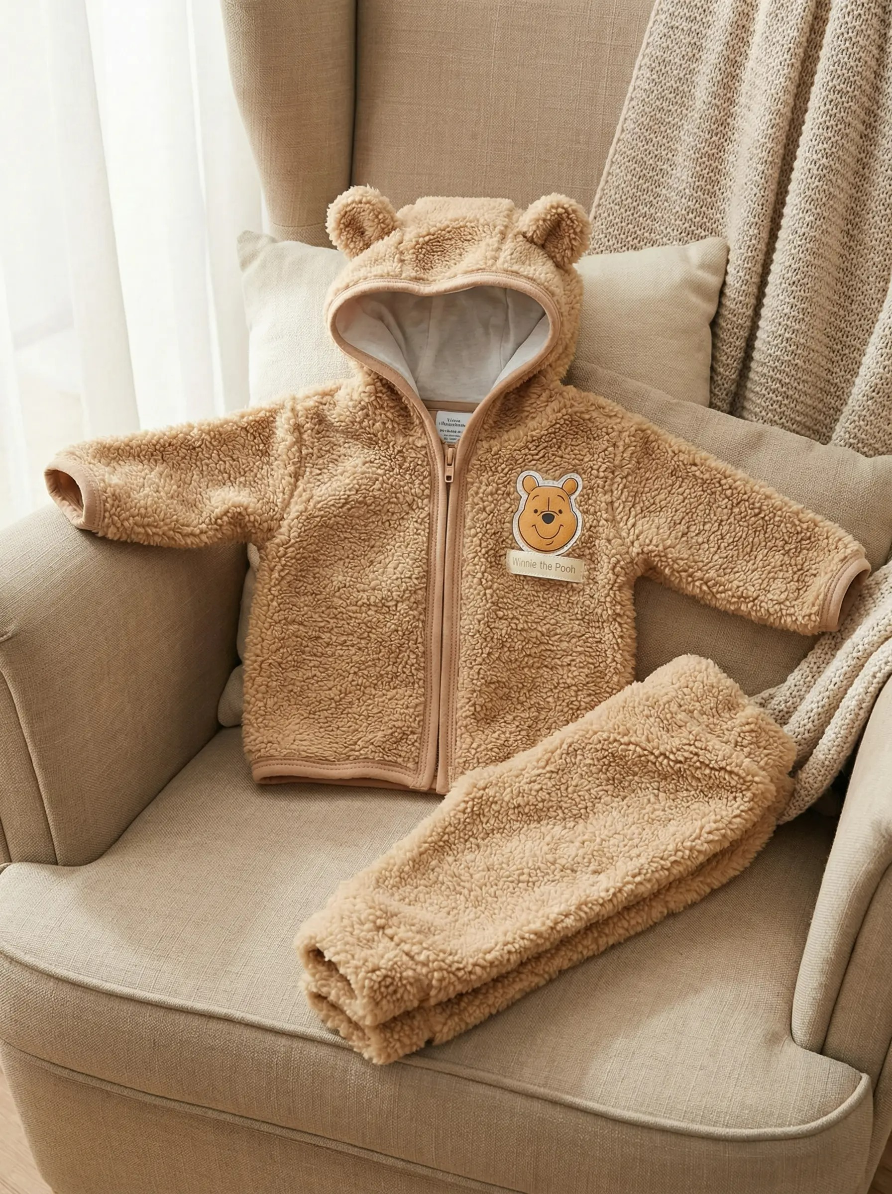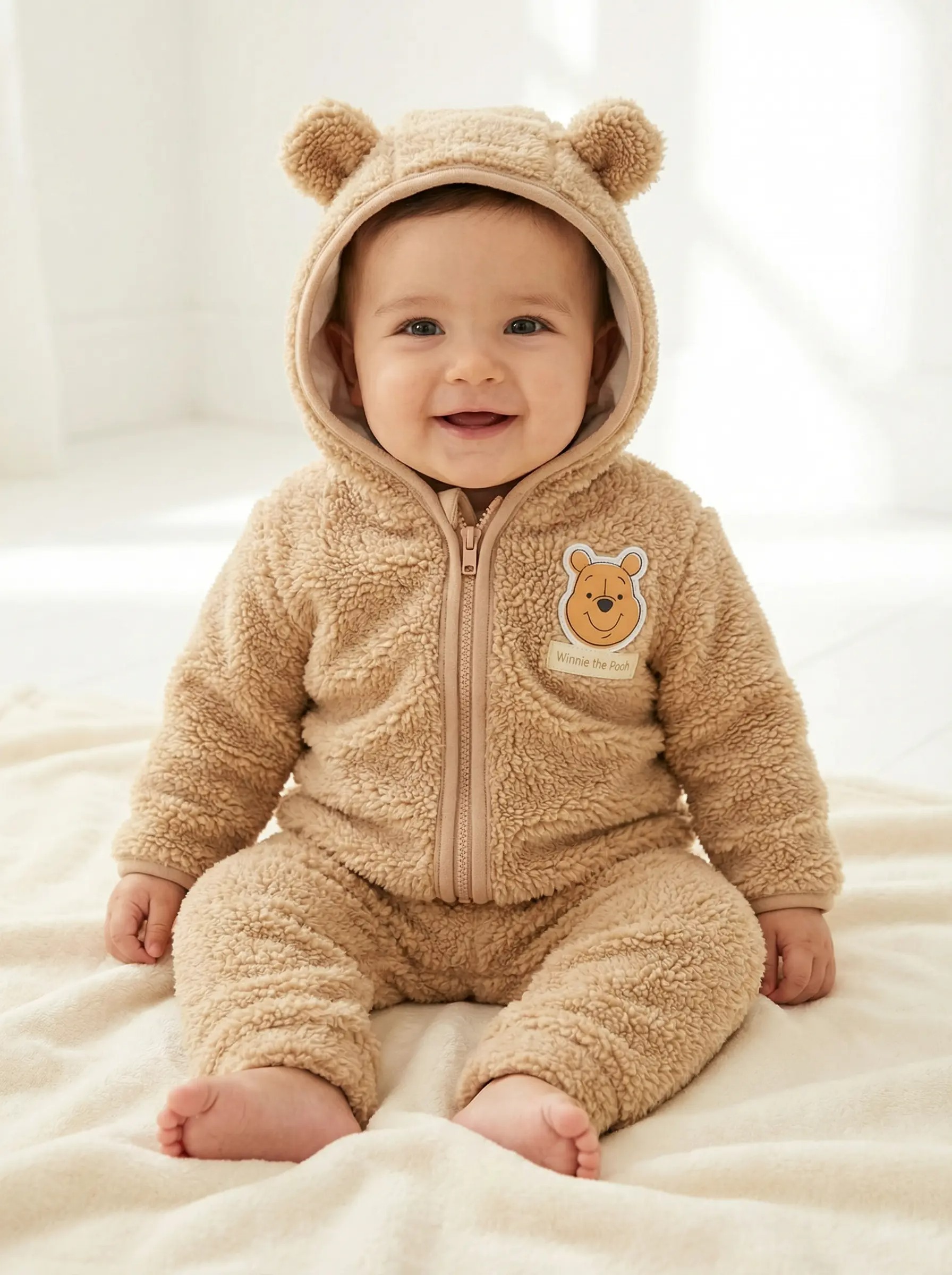 Kışlık Peluş Bebek Takımı 2’li Ayıcık Kulaklı Kapüşonlu Fermuarlı (0–12 Ay)