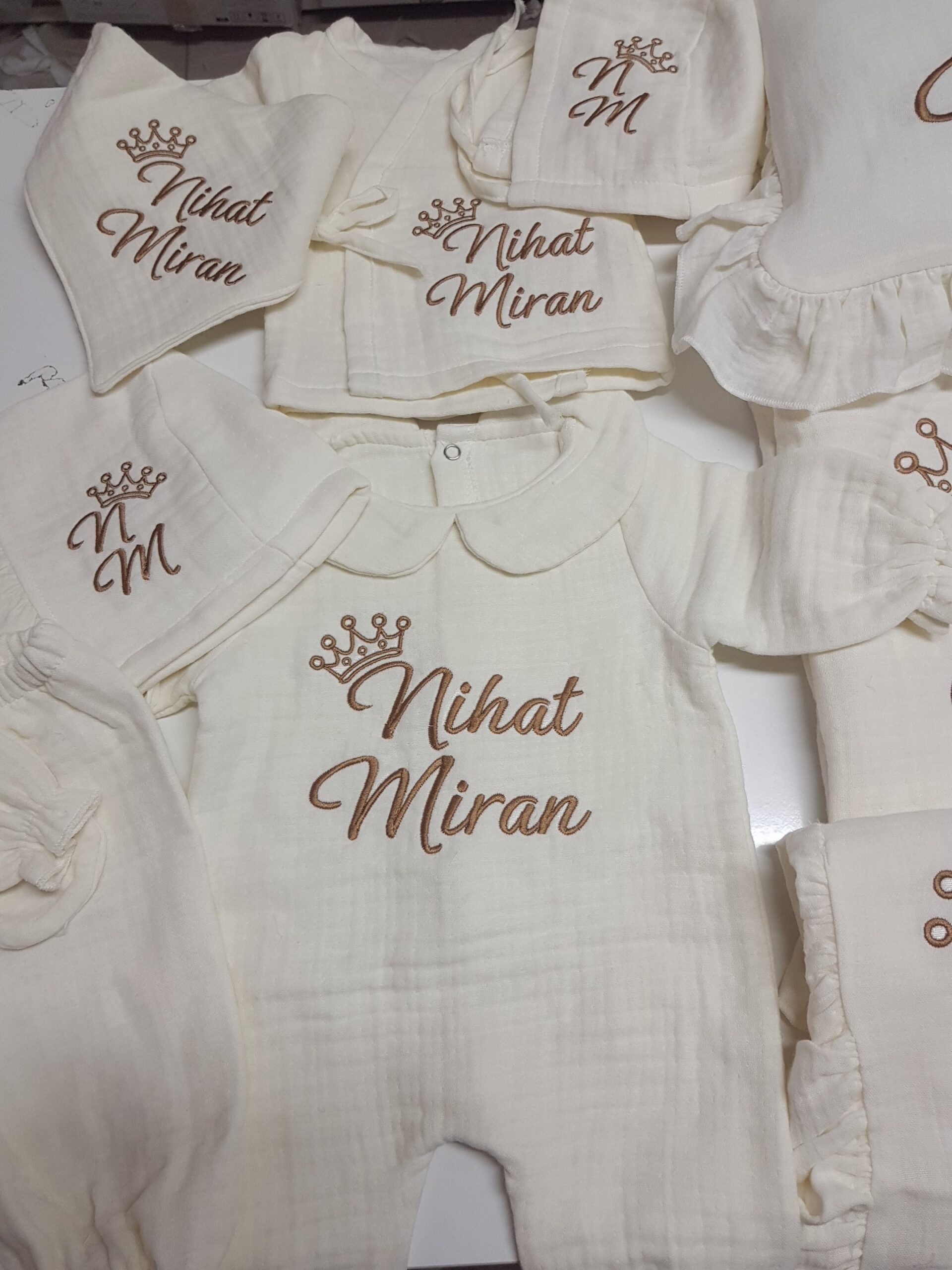 Müslin Hastane Çıkışı 4 Katlı %100 Pamuk İsim Nakışlı Bebek Seti (0-3 Ay)
