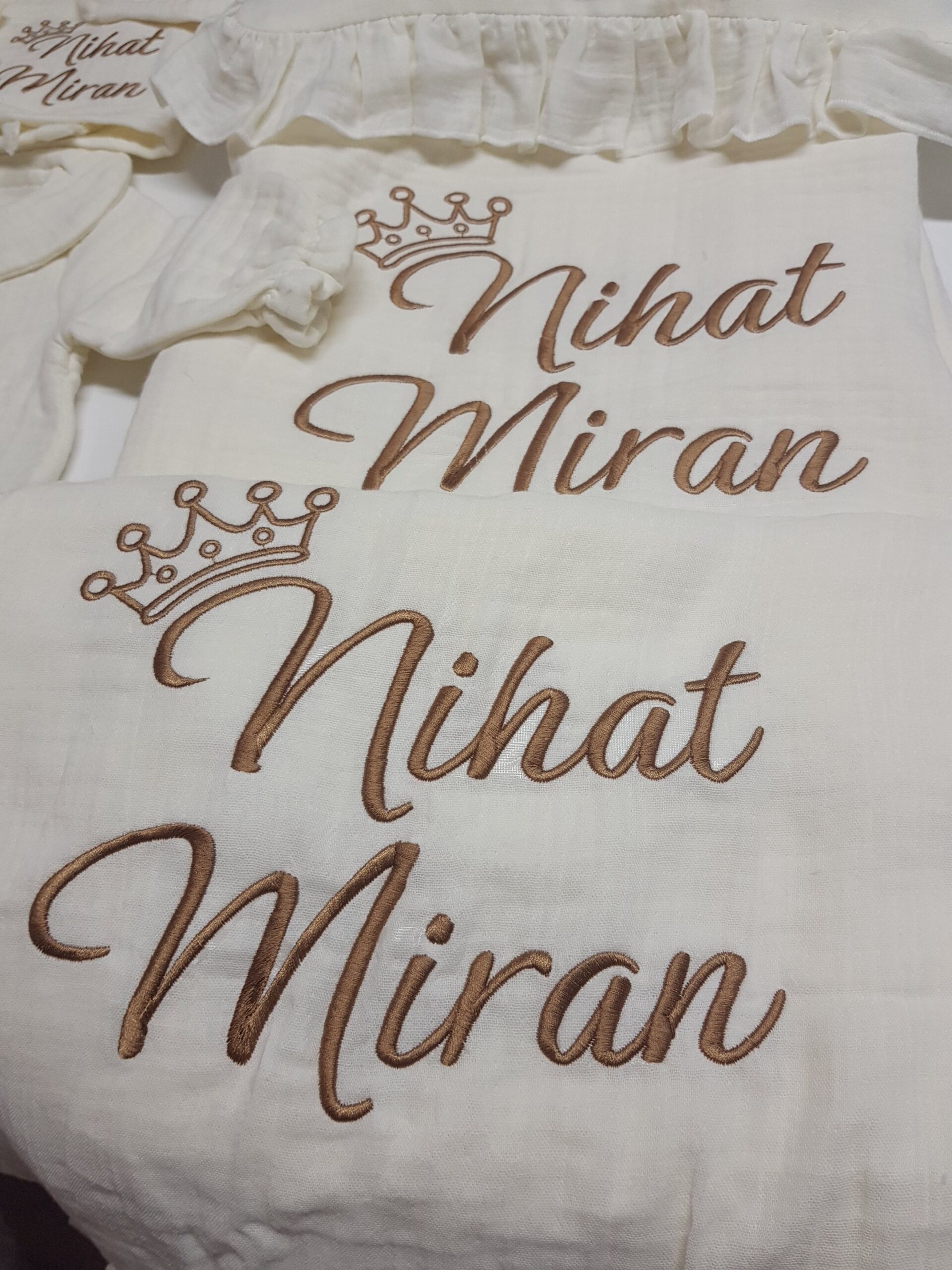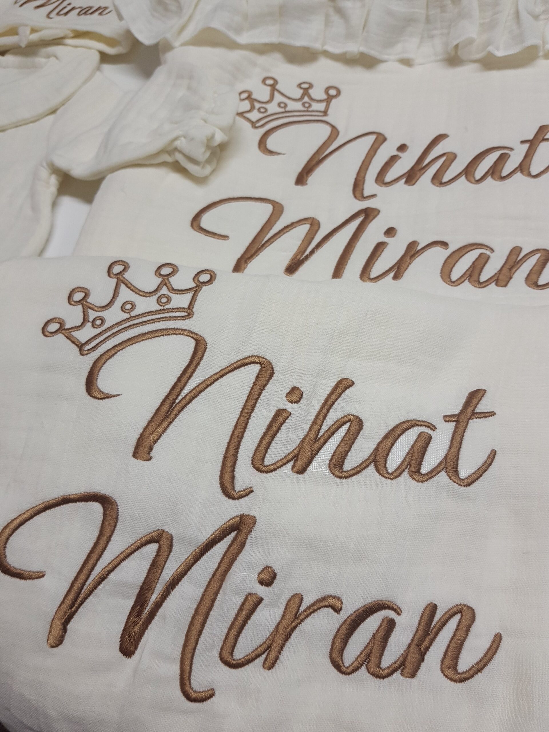 Kişiye özel isim nakışı ile anlamlı bir hatıraya dönüşen müslin hastane çıkışı, günlük kullanım ve özel günler için zarif bir hediye olarak tercih edilebilir.