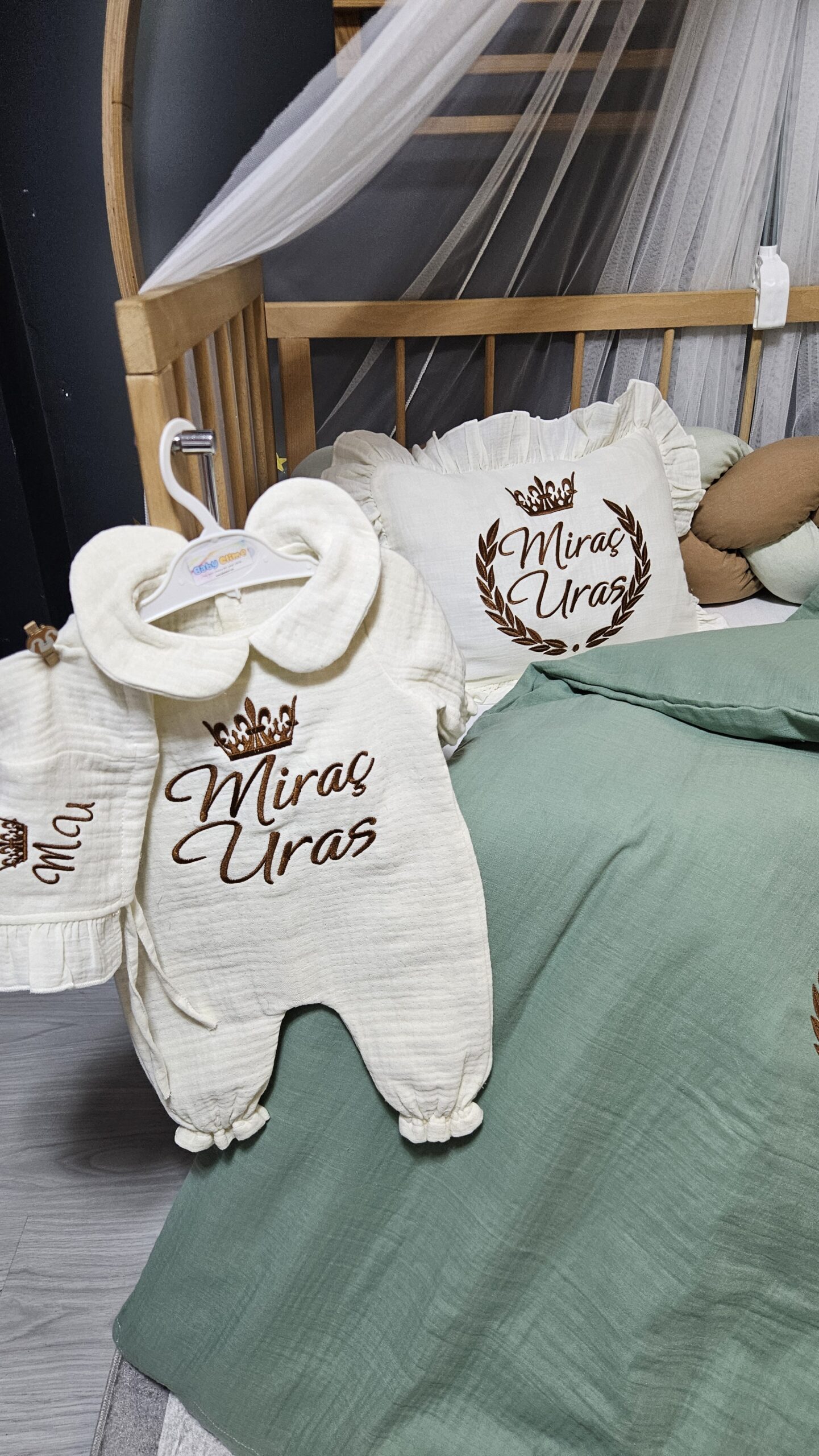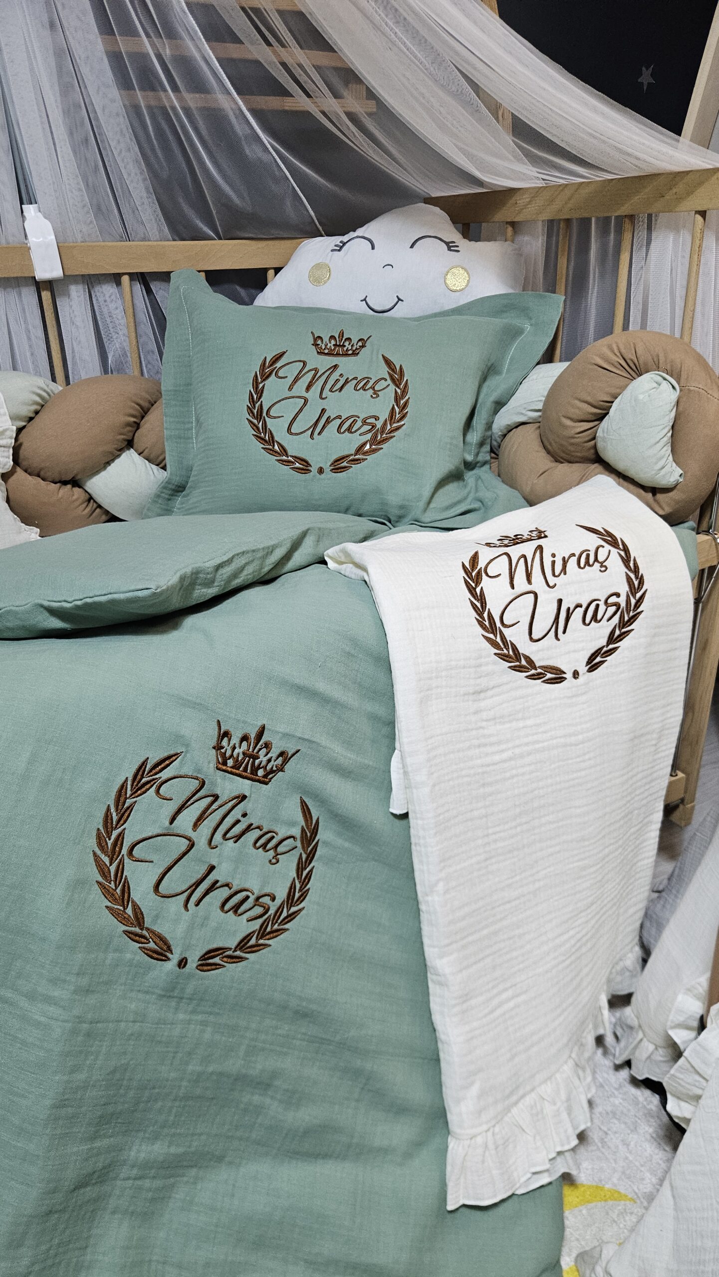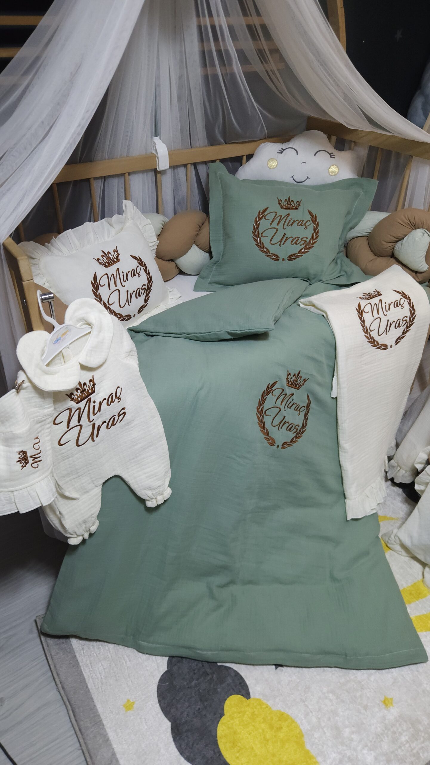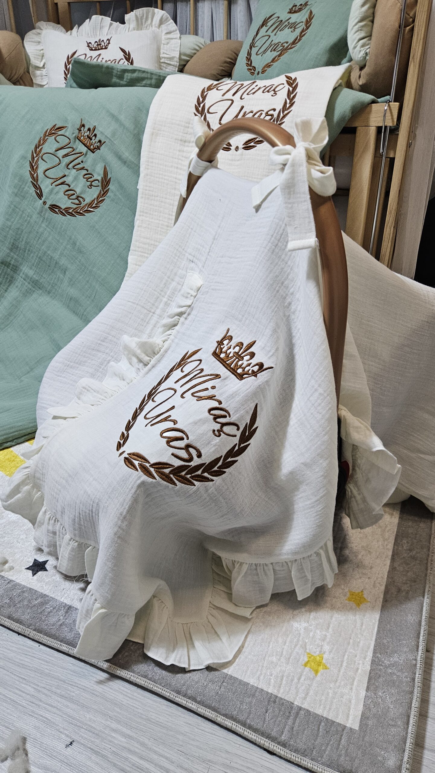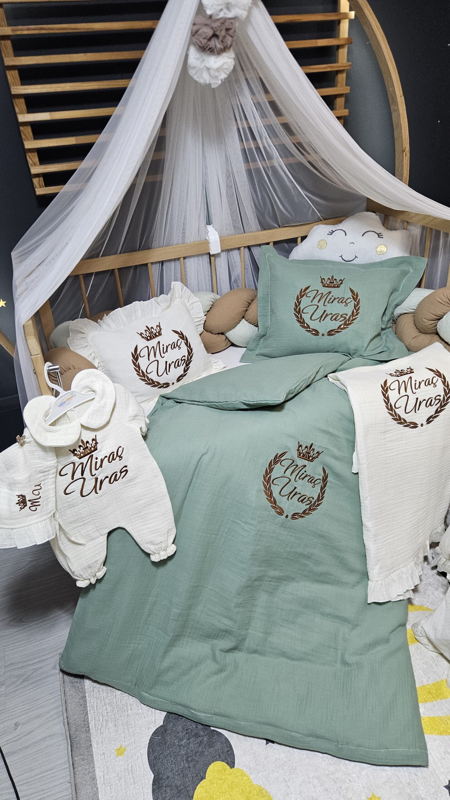 Nakış işlemeli “Başak ve Taç” motifli ve isimli bebek uyku seti, farklı beşik modellerine uygun olarak hazırlanabilir. Setin içeriği, tercihinize göre seçilebilecek çeşitli parçaları içermektedir.