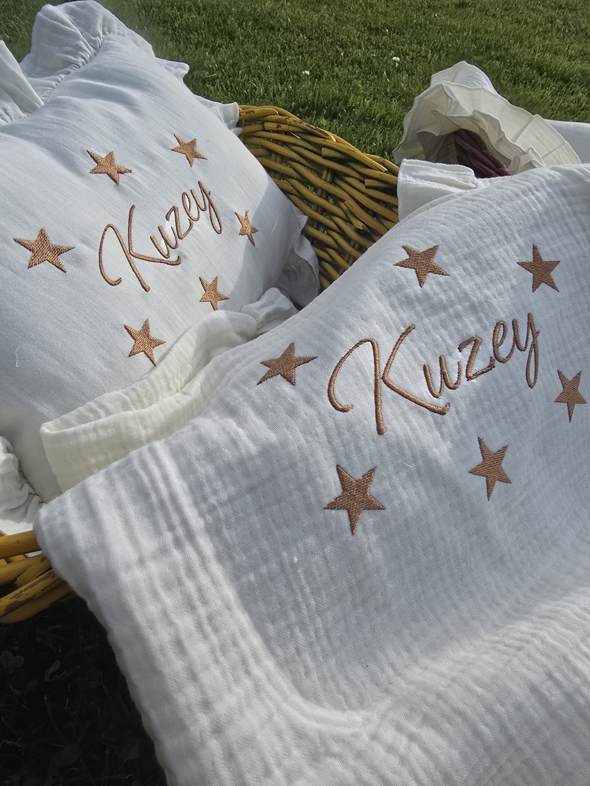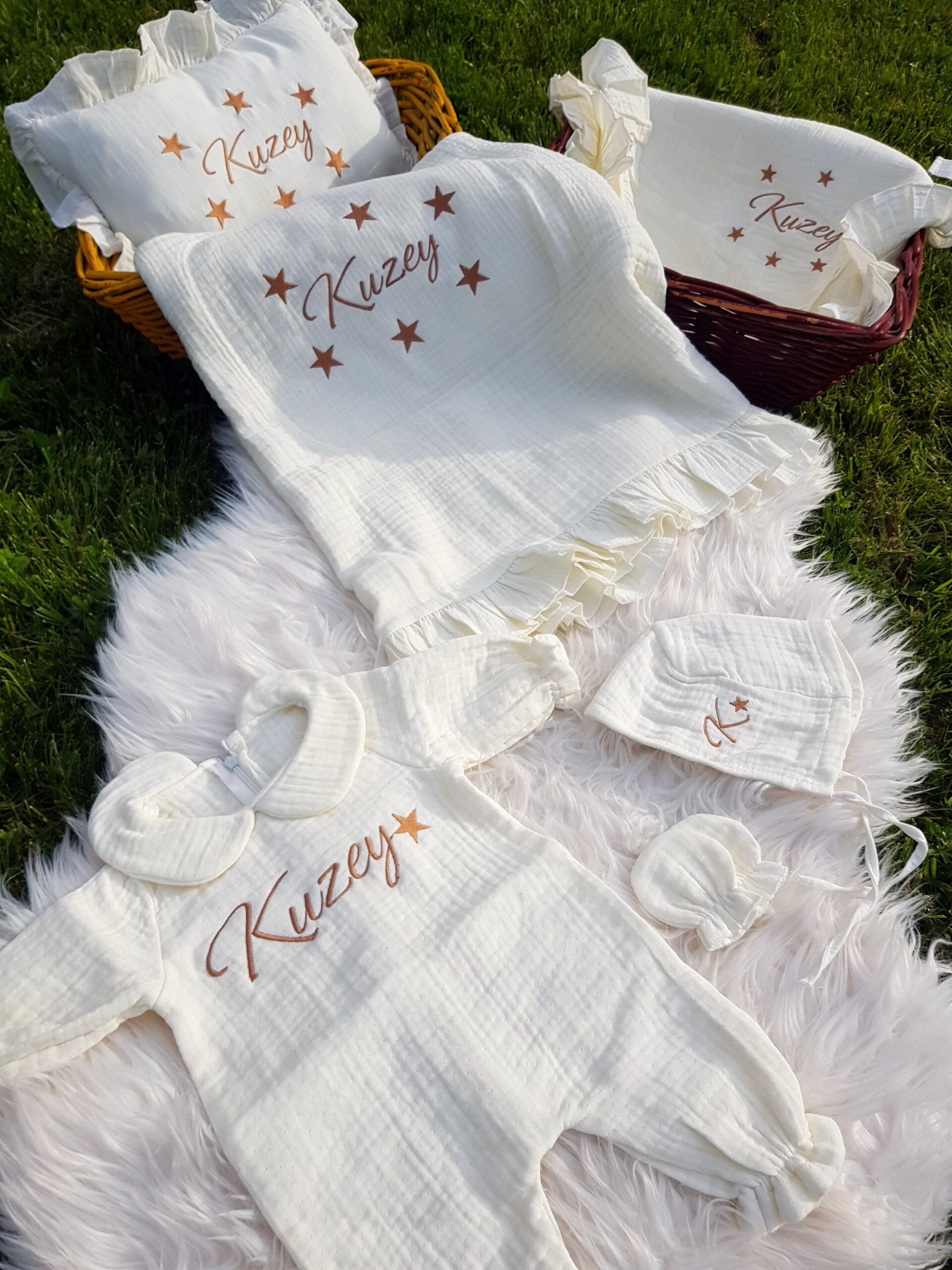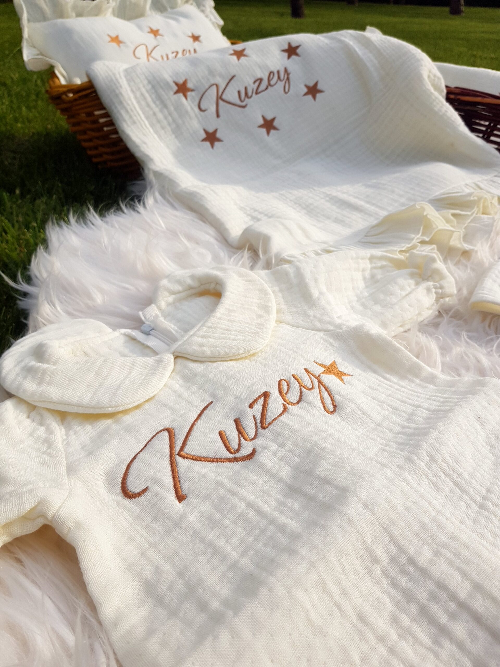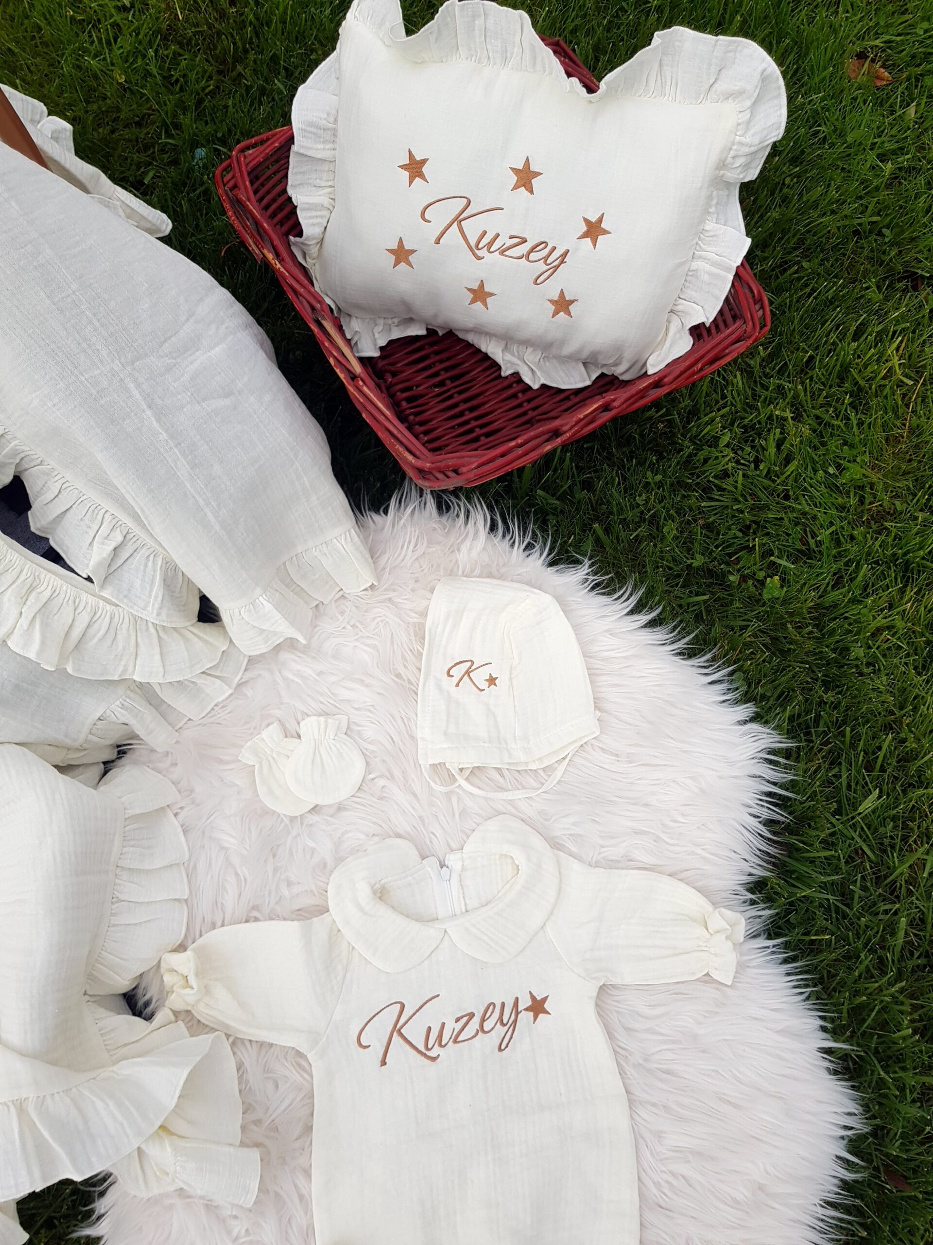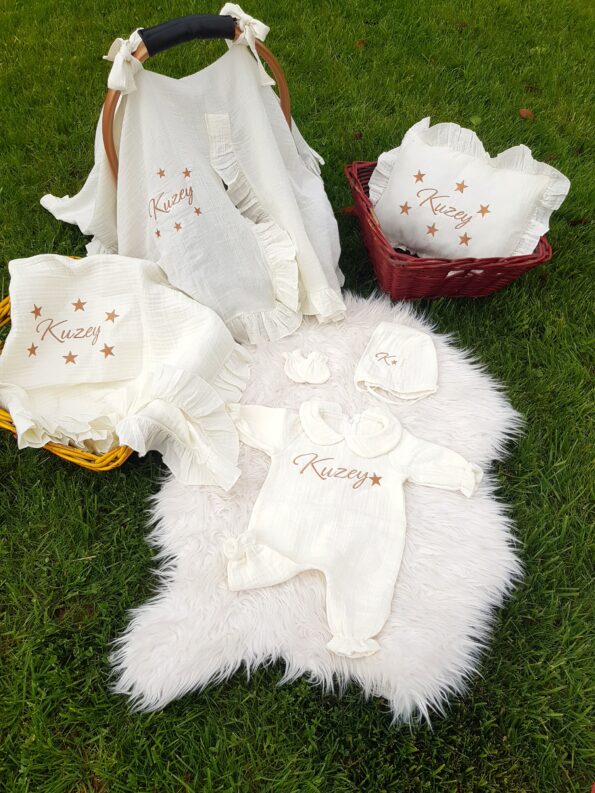 Kişiye özel isim nakışı ile anlamlı bir hatıraya dönüşen müslin hastane çıkışı, günlük kullanım ve özel günler için zarif bir hediye olarak tercih edilebilir.