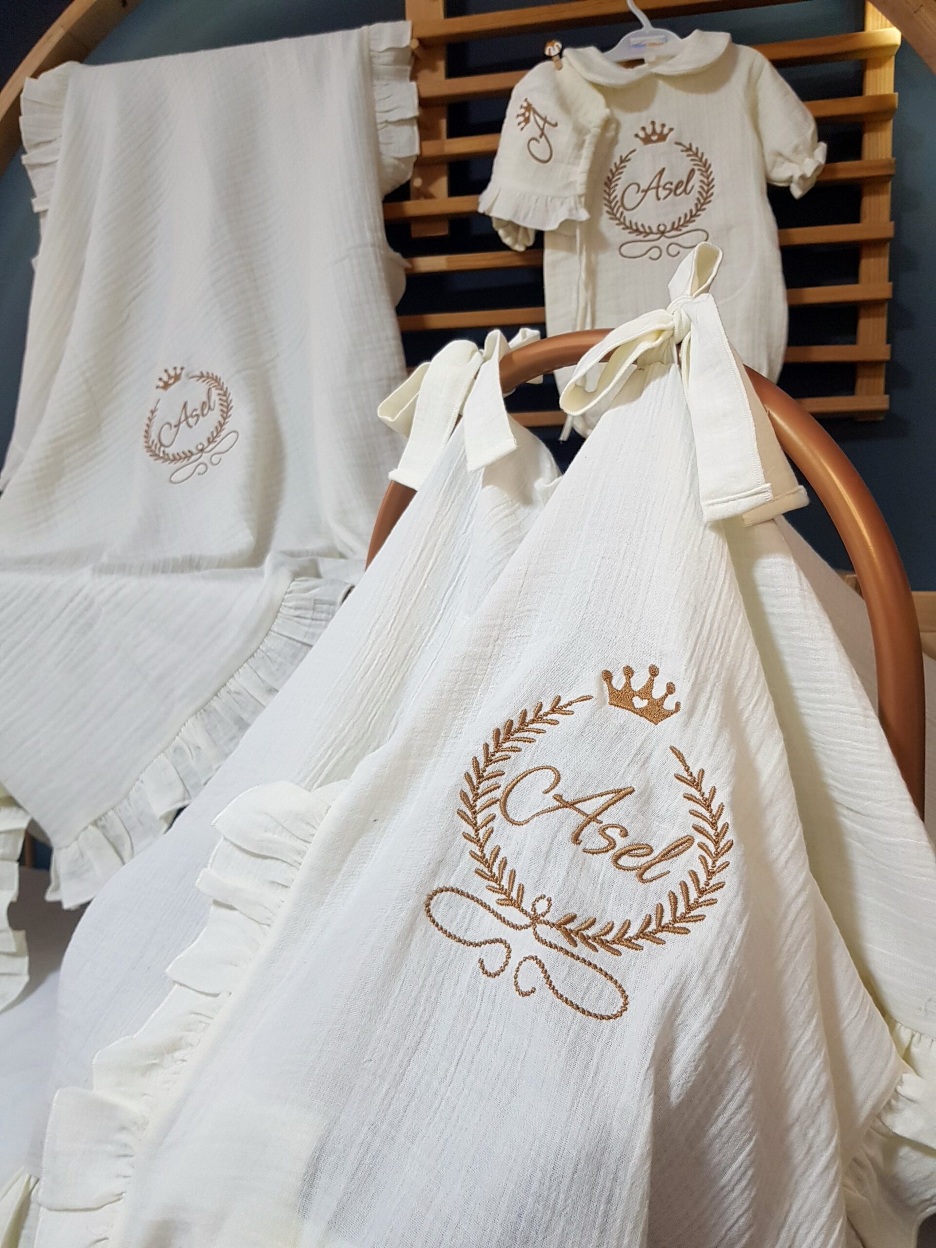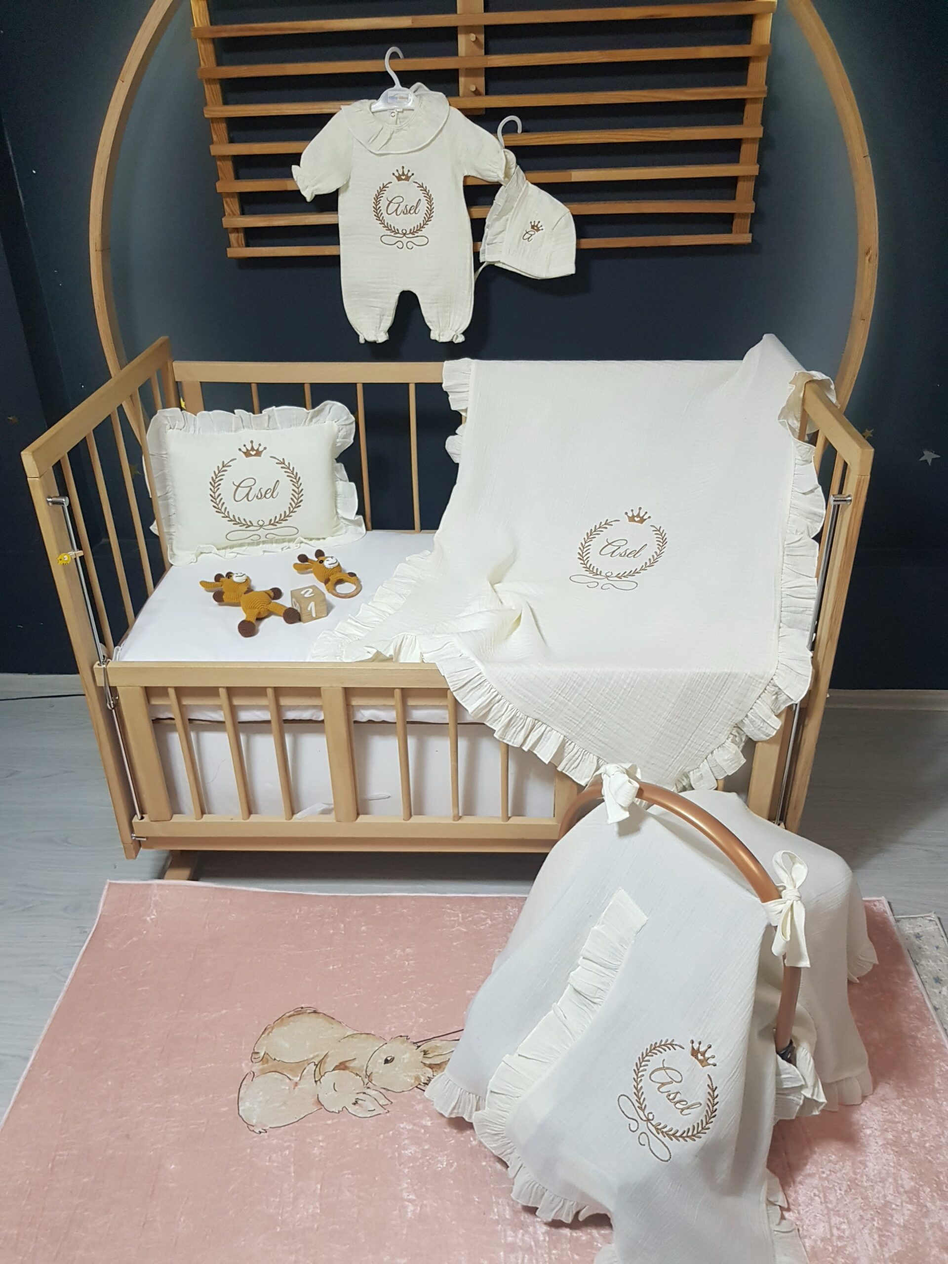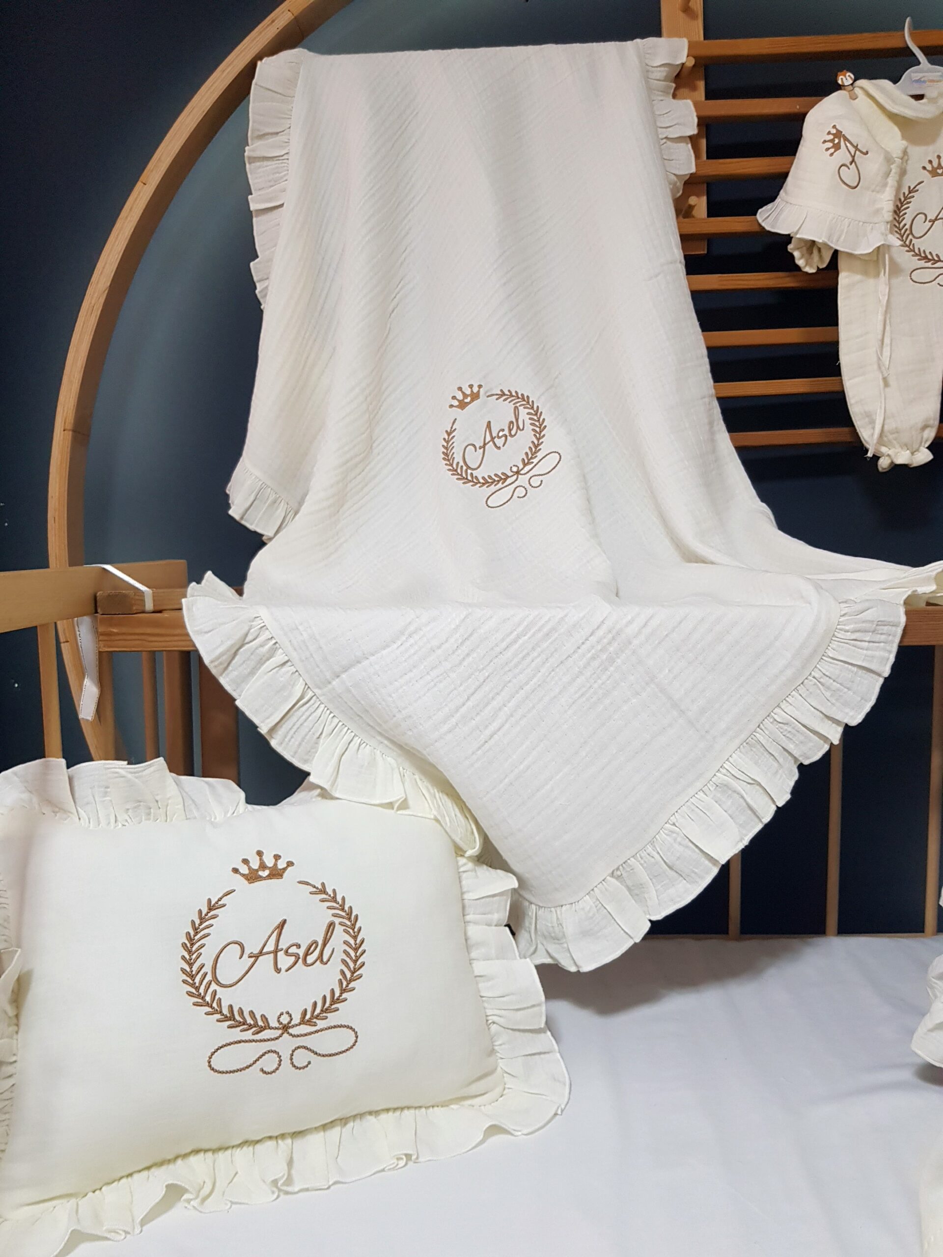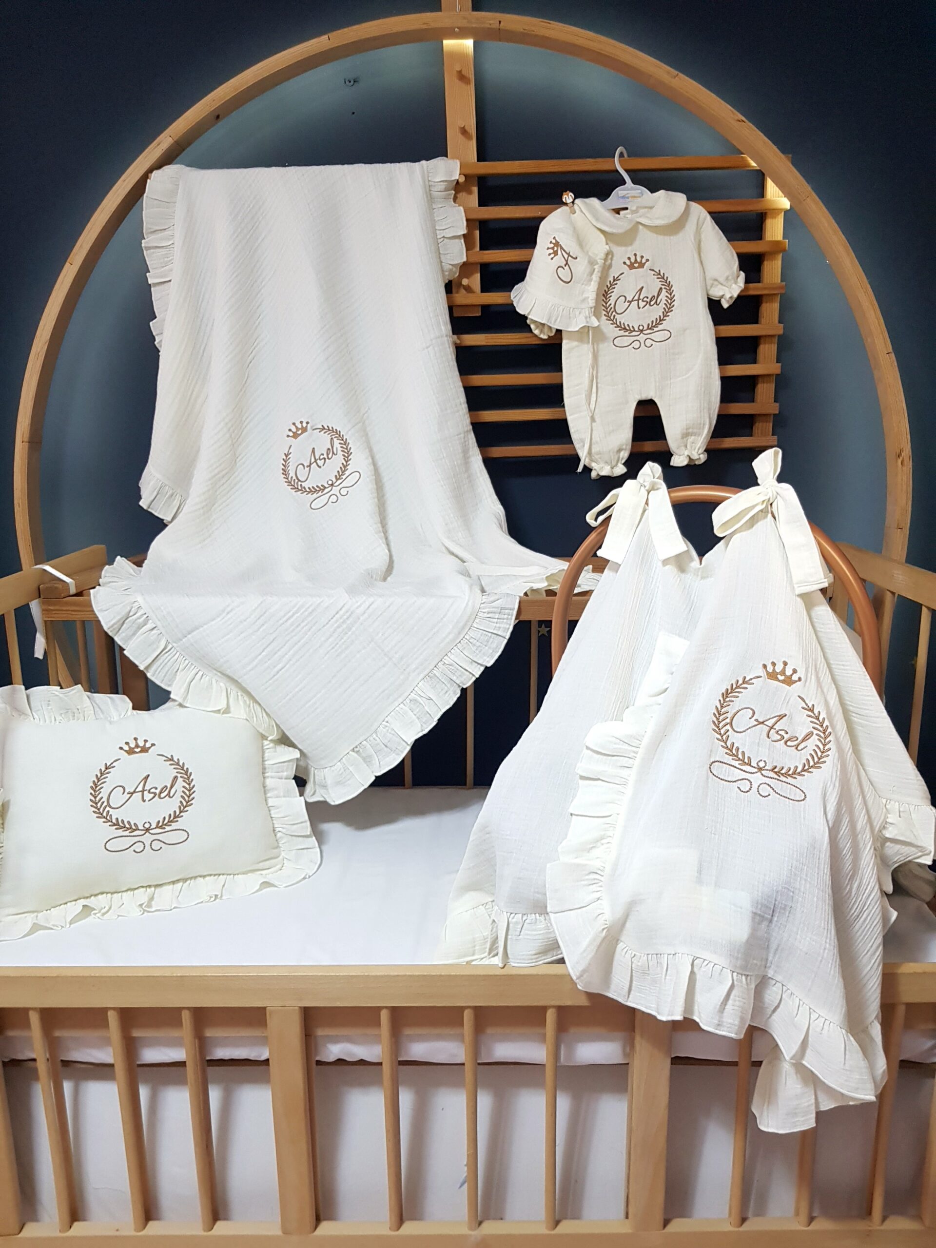 Görselde bulunan isim nakışlı dekoratif kasnak setin dışında bir üründür. Nakış işlemeli “Başak ve Taç” motifli bebek uyku seti, farklı beşik modellerine uygun olarak hazırlanabilir. Setin içeriği, tercihinize göre seçilebilecek çeşitli parçaları içermektedir.
