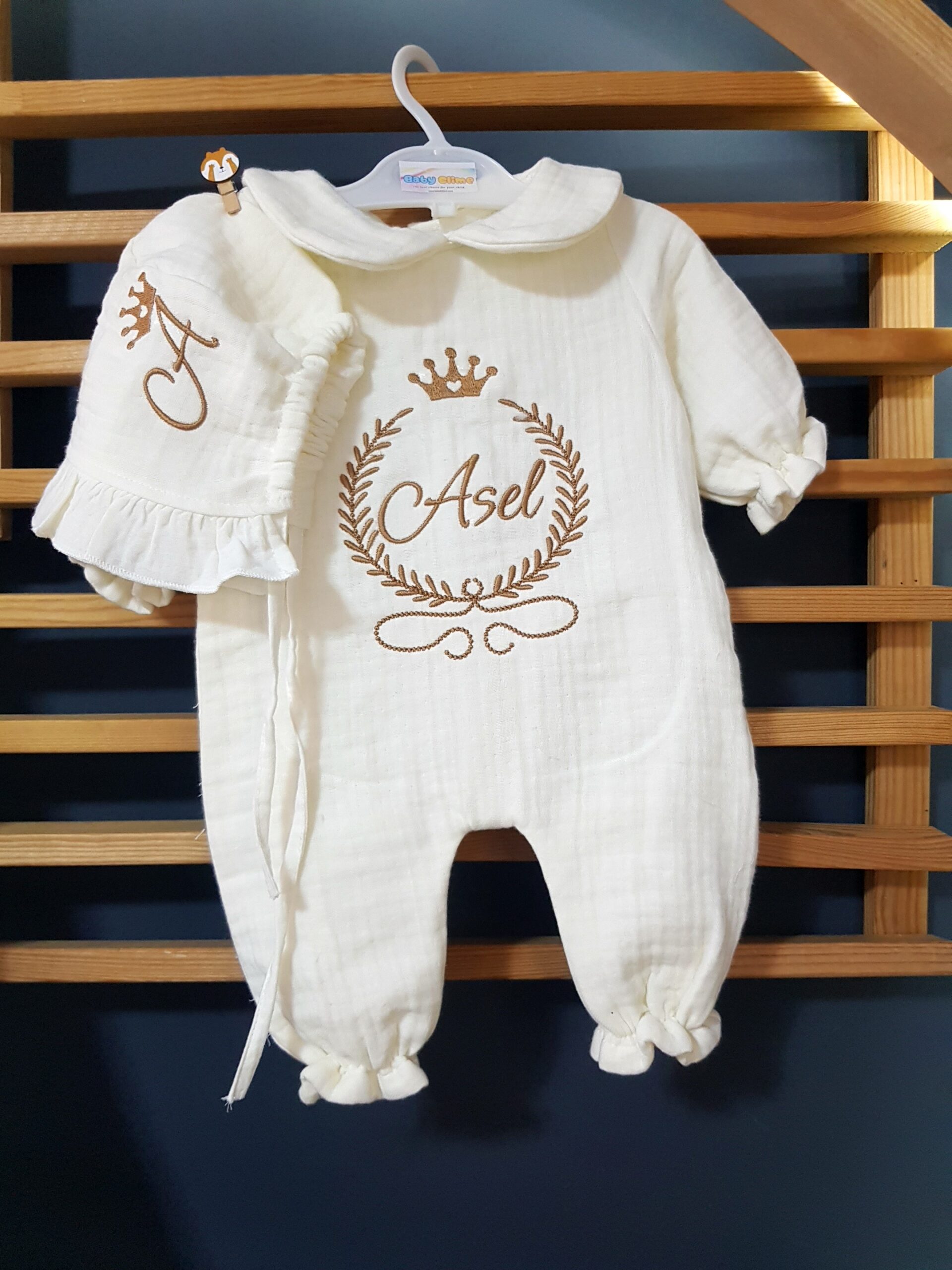 Kişiye özel isim nakışı ile anlamlı bir hatıraya dönüşen müslin hastane çıkışı, günlük kullanım ve özel günler için zarif bir hediye olarak tercih edilebilir.