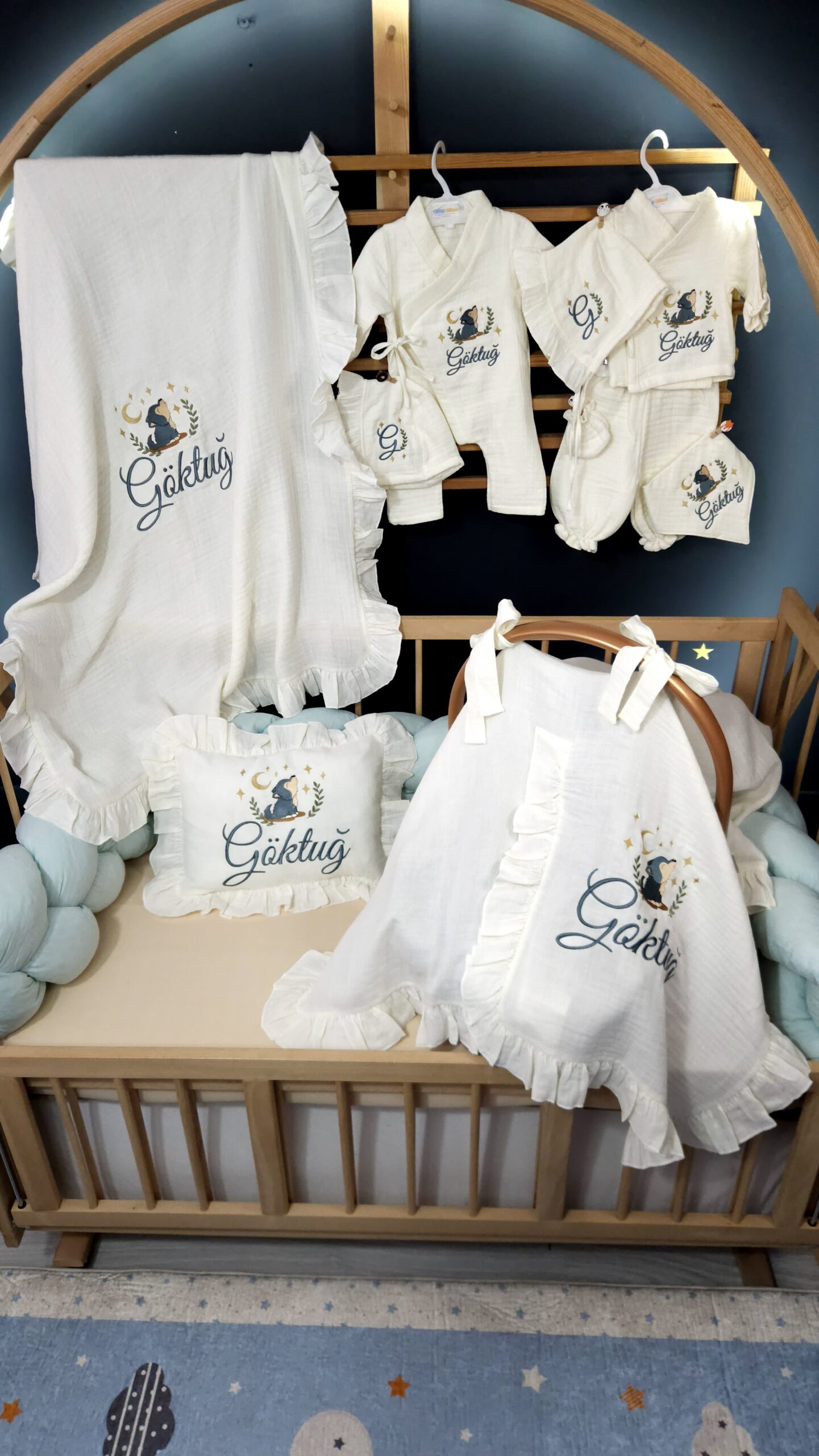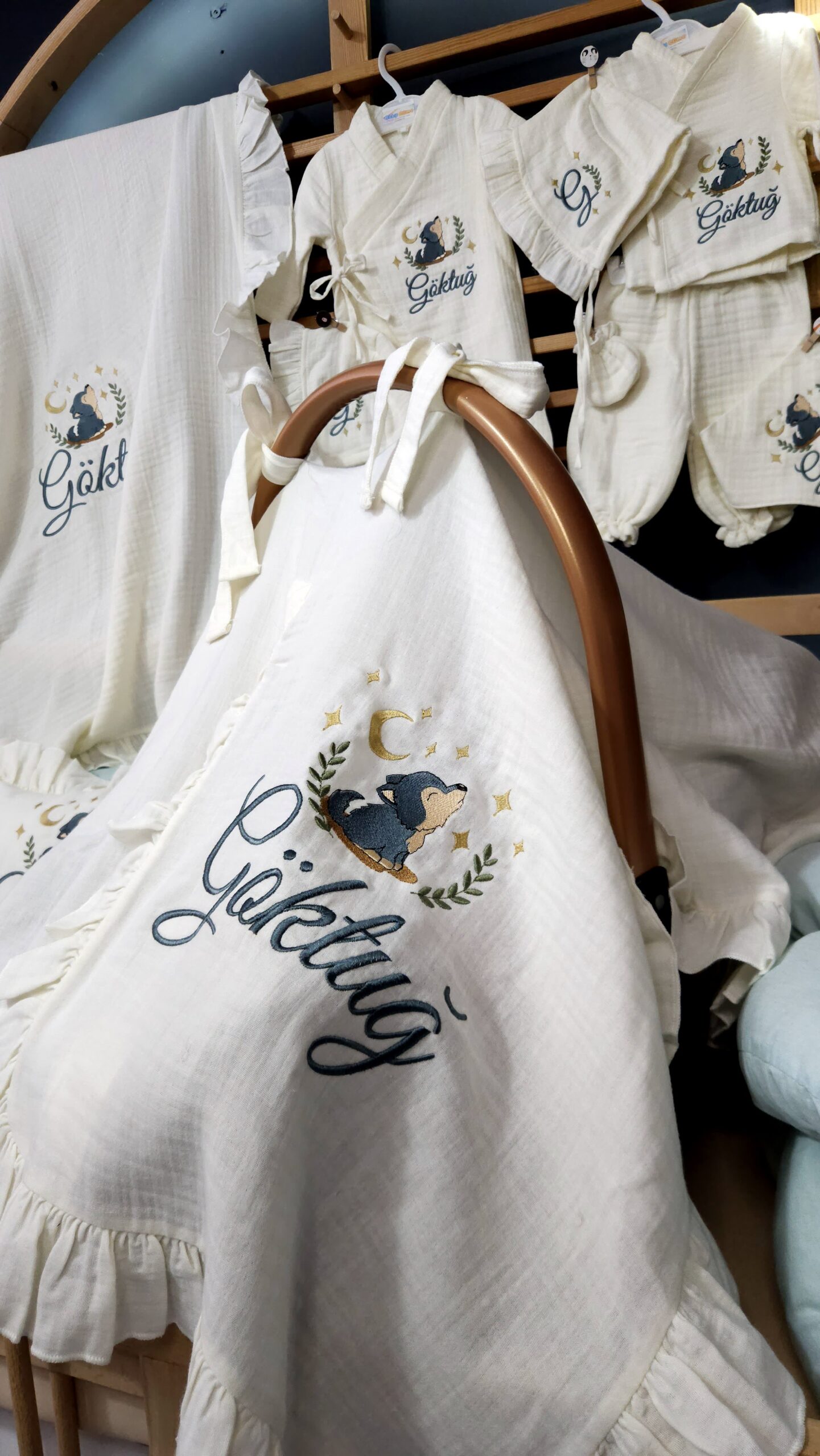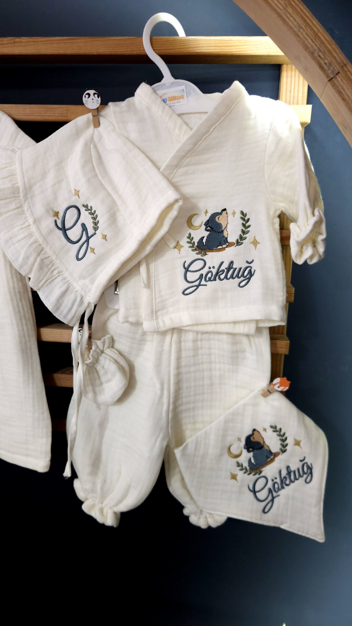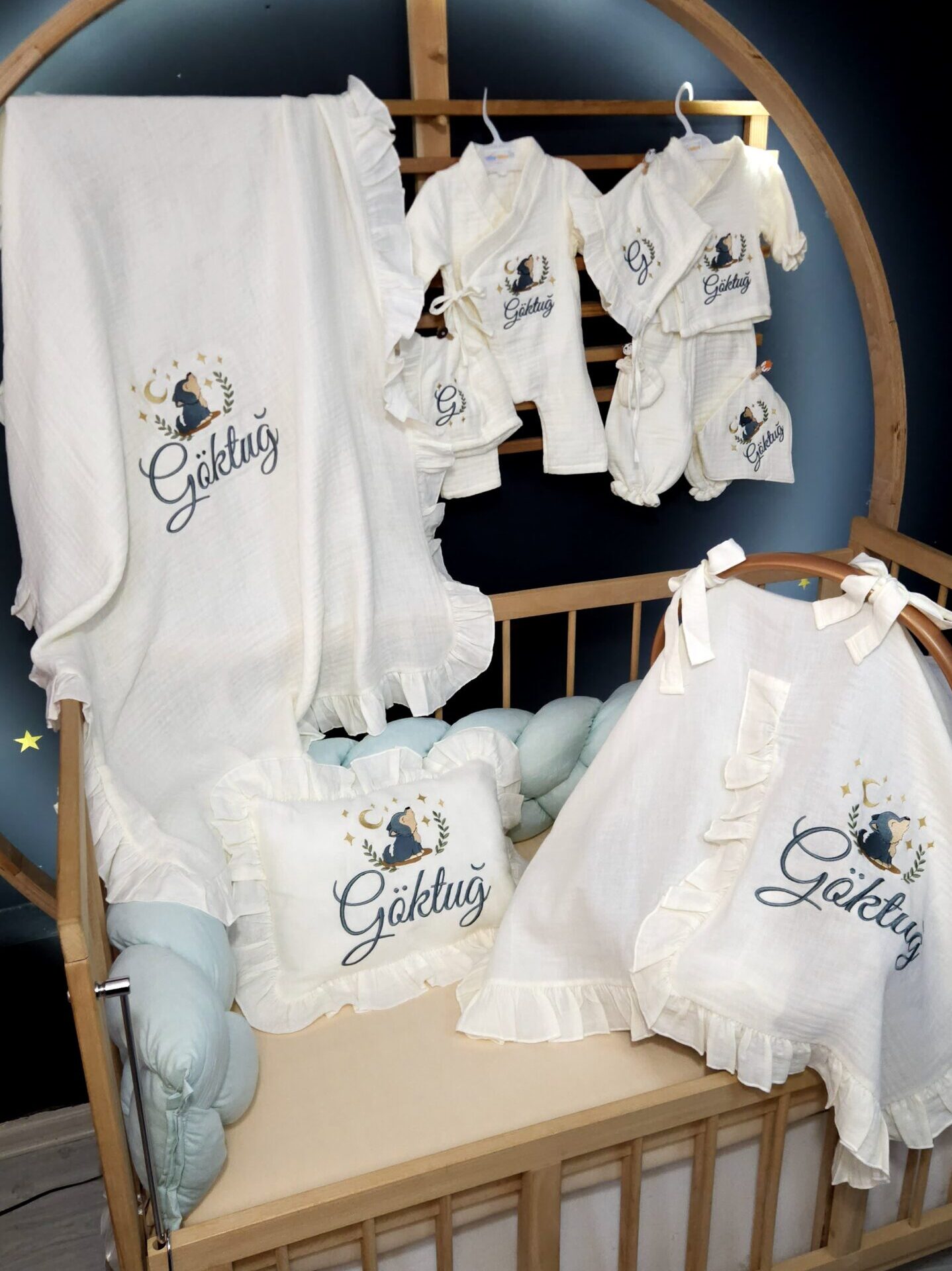Müslin bebek hastane çıkışı seti isim nakışlı
