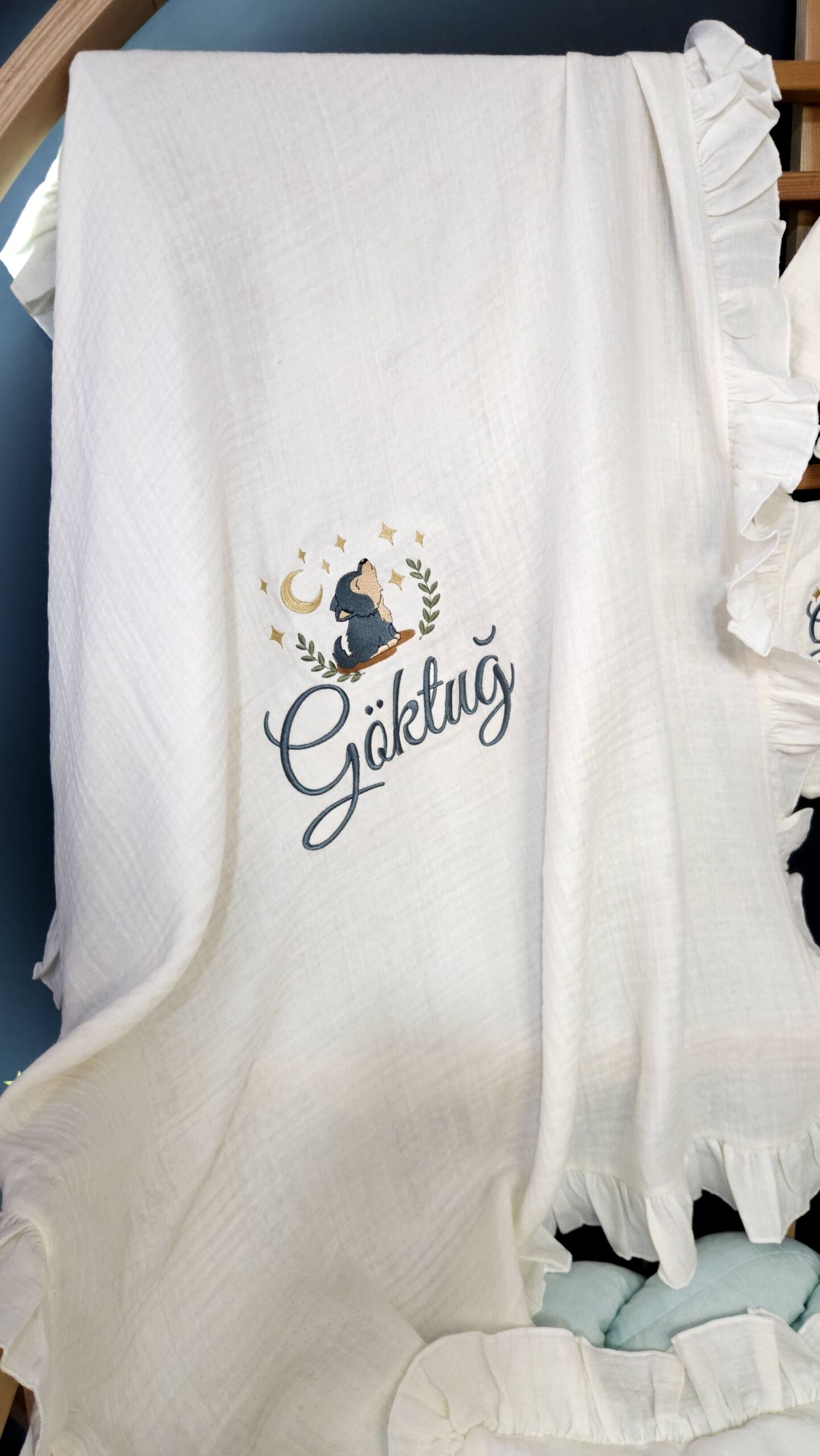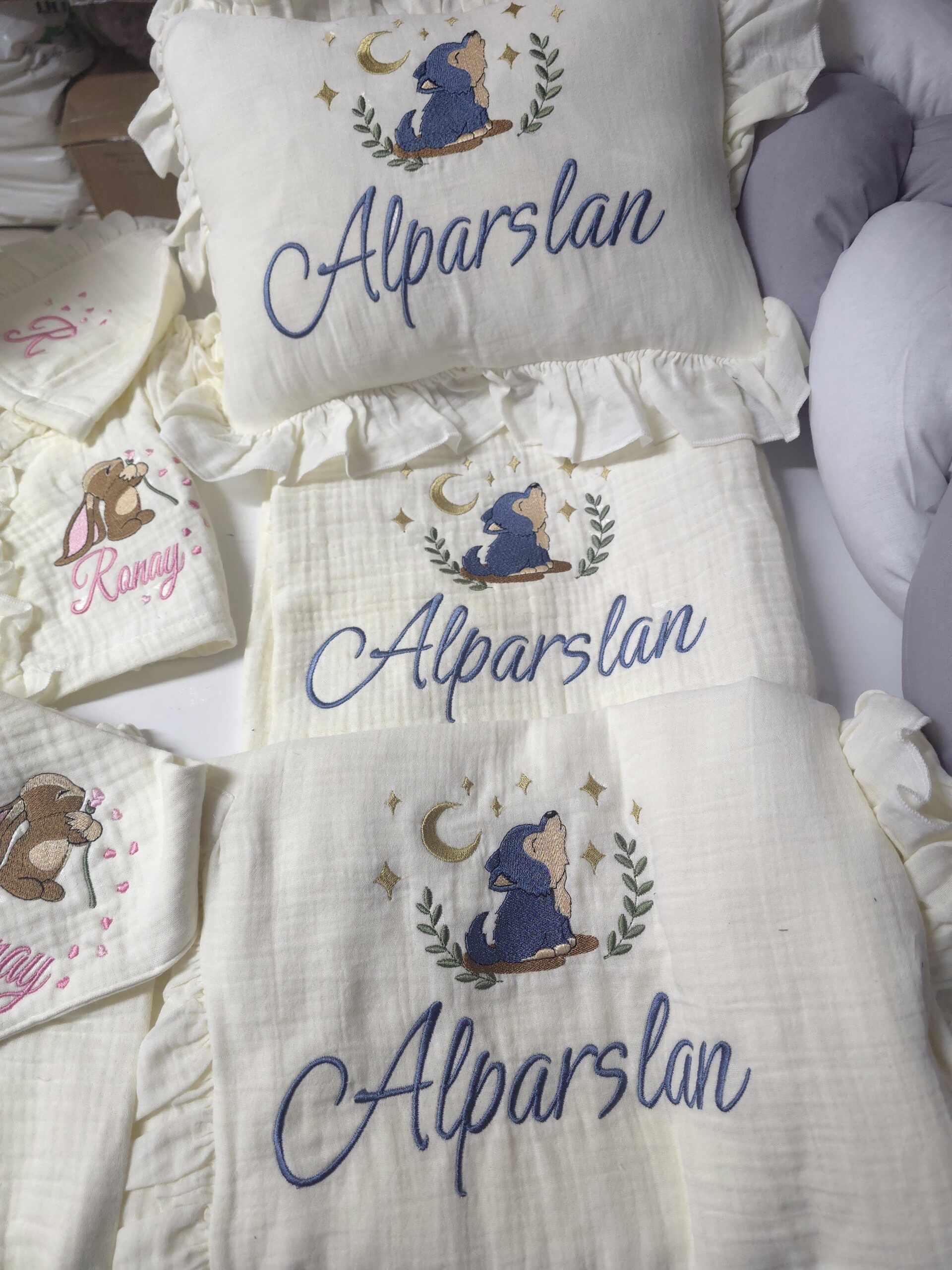 Kişiye özel isim nakışı ile anlamlı bir hatıraya dönüşen müslin hastane çıkışı, günlük kullanım ve özel günler için zarif bir hediye olarak tercih edilebilir.