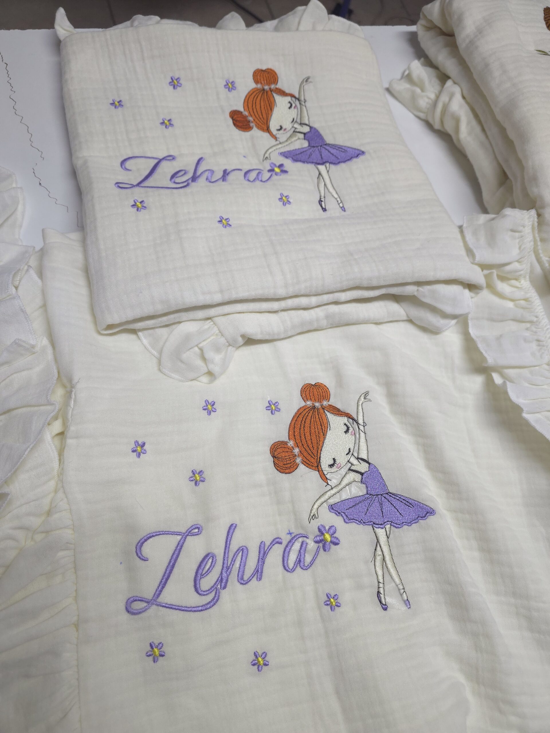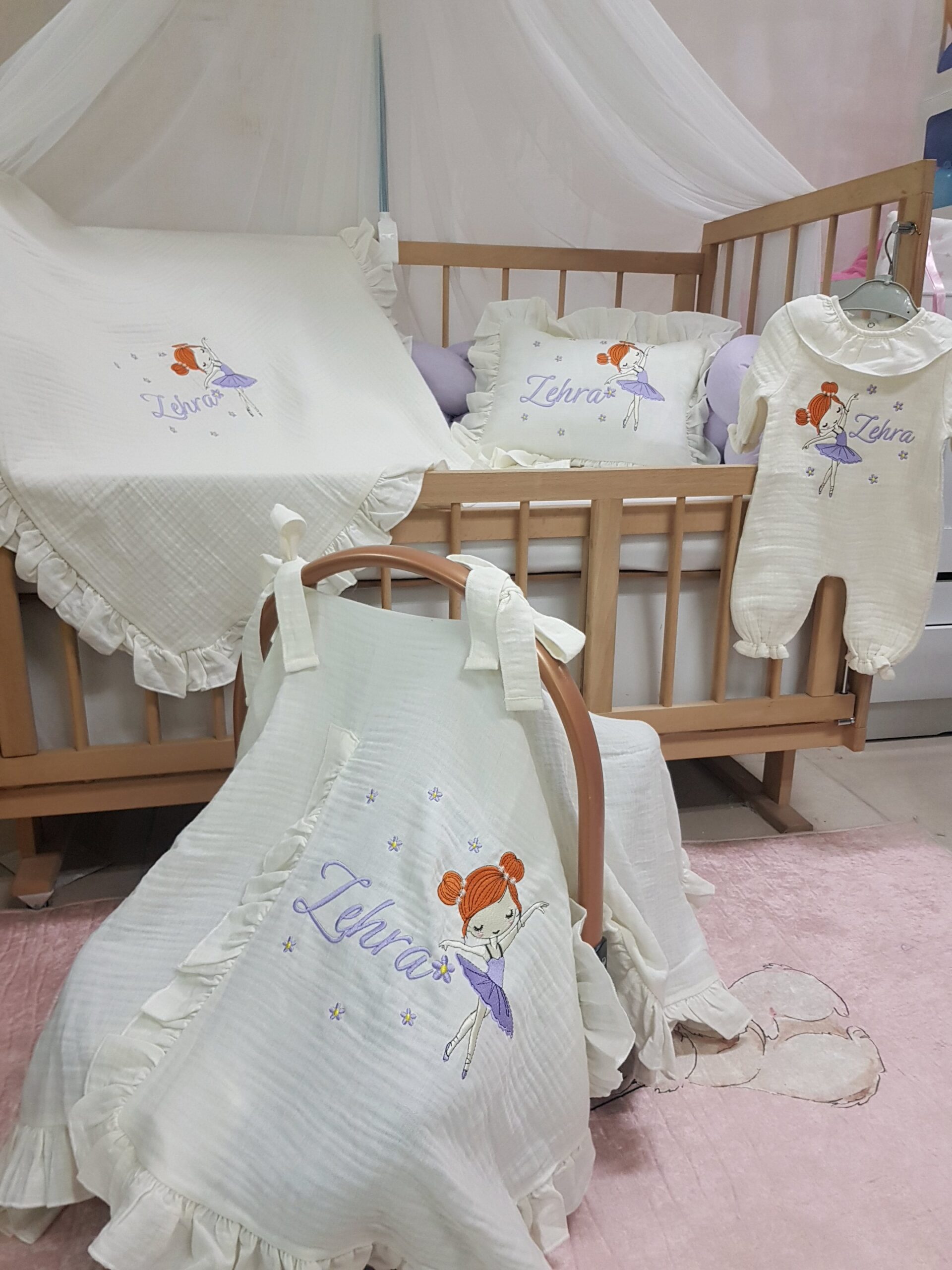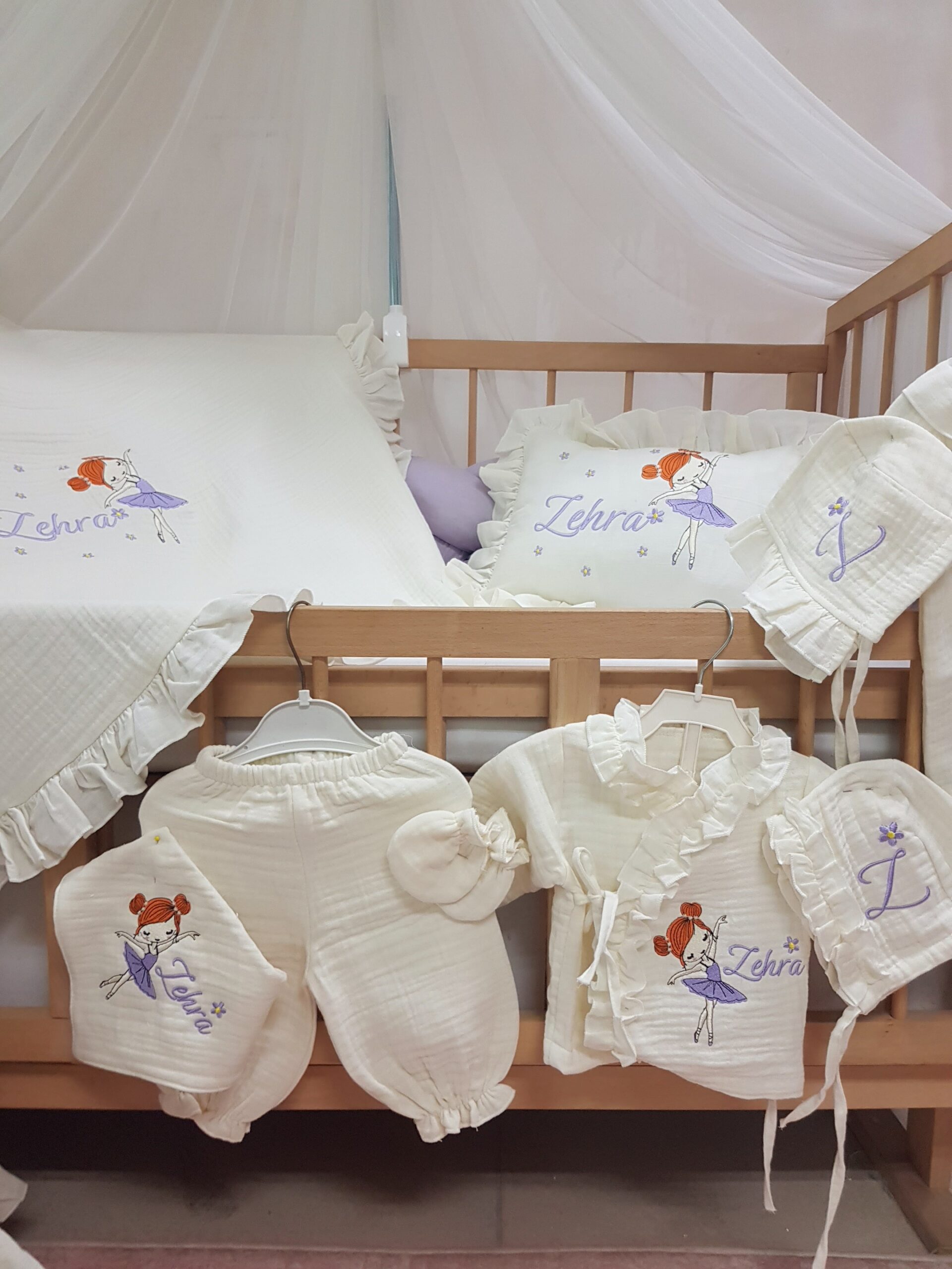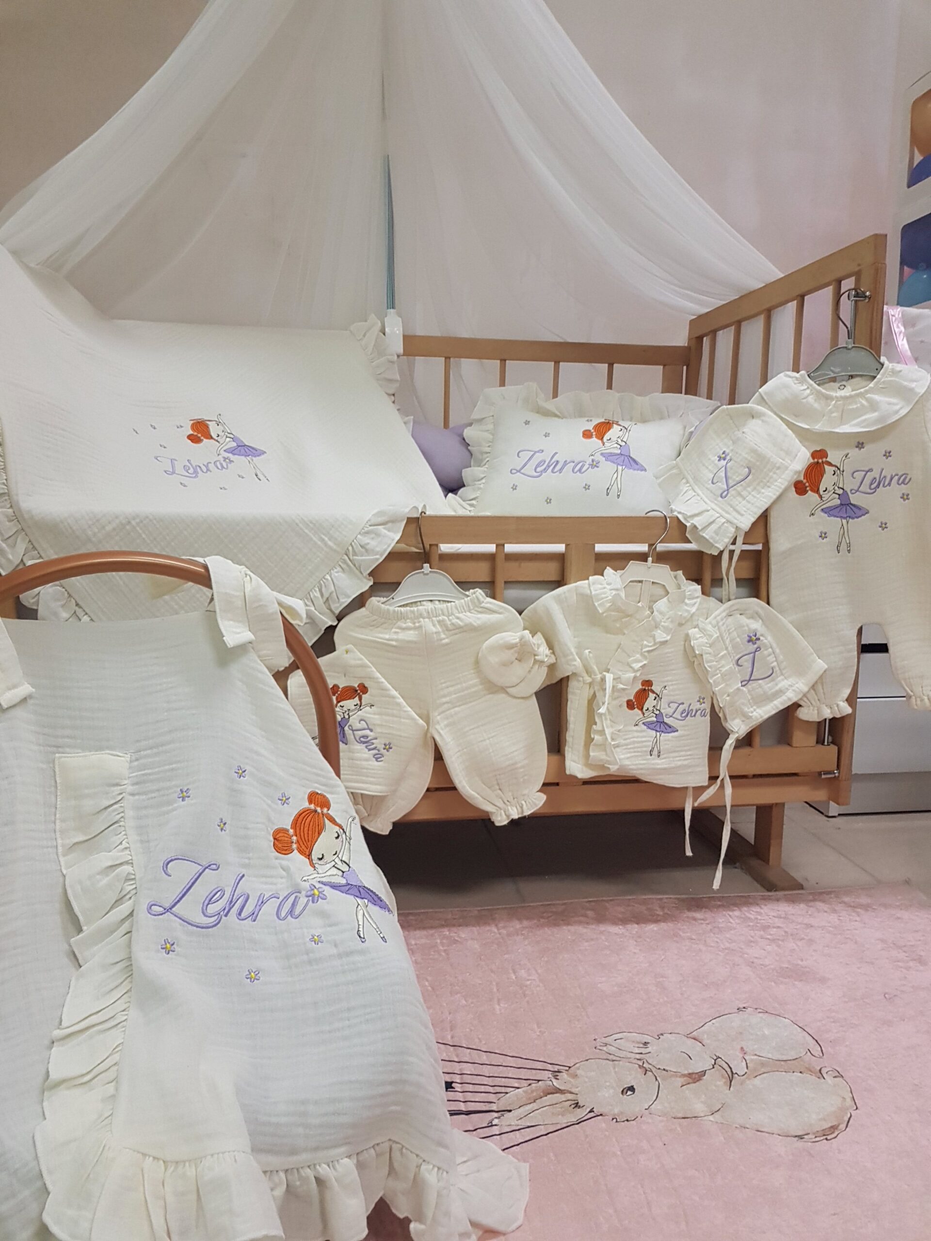 Baby Clime atölyesi olarak, yenidoğan bebeklerin ilk günlerini daha özel kılmak için %100 pamuk, 4 katlı müslin kumaştan üretilen isim nakışlı hastane çıkışı setlerimizi özenle hazırlıyoruz. Yumuşak dokusu ve hafif yapısıyla bebeğinizin hassas cildiyle uyumlu bir kullanım sunar.