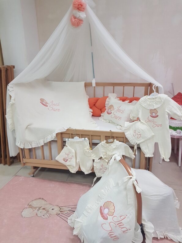 Nakış işlemeli “Deniz Kabuğu” motifli ve isimli bebek uyku seti, farklı beşik modellerine uygun olarak hazırlanabilir. Setin içeriği, tercihinize göre seçilebilecek çeşitli parçaları içermektedir.
