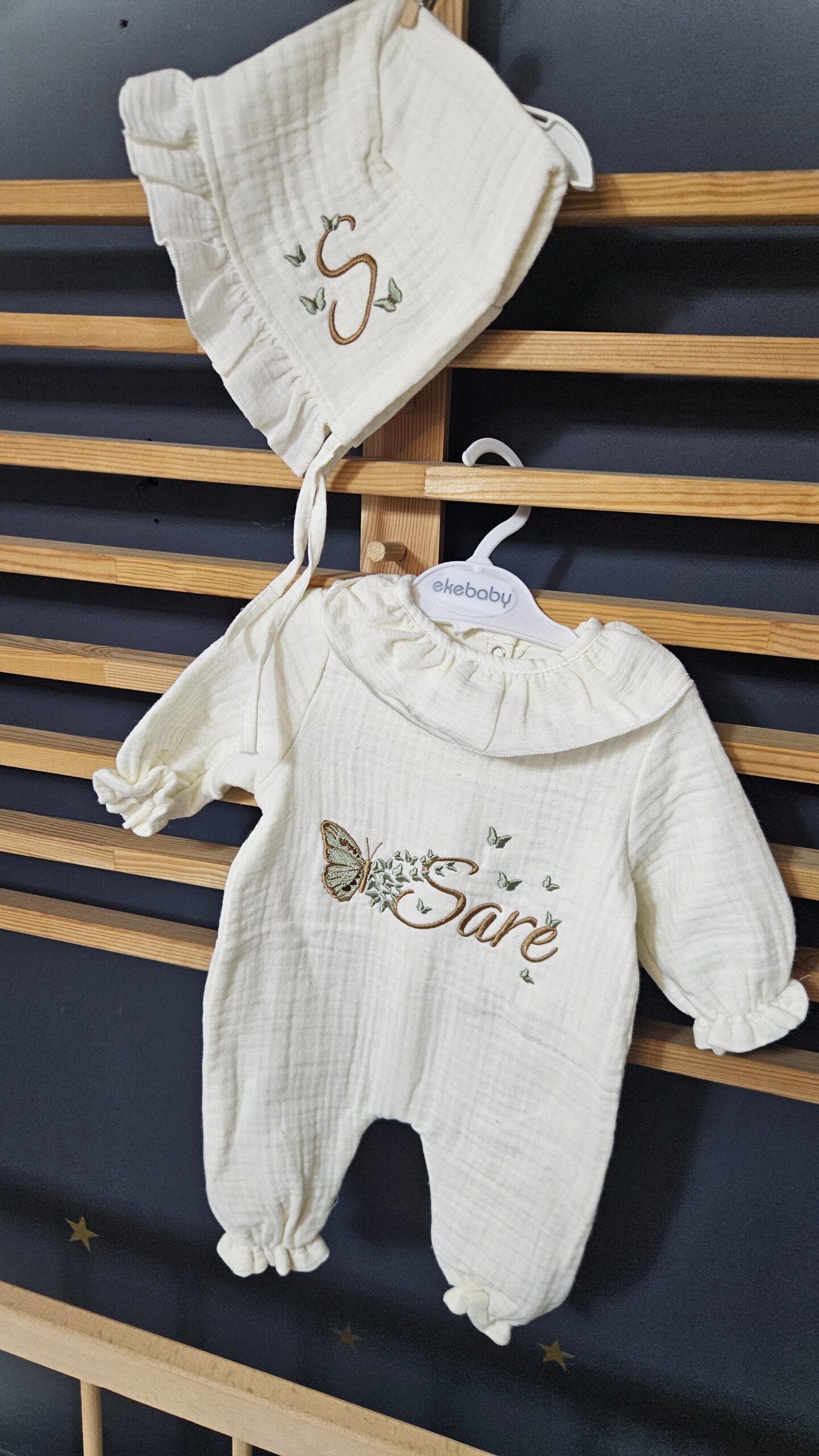 Nakış Detayı: Tulum üzerine bebeğinizin ismi zarif nakışla işlenir. Bu detay, seti özel ve kalıcı bir hatıraya dönüştürür.