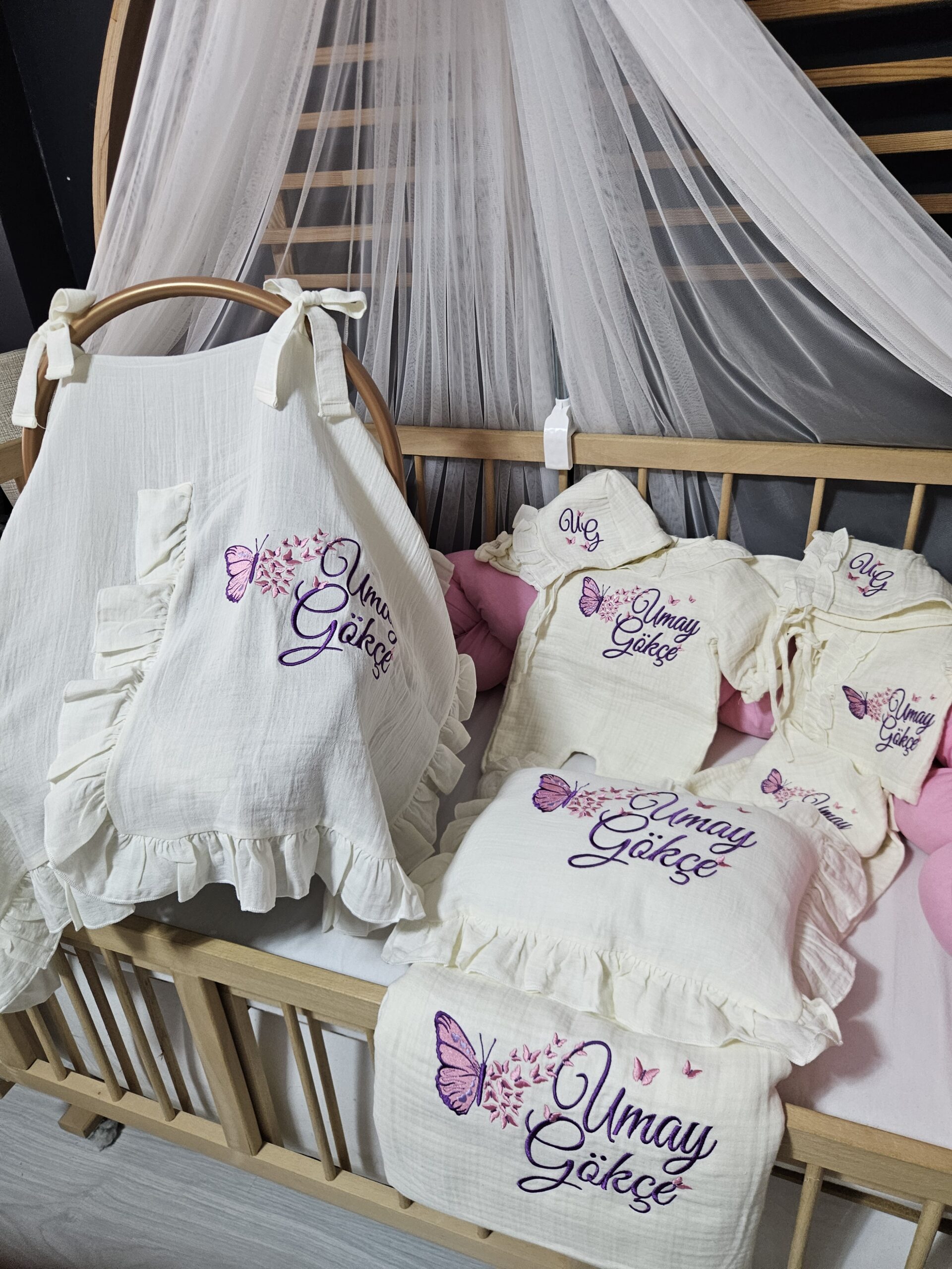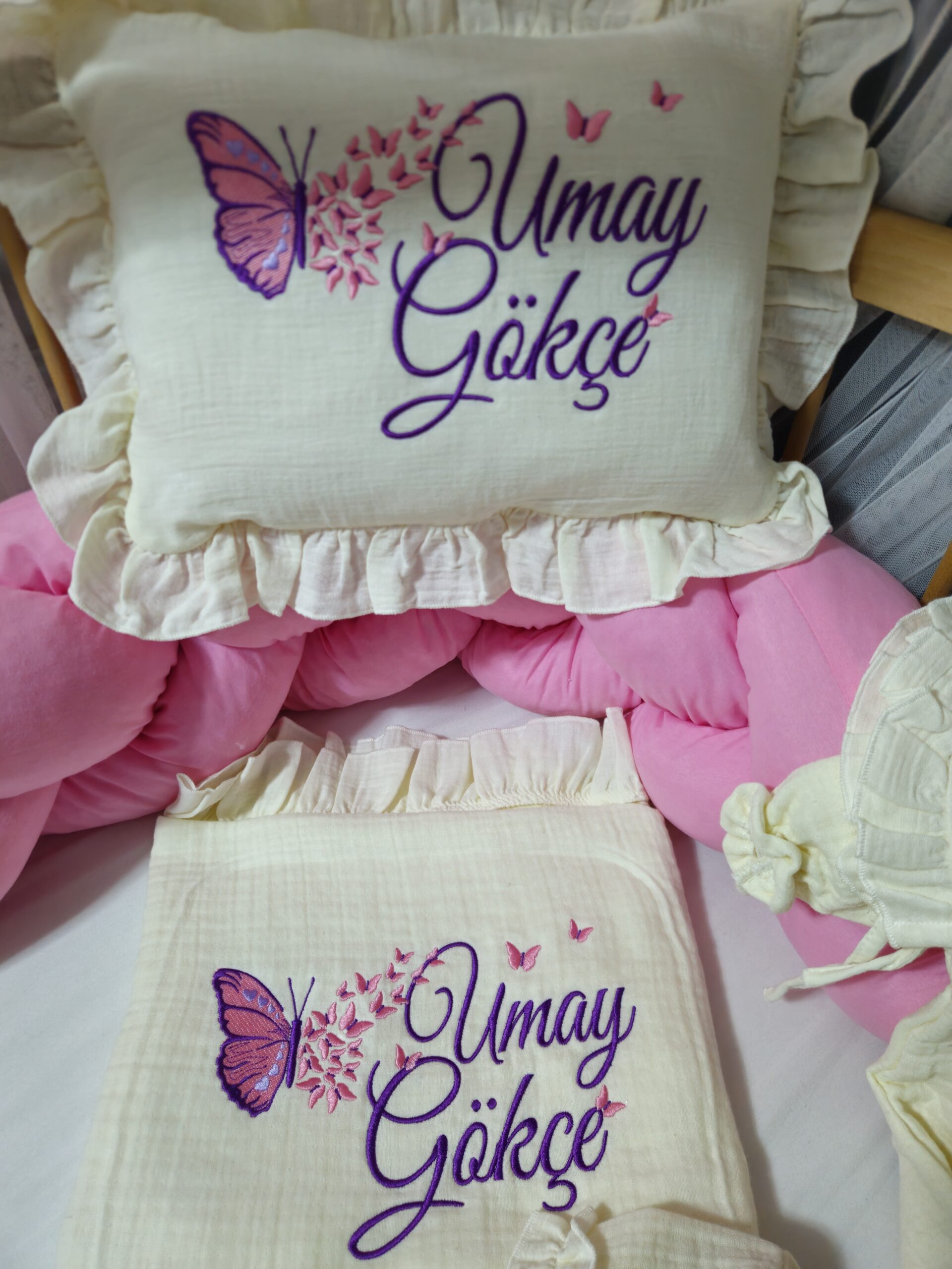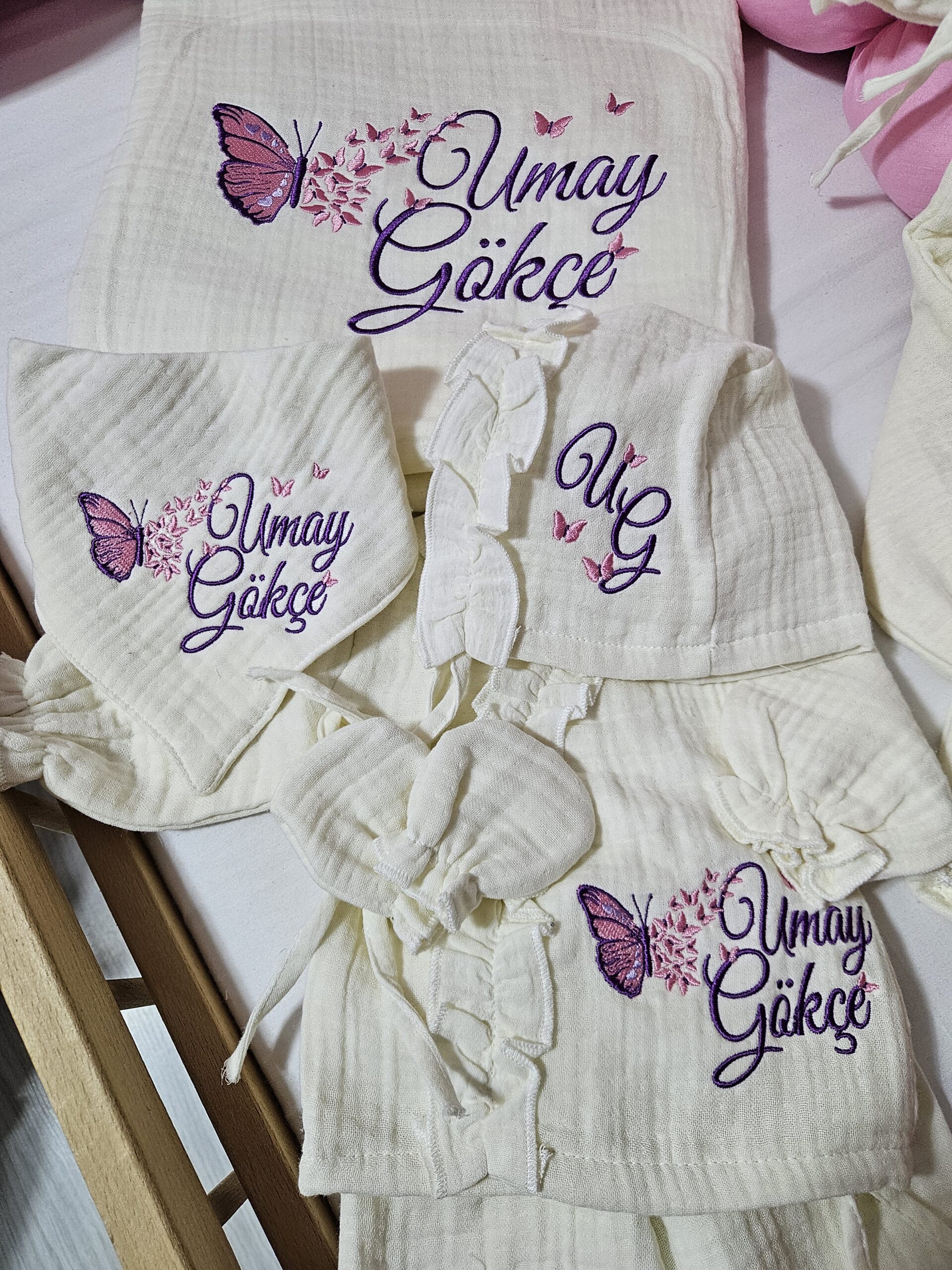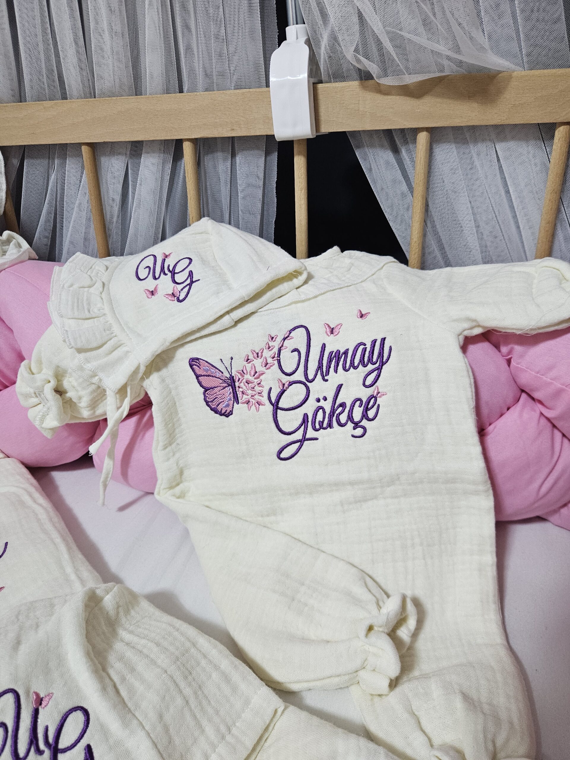 İsimli Kelebek Nakışlı %100 Pamuk 4 Katlı Müslin Yenidoğan Hastane Çıkışı Seti (0-3 Ay)