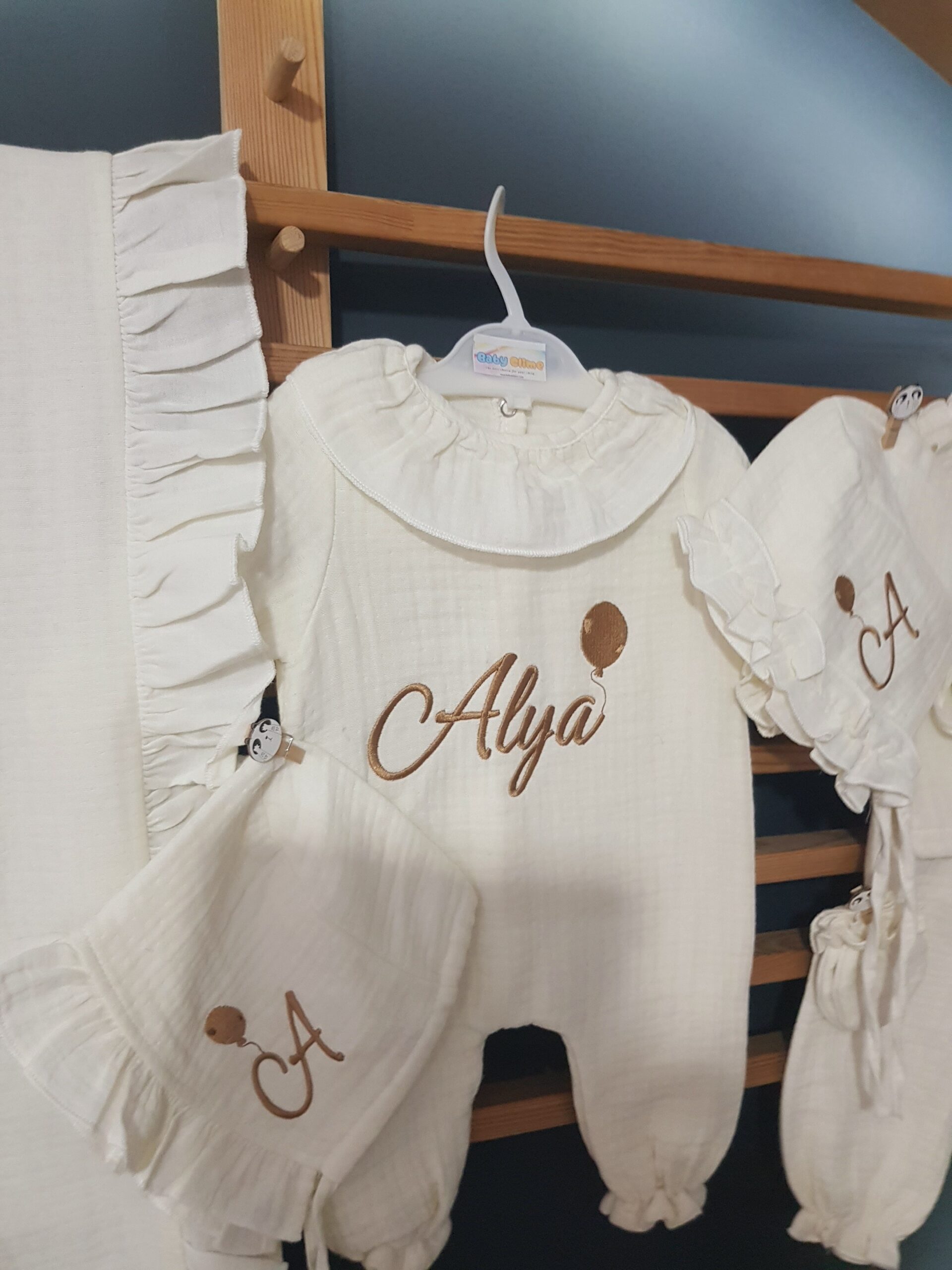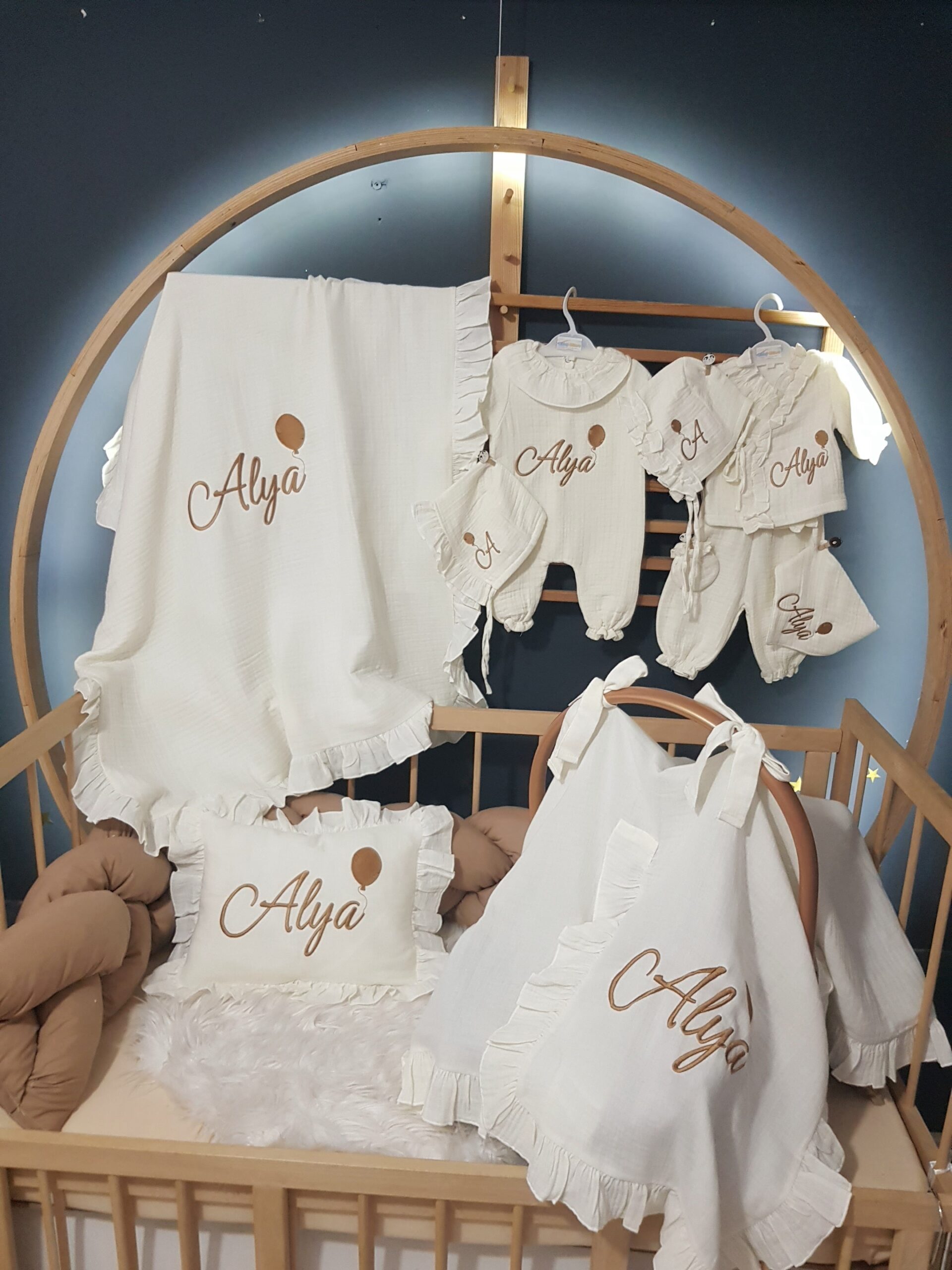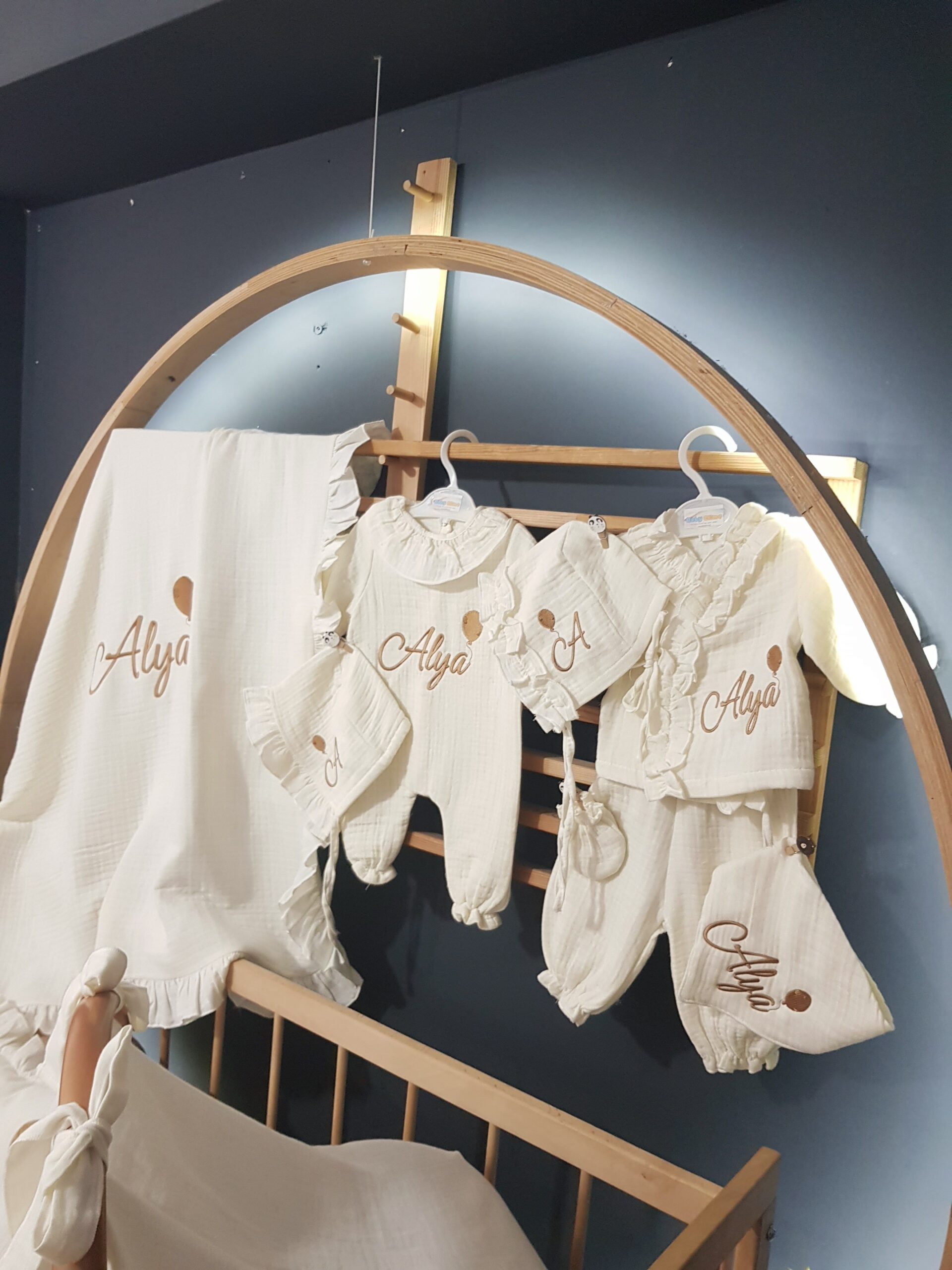 Kişiye özel isim nakışı ile anlamlı bir hatıraya dönüşen müslin hastane çıkışı, günlük kullanım ve özel günler için zarif bir hediye olarak tercih edilebilir.