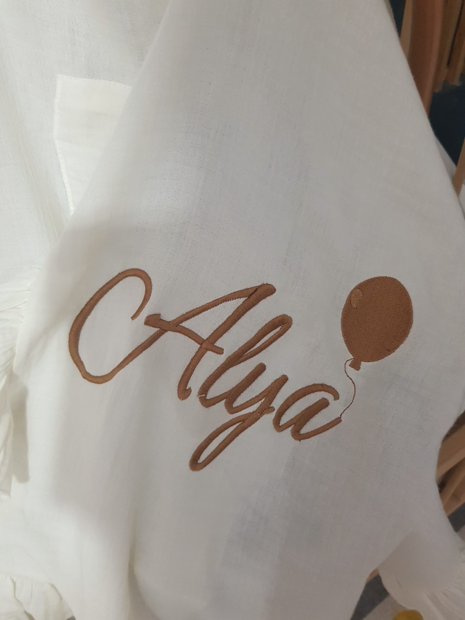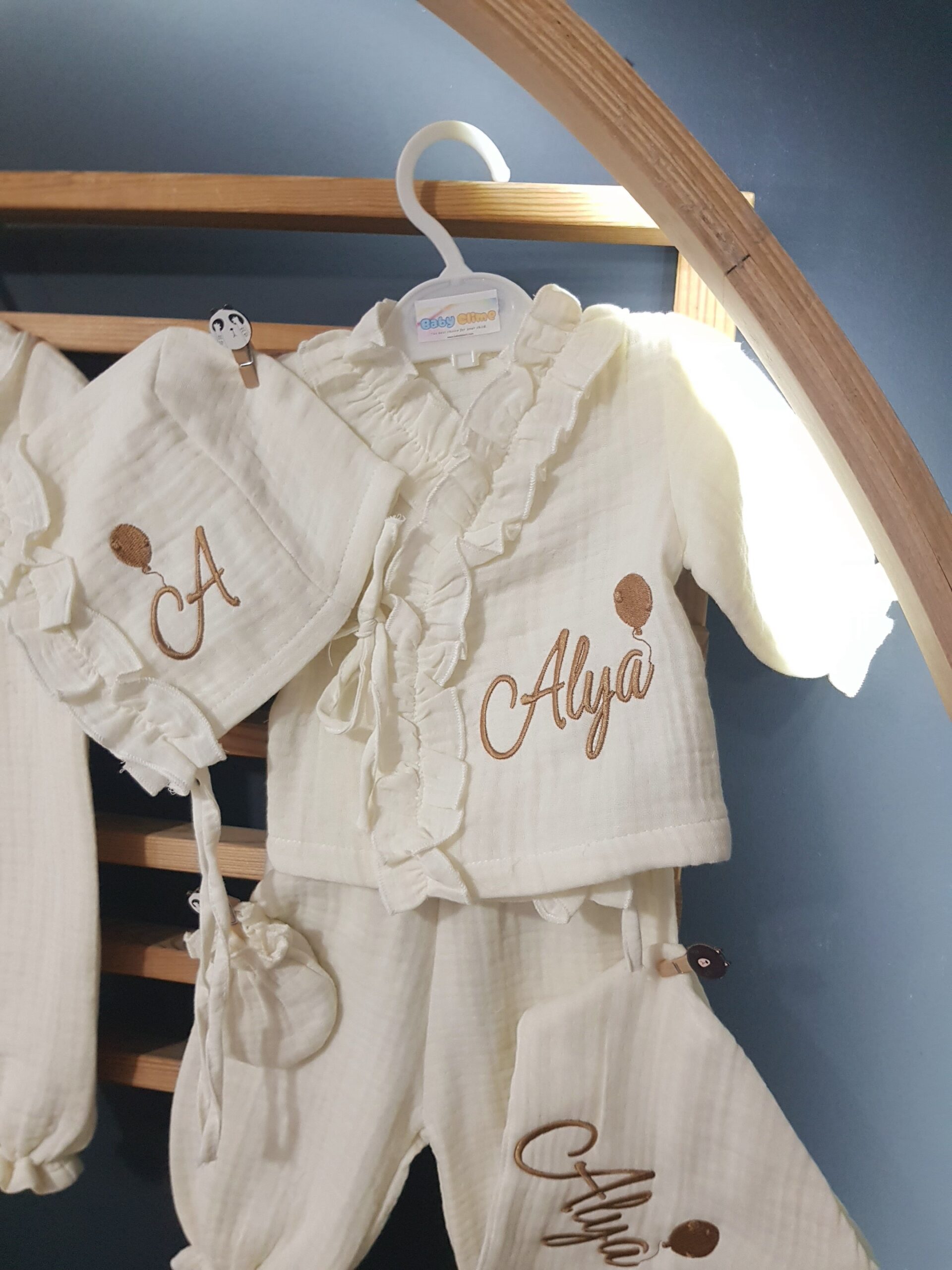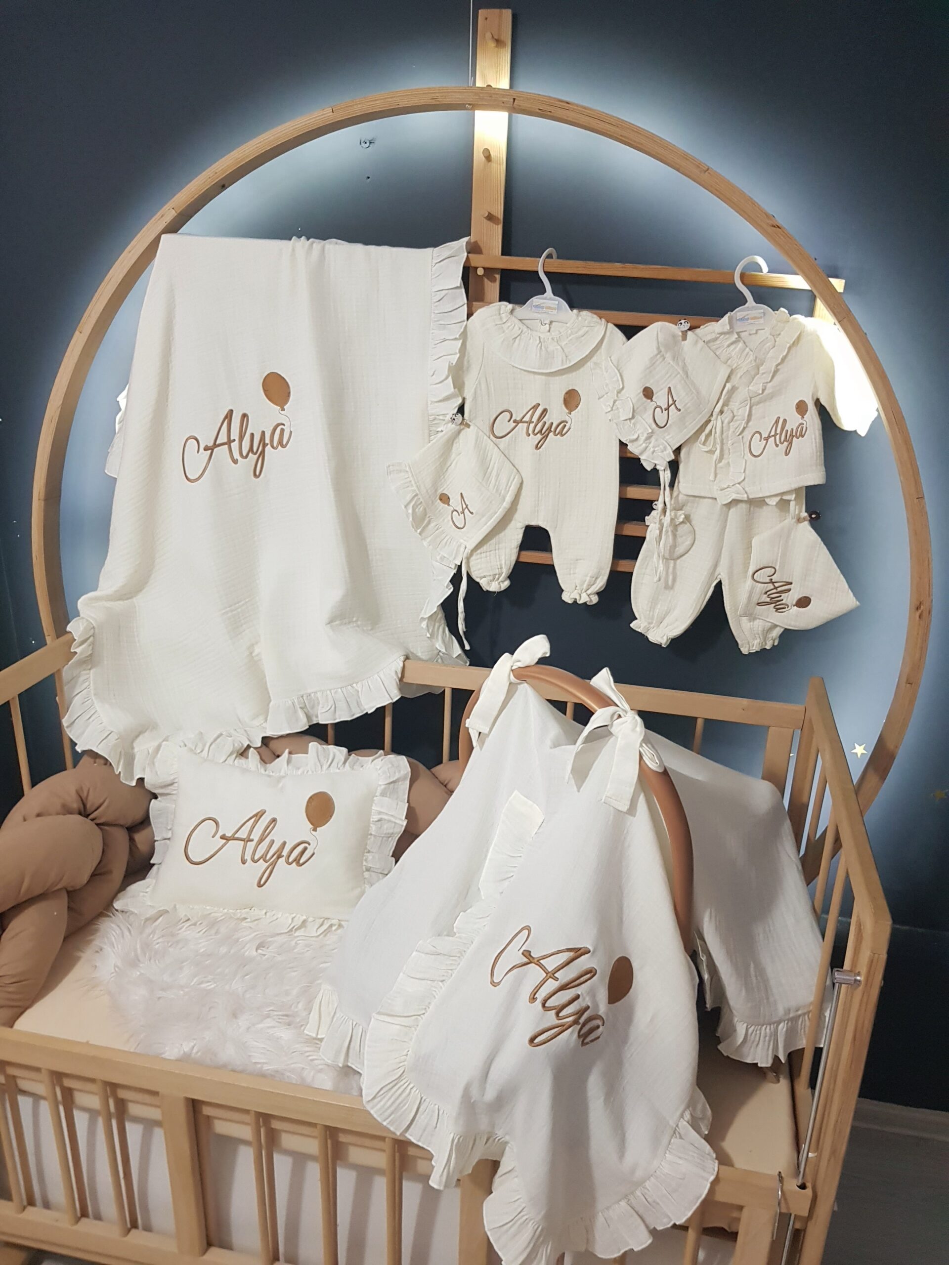 Kişiye özel isim nakışı ile anlamlı bir hatıraya dönüşen müslin hastane çıkışı, günlük kullanım ve özel günler için zarif bir hediye olarak tercih edilebilir.
