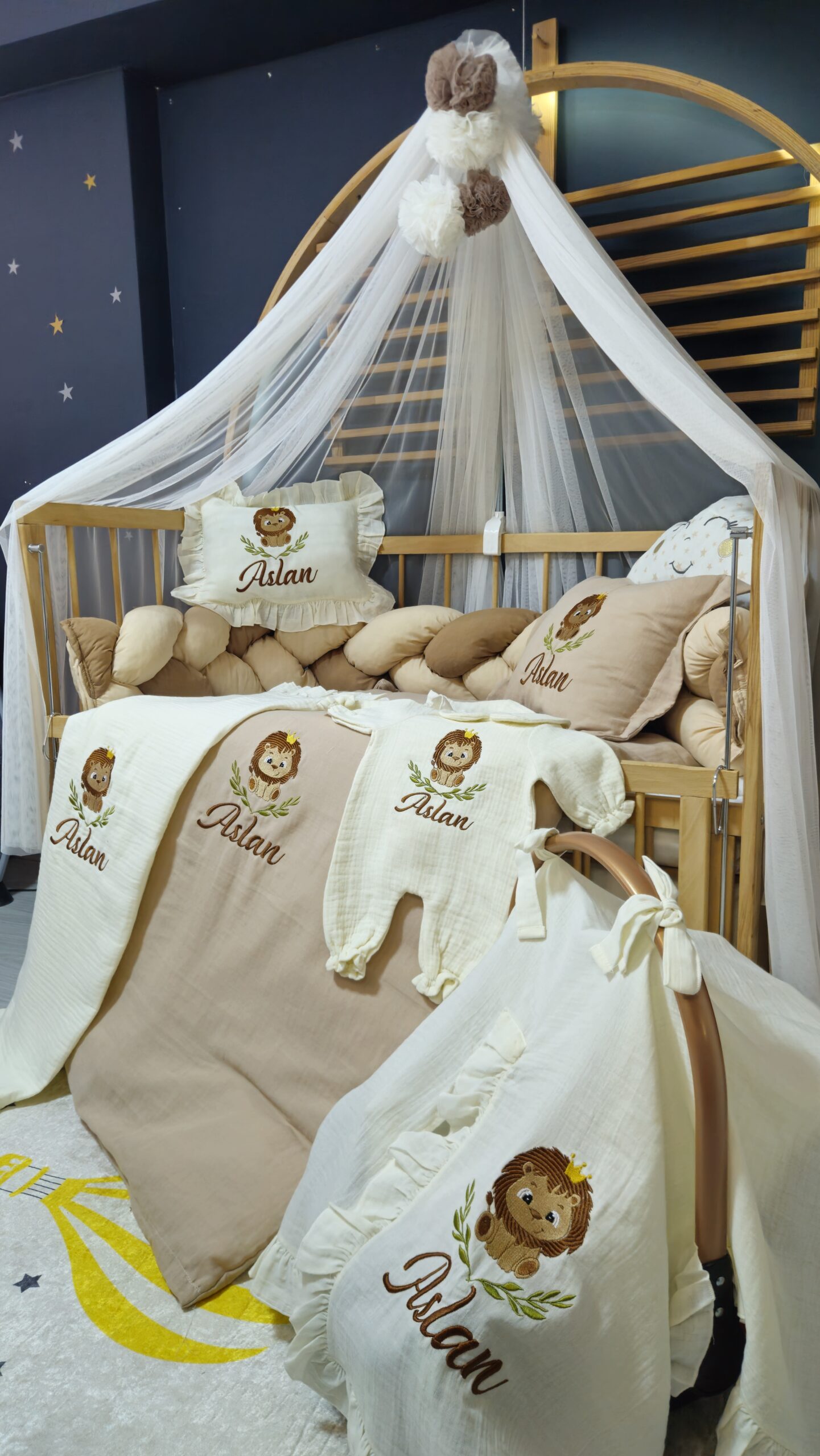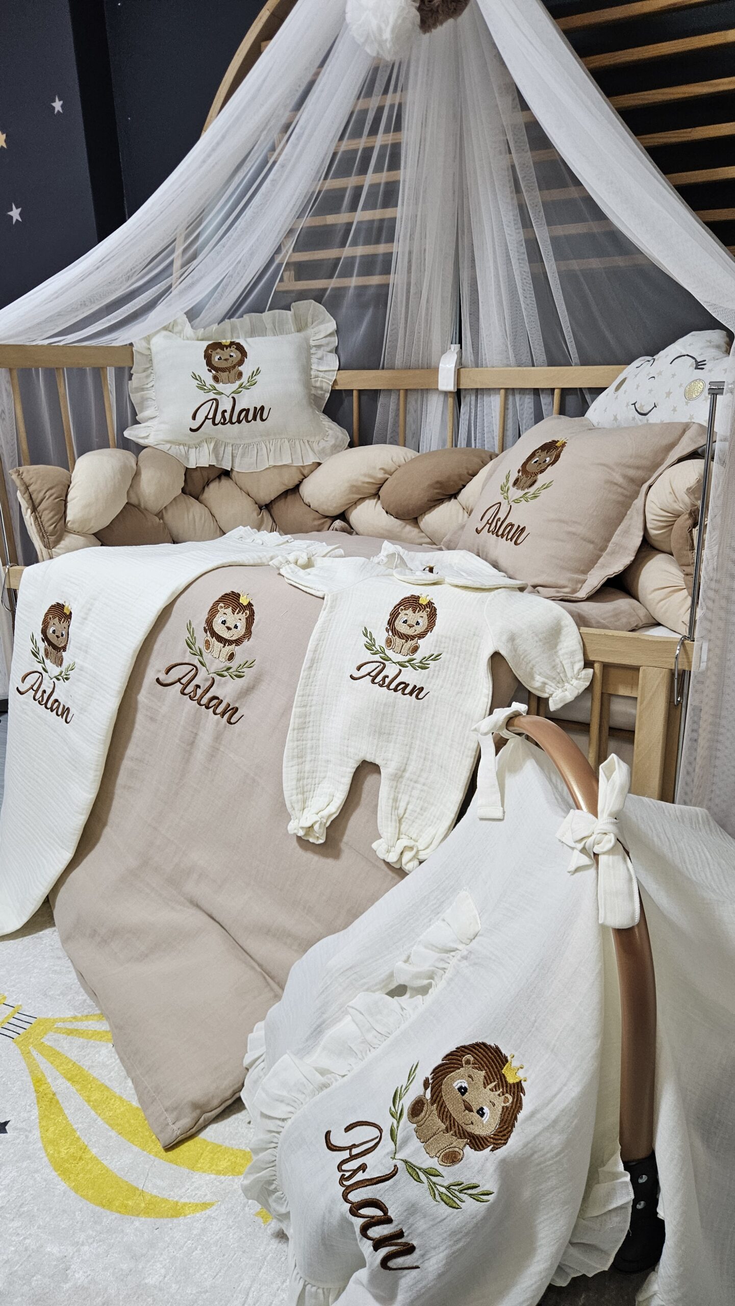Kişiye özel isim nakışı ile anlamlı bir hatıraya dönüşen müslin hastane çıkışı, günlük kullanım ve özel günler için zarif bir hediye olarak tercih edilebilir.