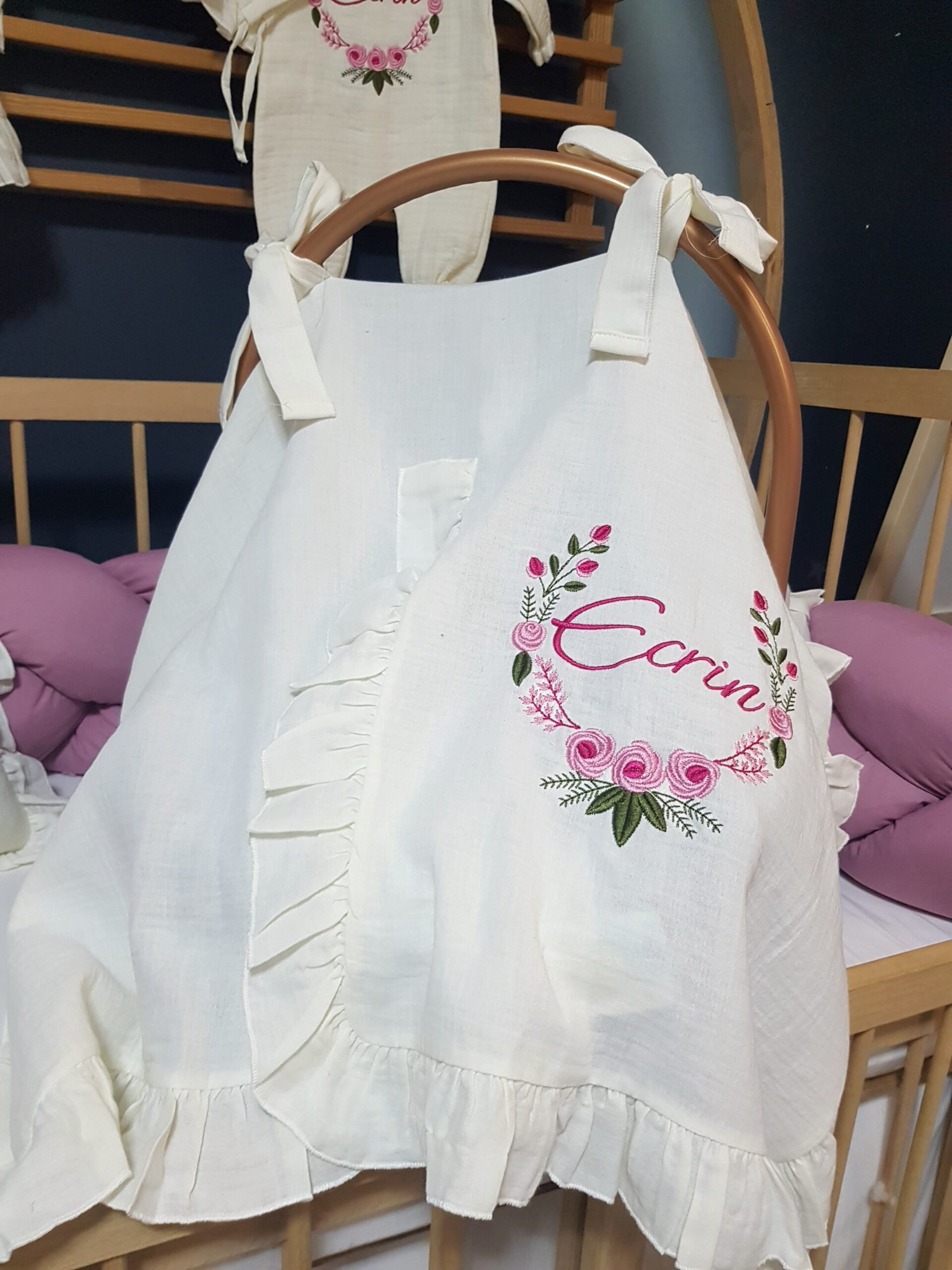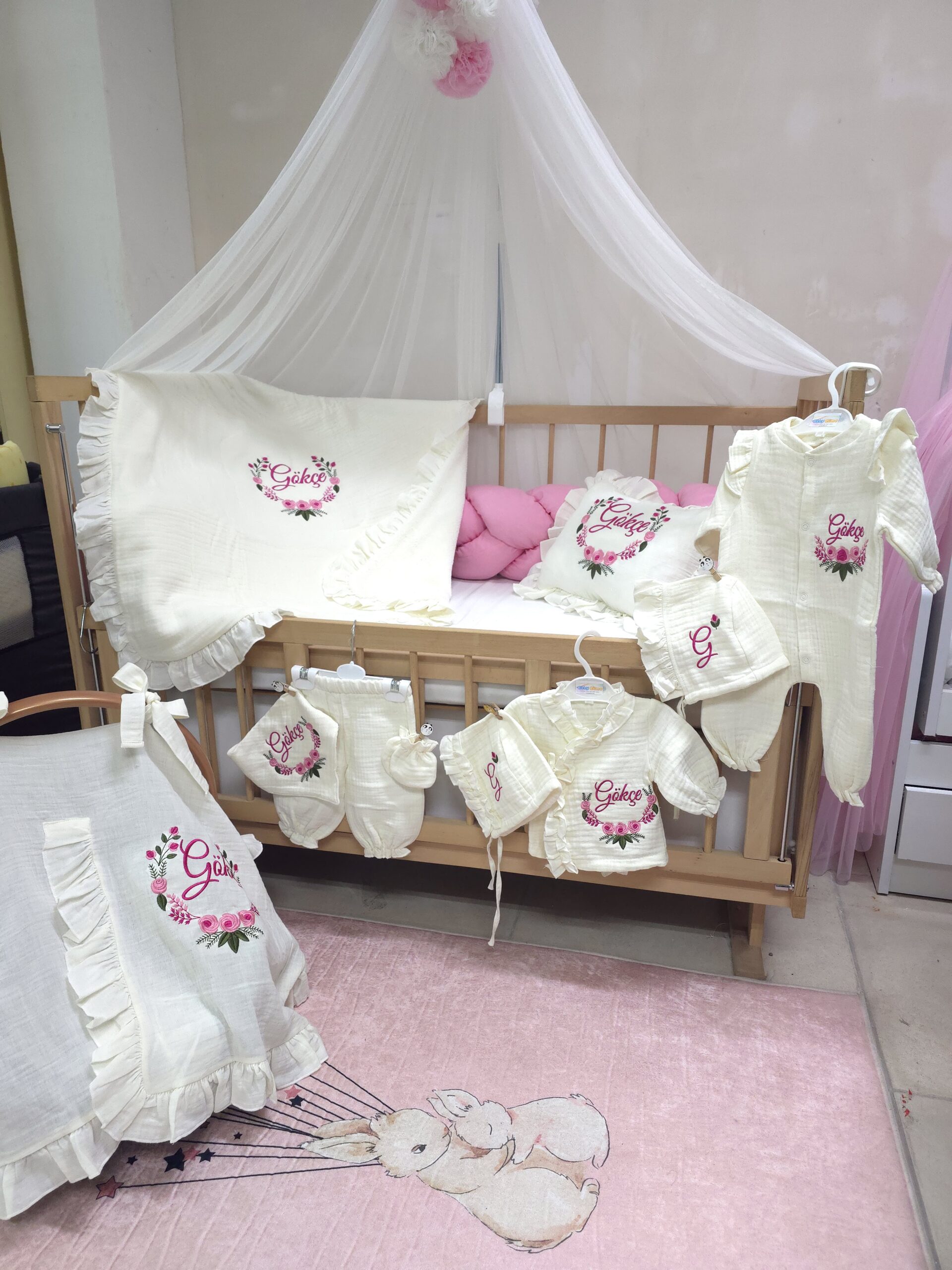 Nakış işlemeli “Çiçek” motifli ve isimli bebek uyku seti, farklı beşik modellerine uygun olarak hazırlanabilir. Setin içeriği, tercihinize göre seçilebilecek çeşitli parçaları içermektedir.