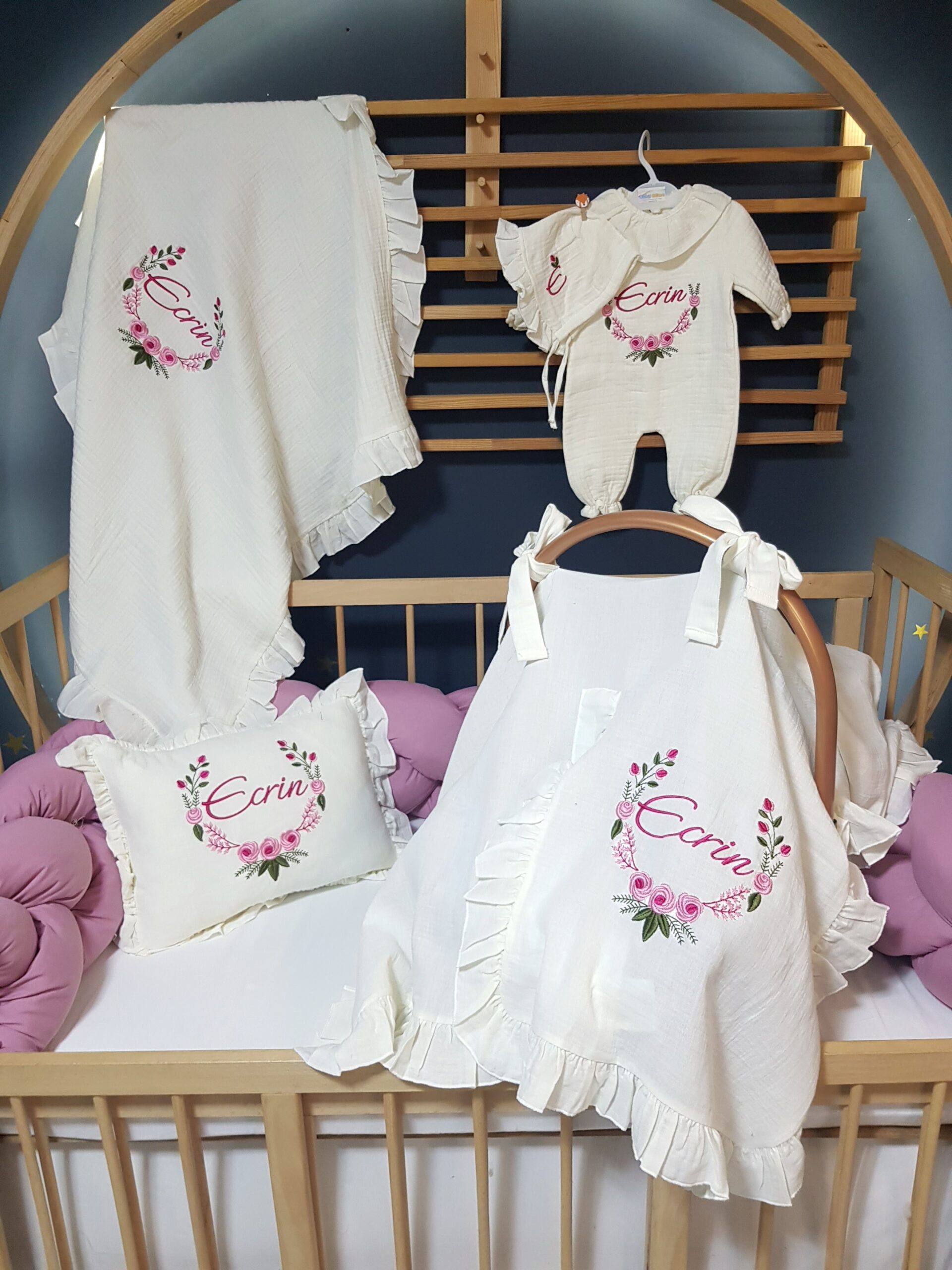 Baby Clime atölyesi olarak, yenidoğan bebeklerin ilk günlerini daha özel kılmak için %100 pamuklu, 4 katlı müslin kumaştan üretilen isim nakışlı hastane çıkışı setlerimizi özenle hazırlıyoruz. Yumuşak dokusu ve hafif yapısıyla bebeğinizin hassas cildiyle uyumlu bir kullanım sunar.