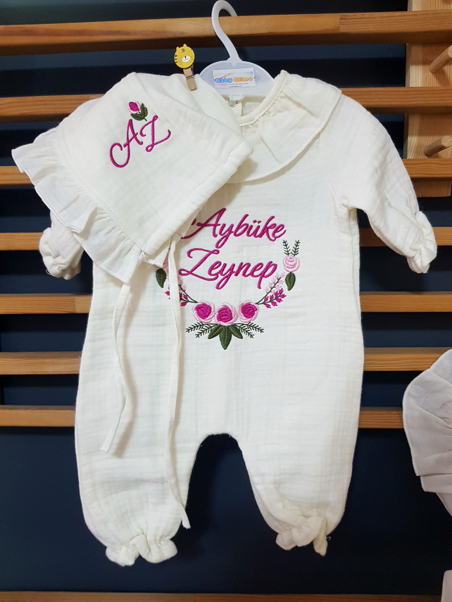 Nakış Detayı: Tulum üzerine bebeğinizin ismi zarif nakışla işlenir. Bu detay, seti özel ve kalıcı bir hatıraya dönüştürür.