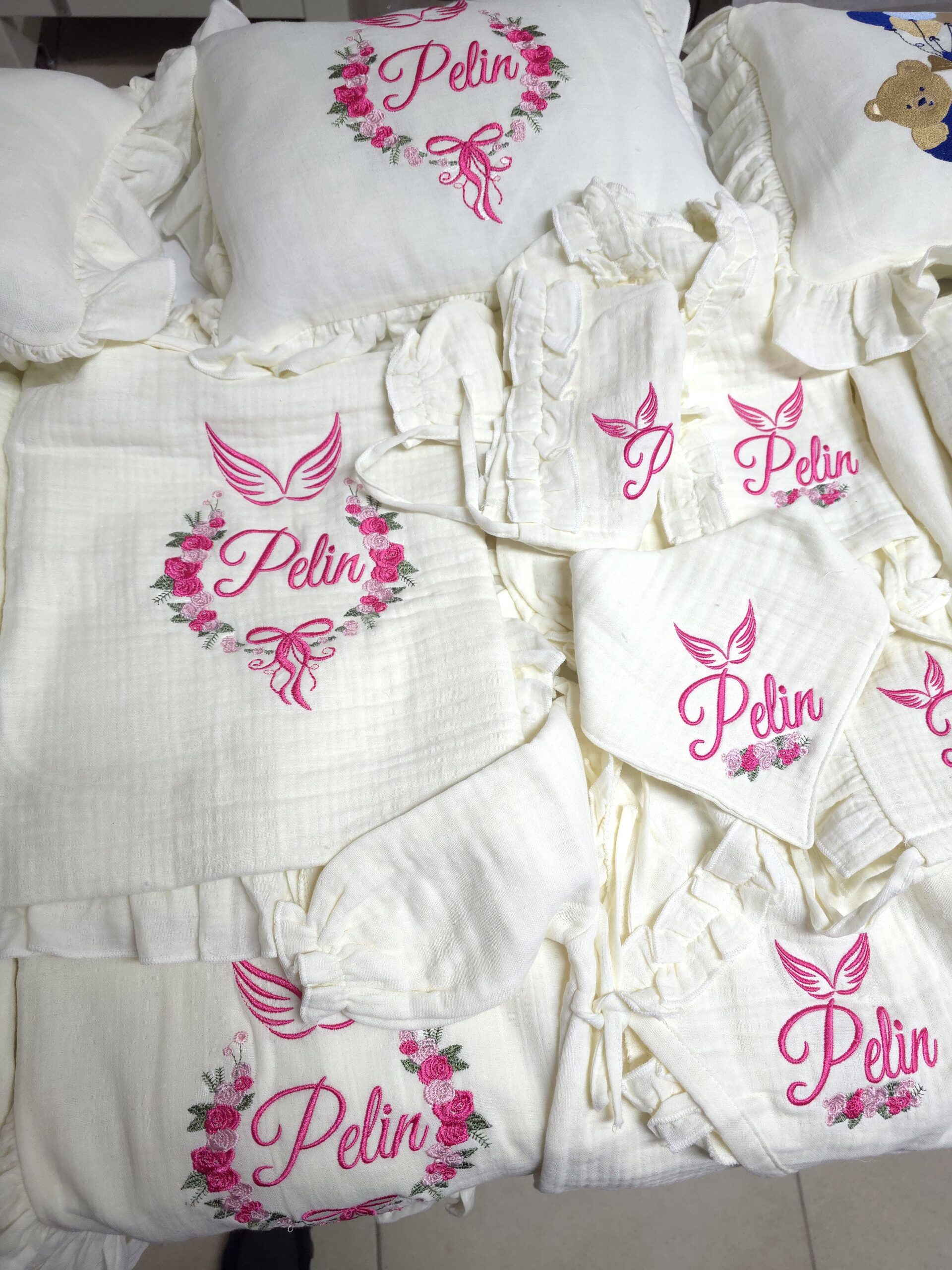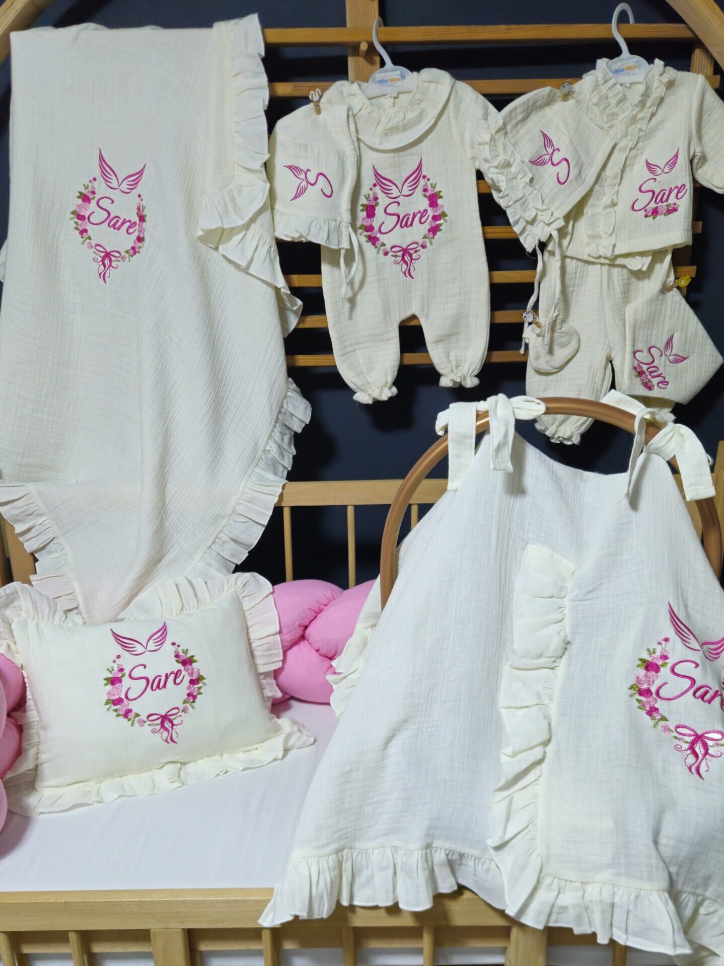 Nakış işlemeli “Gül Sepeti” motifli ve isimli bebek uyku seti, farklı beşik modellerine uygun olarak hazırlanabilir. Setin içeriği, tercihinize göre seçilebilecek çeşitli parçaları içermektedir.