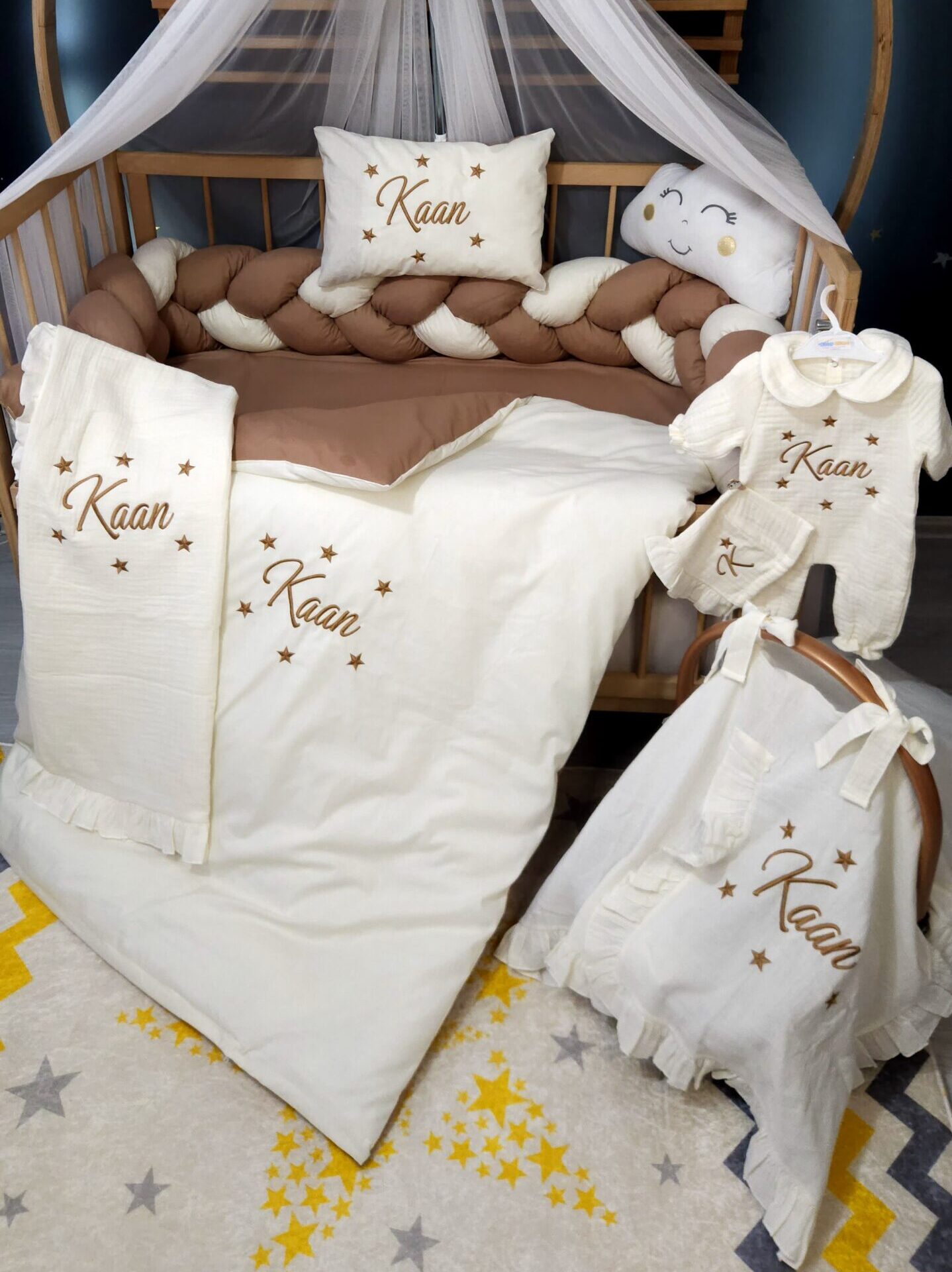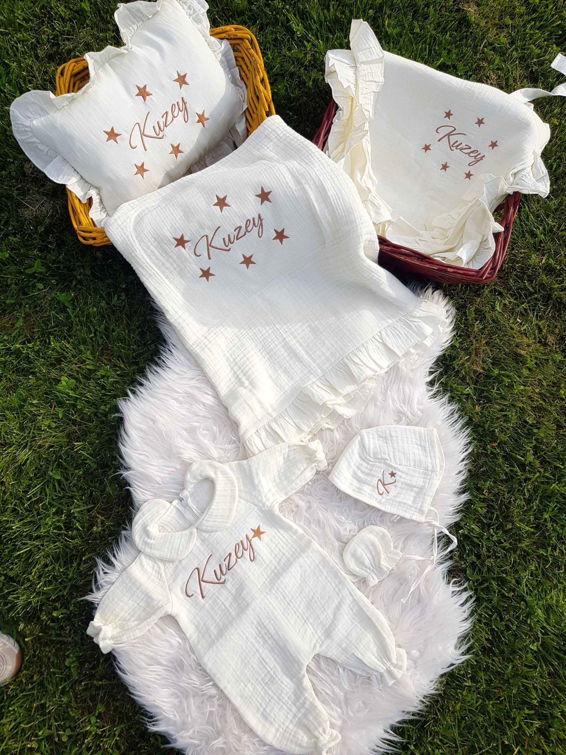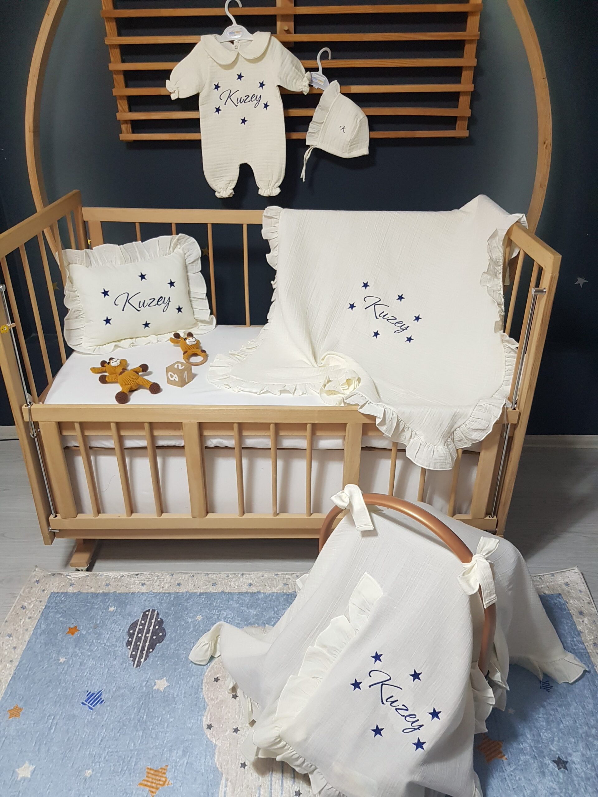 Kişiye özel isim nakışı ile anlamlı bir hatıraya dönüşen müslin hastane çıkışı, günlük kullanım ve özel günler için zarif bir hediye olarak tercih edilebilir.