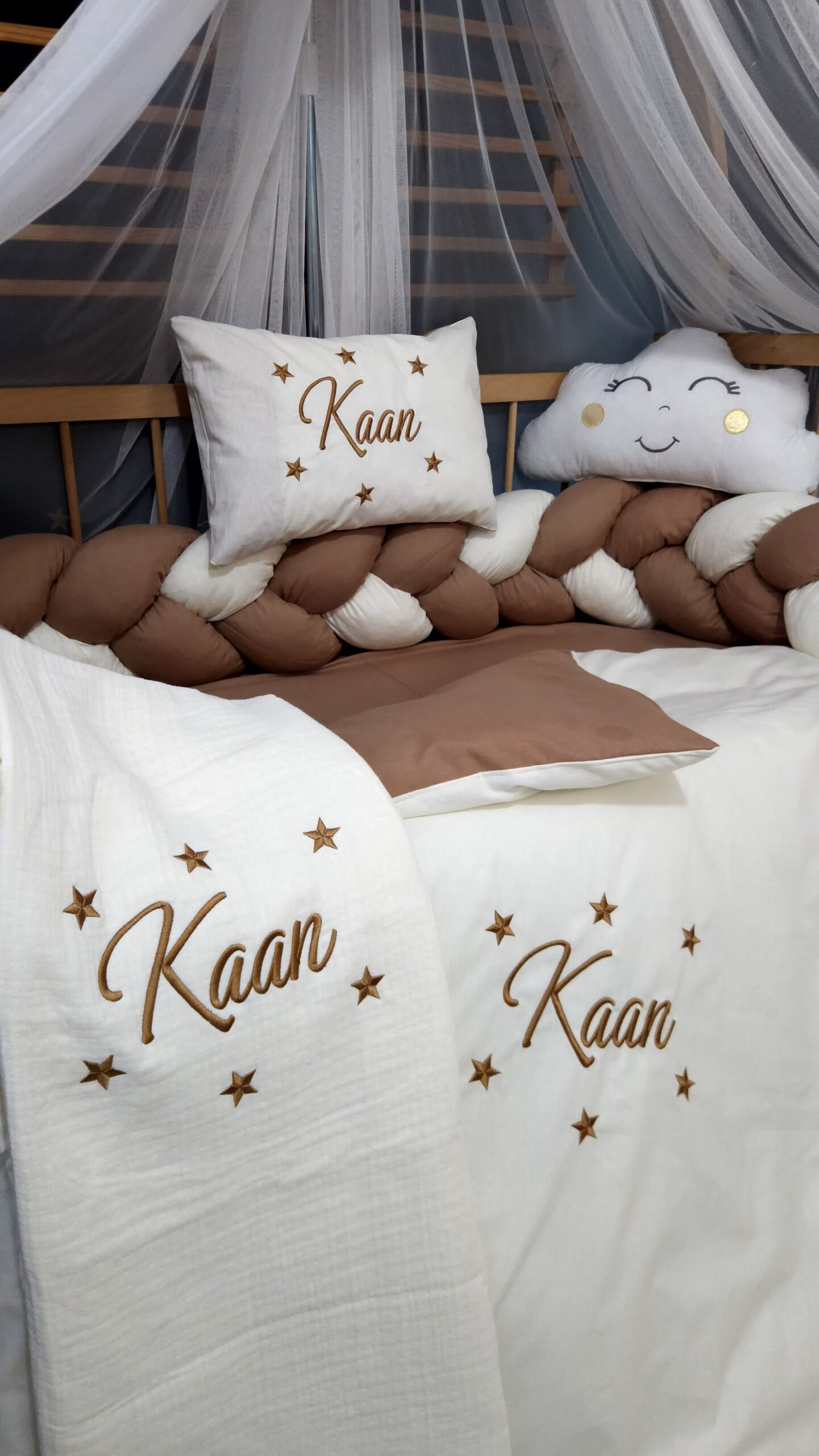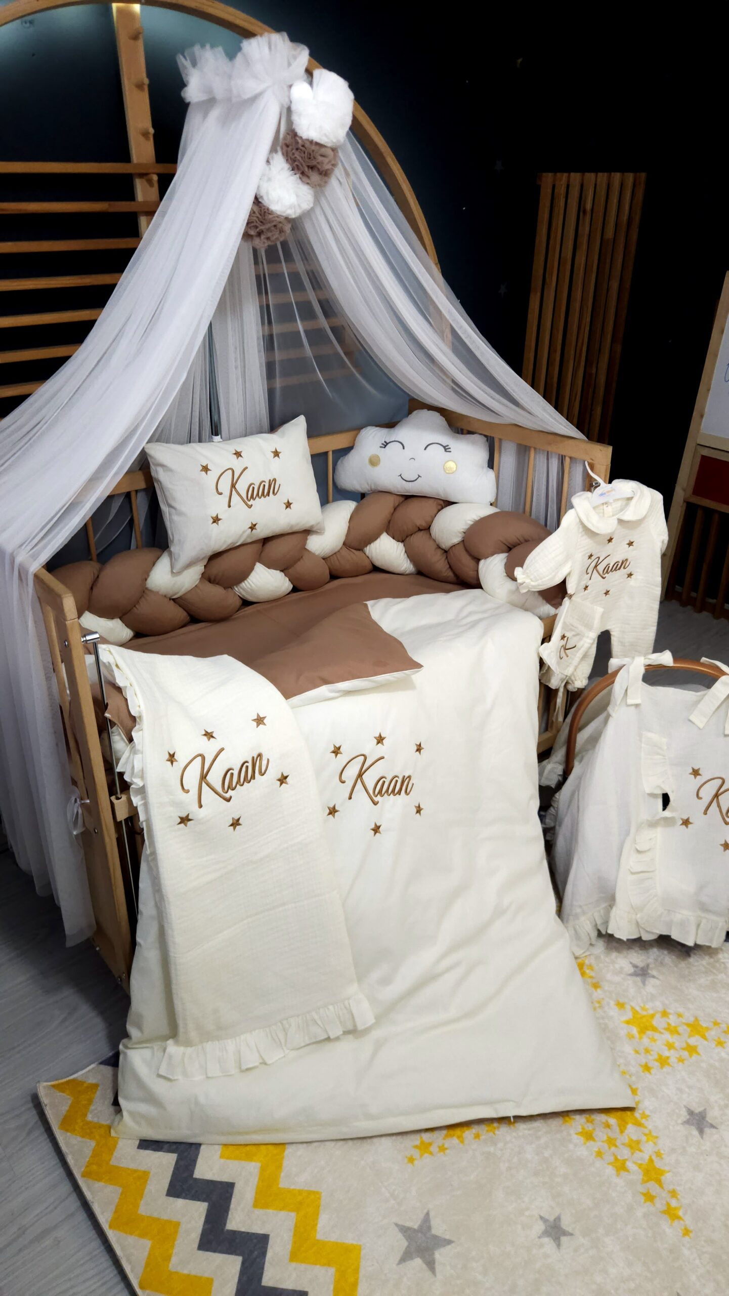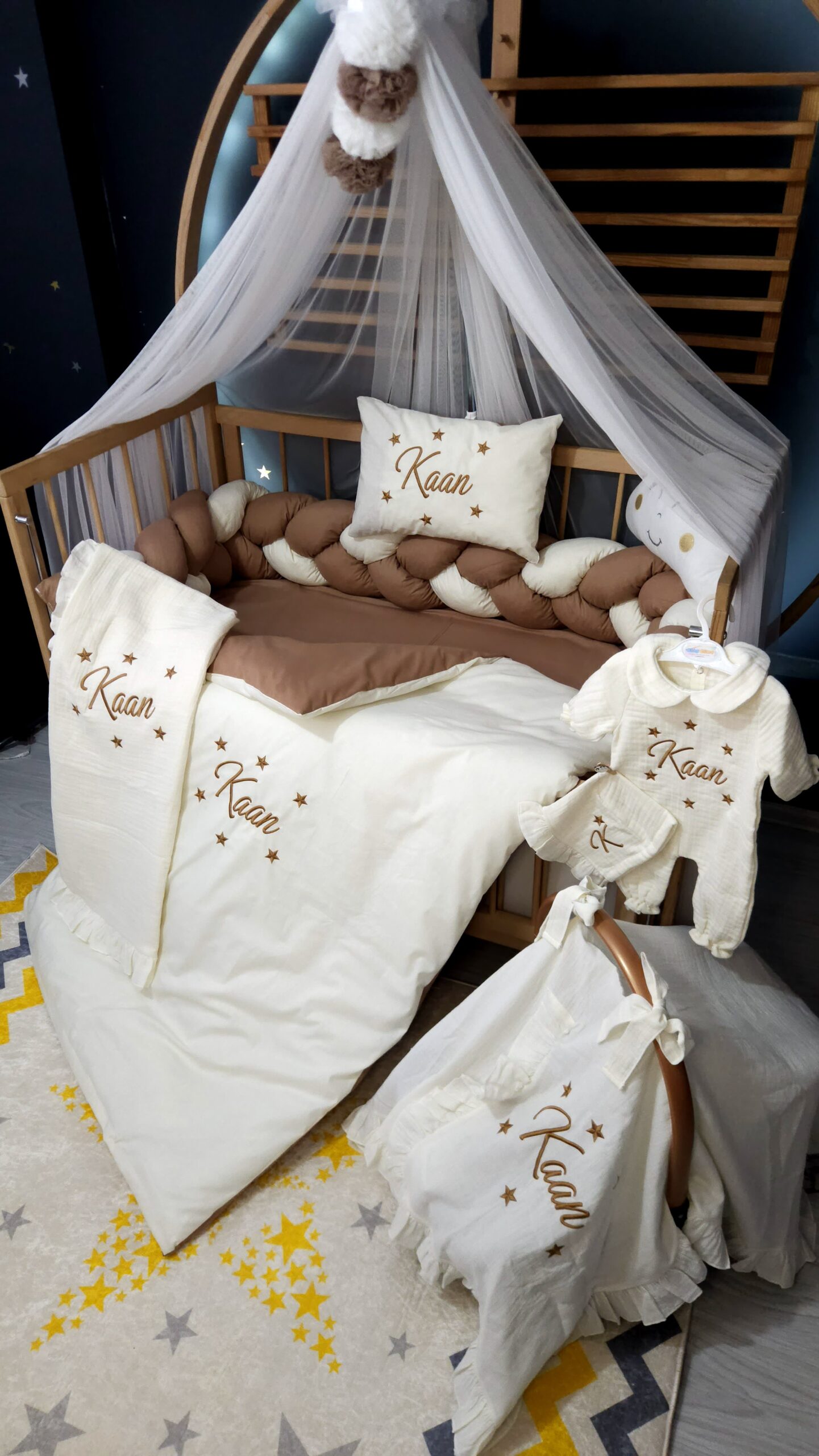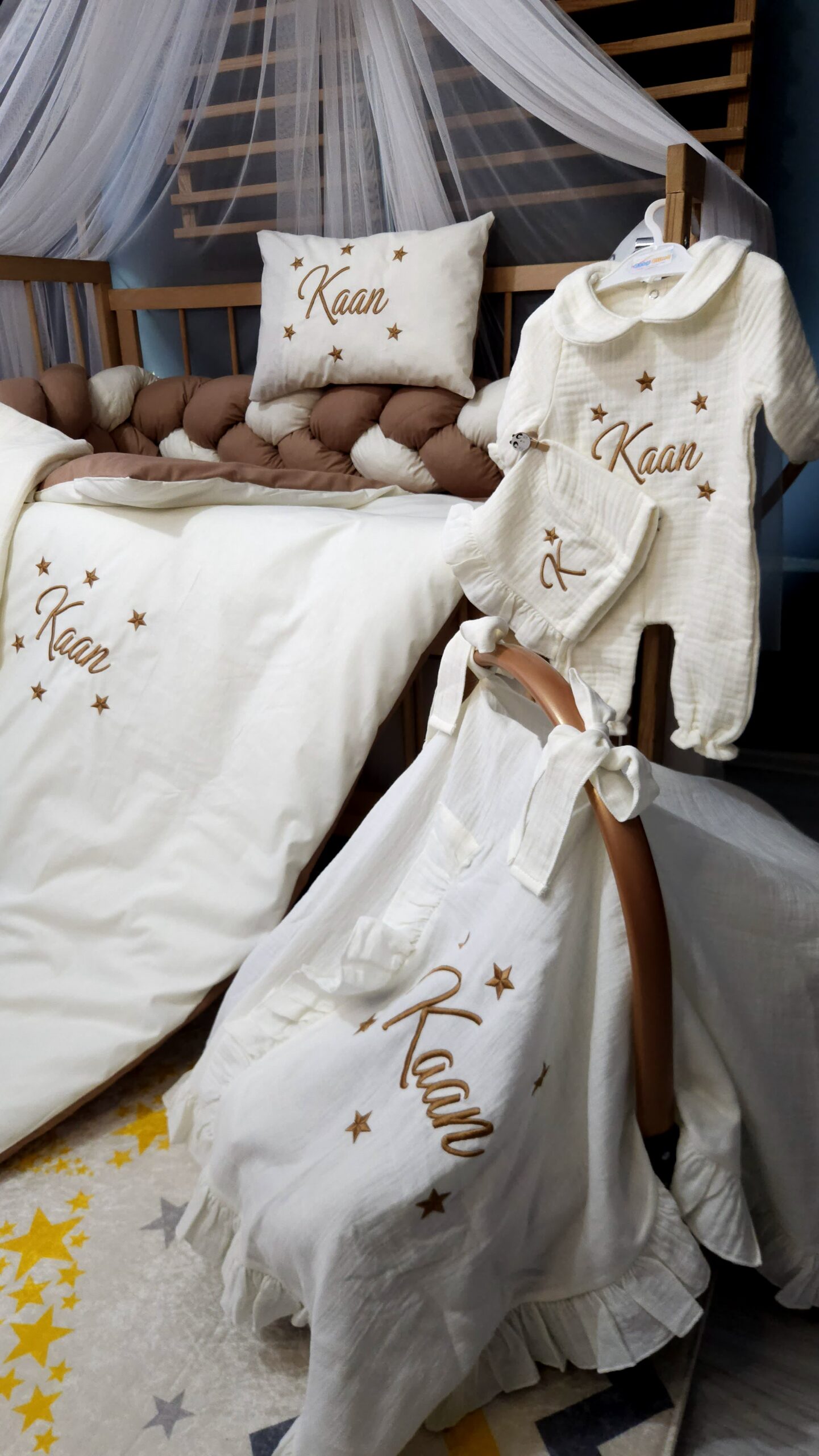 Kişiye özel isim nakışı ile anlamlı bir hatıraya dönüşen müslin hastane çıkışı, günlük kullanım ve özel günler için zarif bir hediye olarak tercih edilebilir.