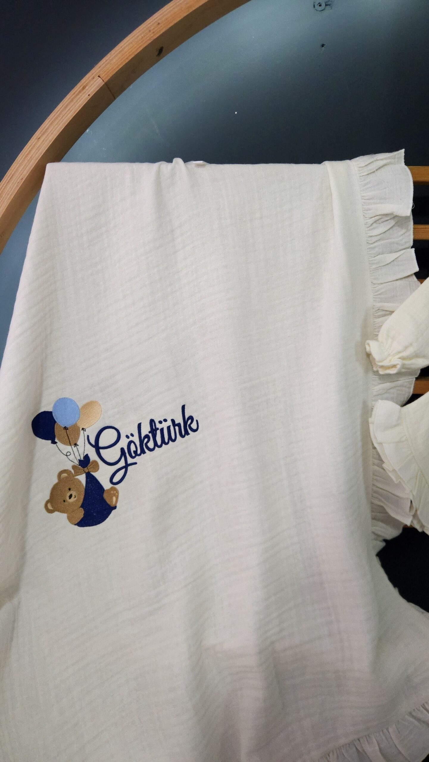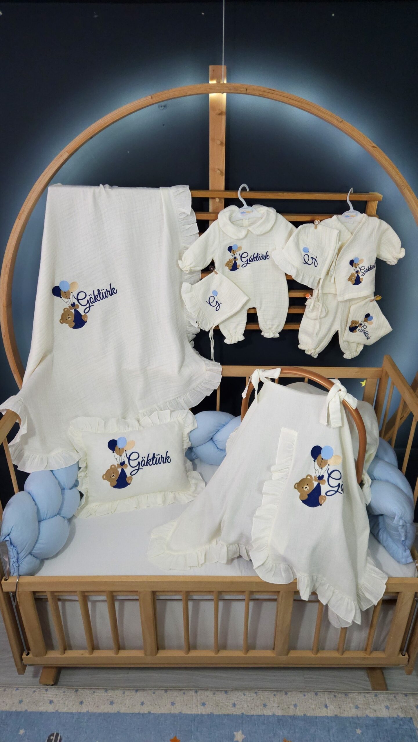 Nakış işlemeli “Ayda Oturan Ayıcık” motifli bebek uyku seti, farklı beşik modellerine uygun olarak hazırlanabilir. Setin içeriği, tercihinize göre seçilebilecek çeşitli parçaları içermektedir.