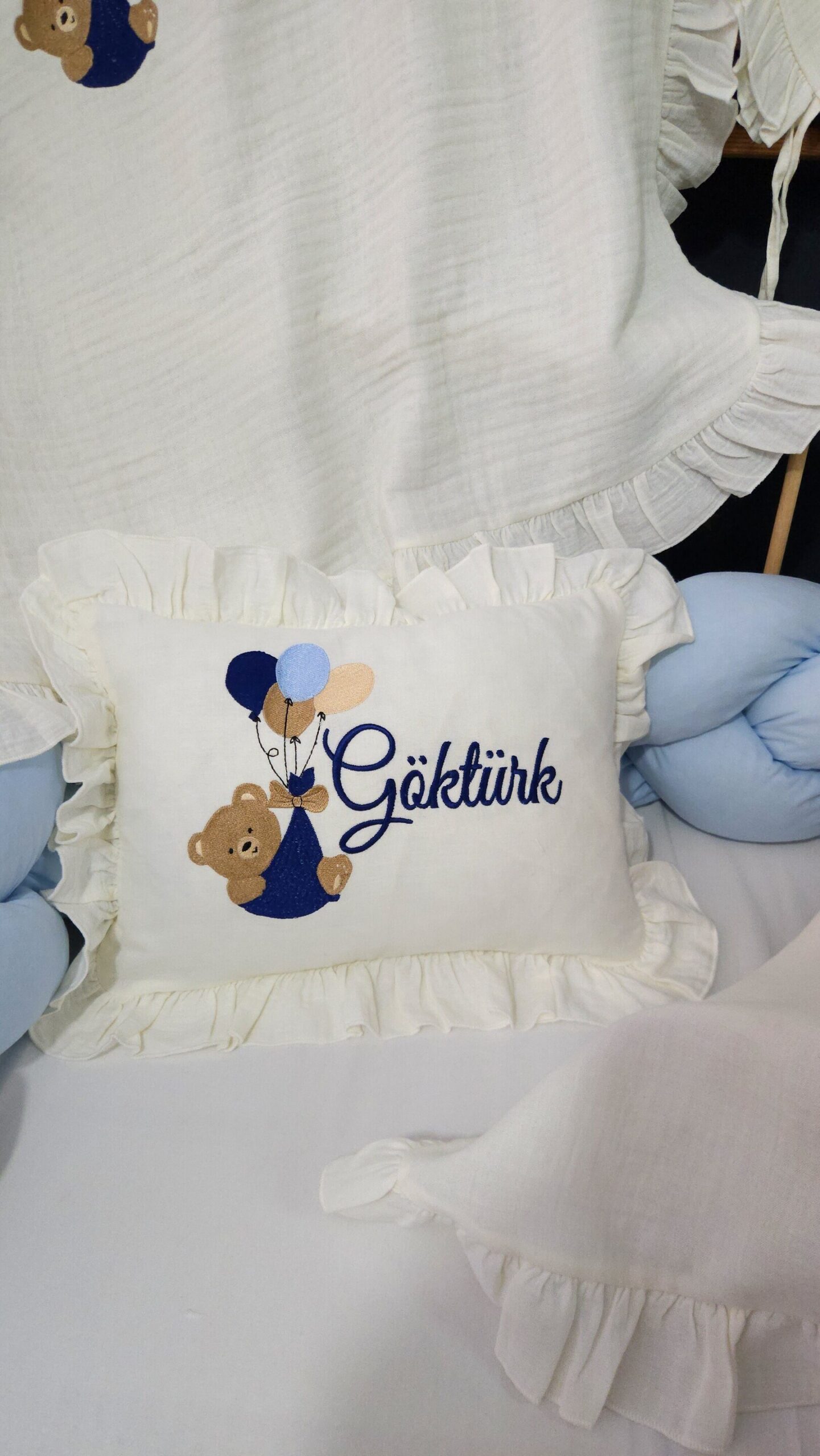 Nakış işlemeli “Uçan Ayıcık” motifli bebek uyku seti, farklı beşik modellerine uygun olarak hazırlanabilir. Setin içeriği, tercihinize göre seçilebilecek çeşitli parçaları içermektedir.