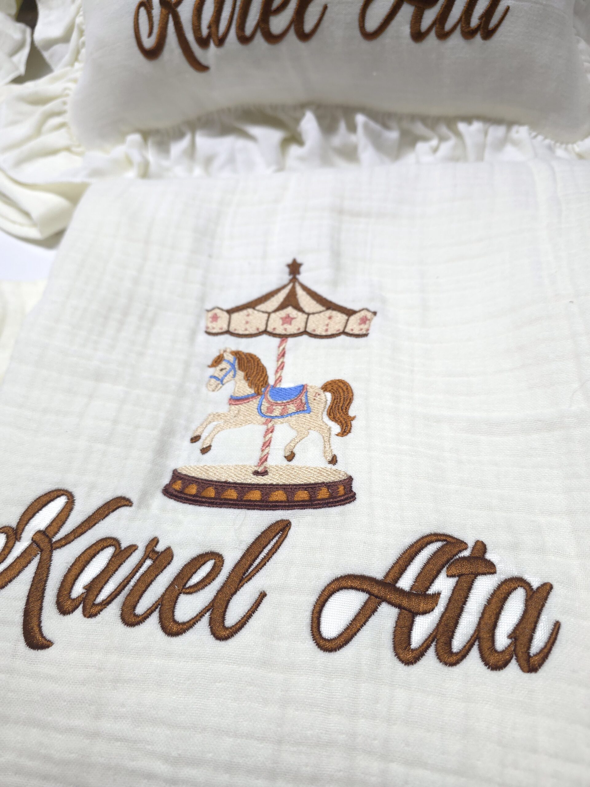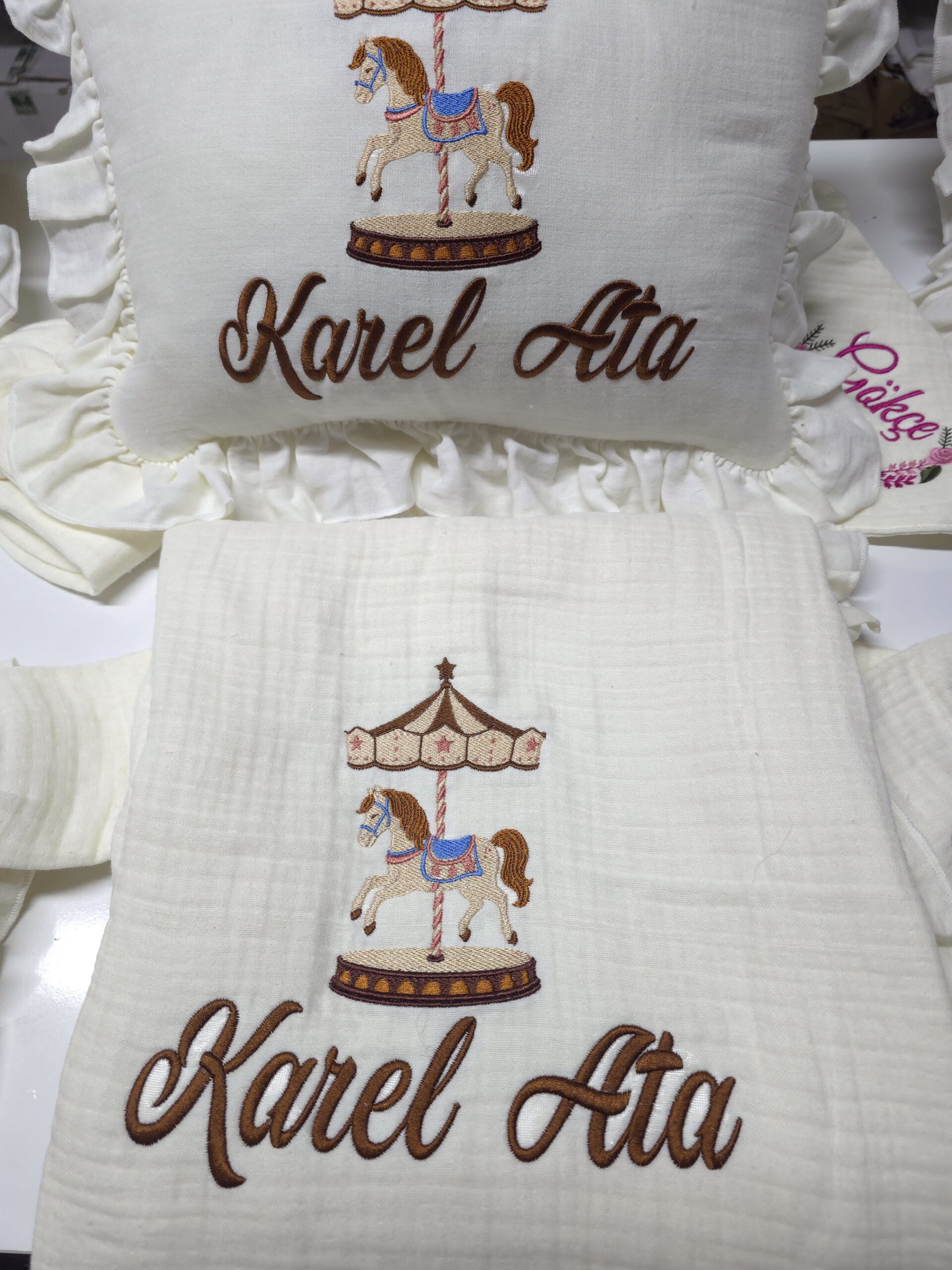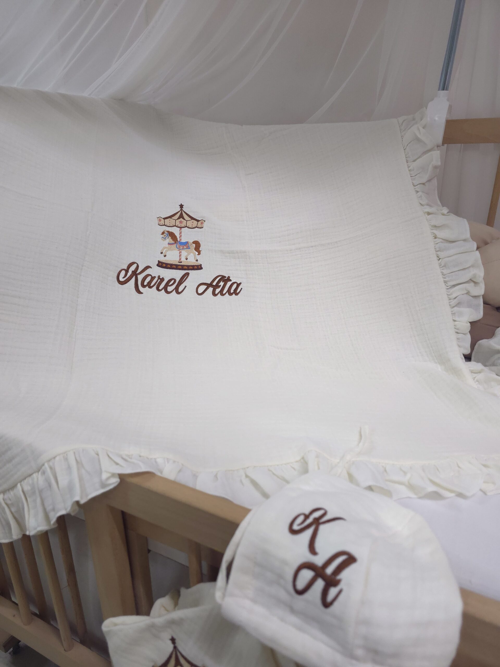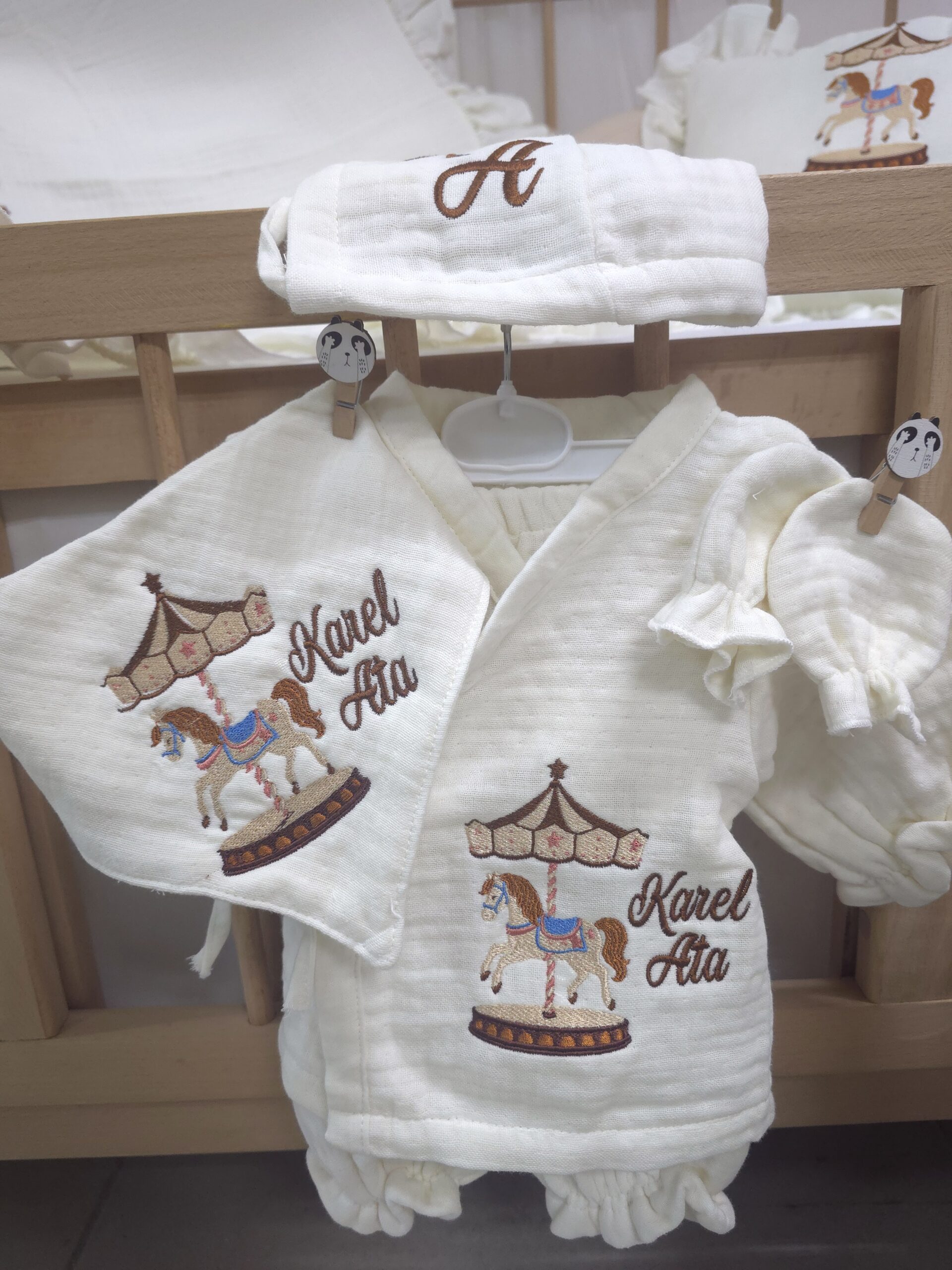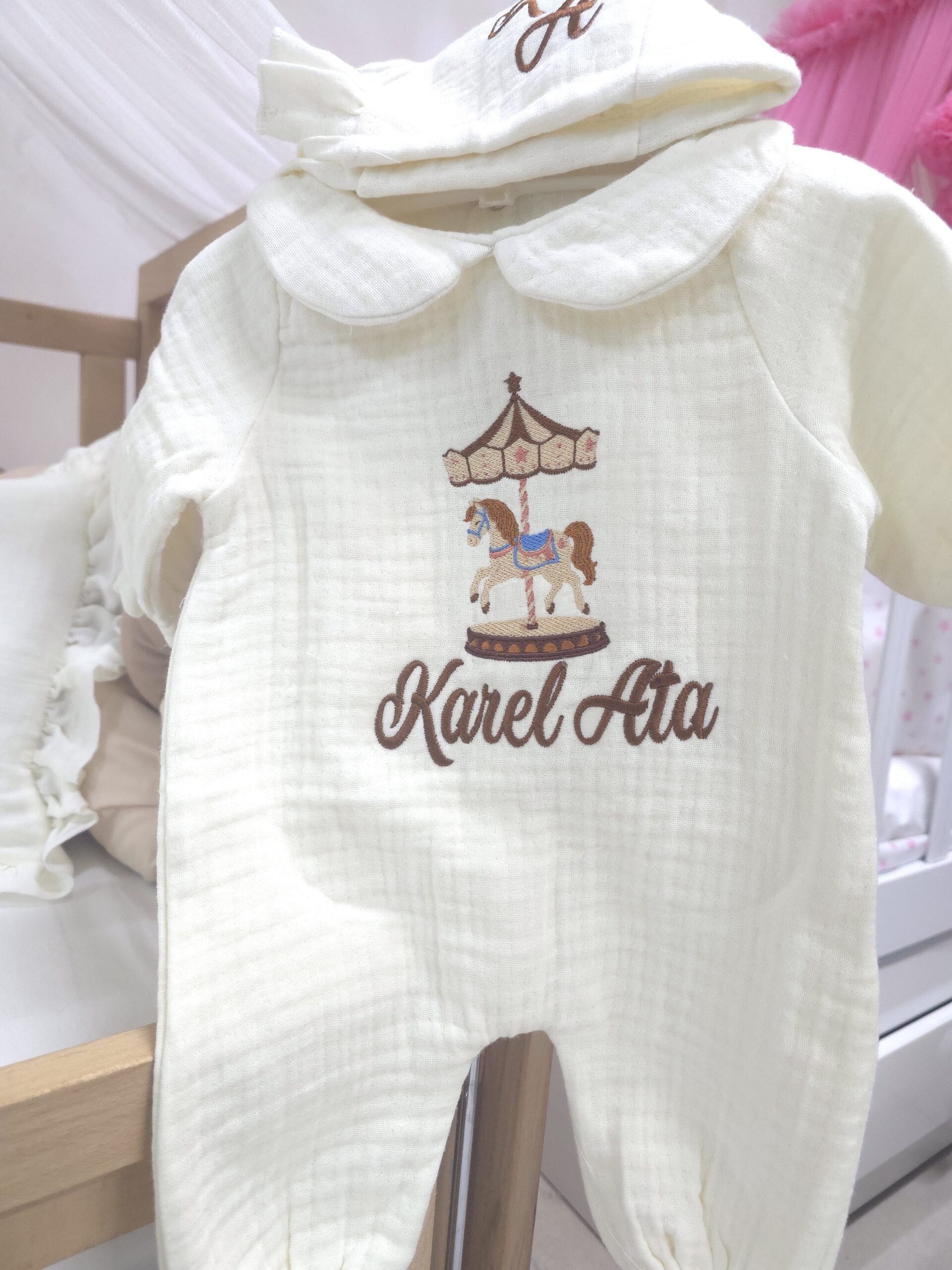 Baby Clime atölyesi olarak, yenidoğan bebeklerin ilk günlerini daha özel kılmak için %100 pamuklu, 4 katlı müslin kumaştan üretilen isim nakışlı hastane çıkışı setlerimizi özenle hazırlıyoruz. Yumuşak dokusu ve hafif yapısıyla bebeğinizin hassas cildiyle uyumlu bir kullanım sunar.