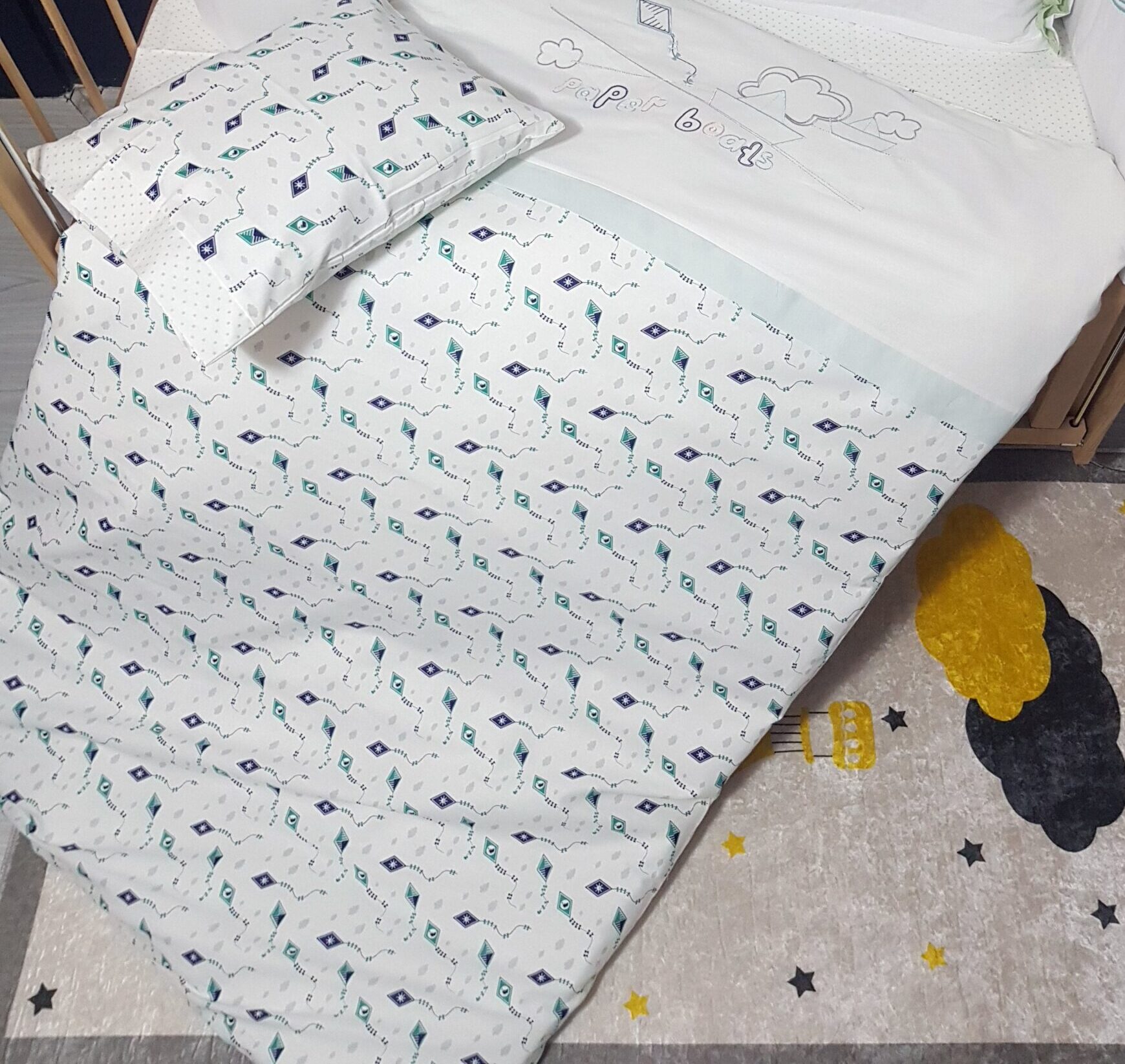 “Uçurtma” desenli kumaştan üretilen yorgan, yastık ve çarşaftan oluşan uyku seti, farklı beşik modellerine uyum sağlar. Set, tercihinize göre seçilebilecek çeşitli parçalardan oluşmaktadır.