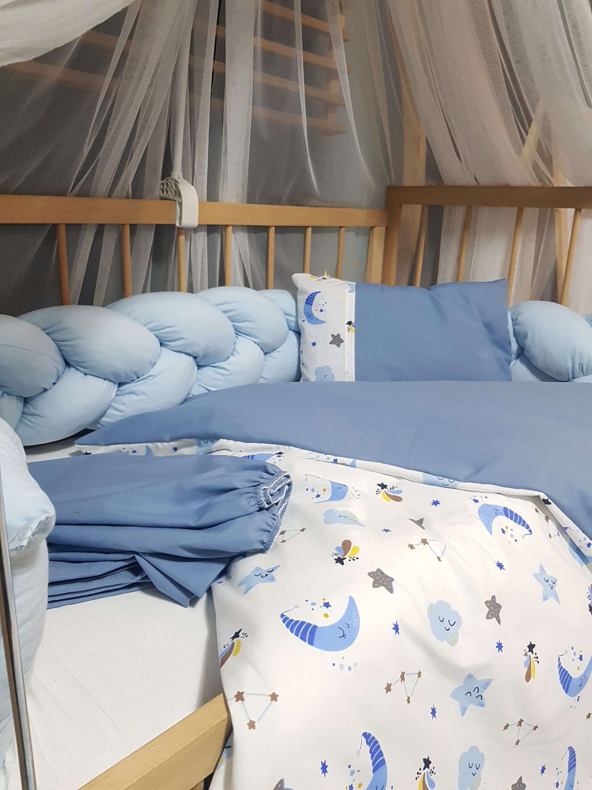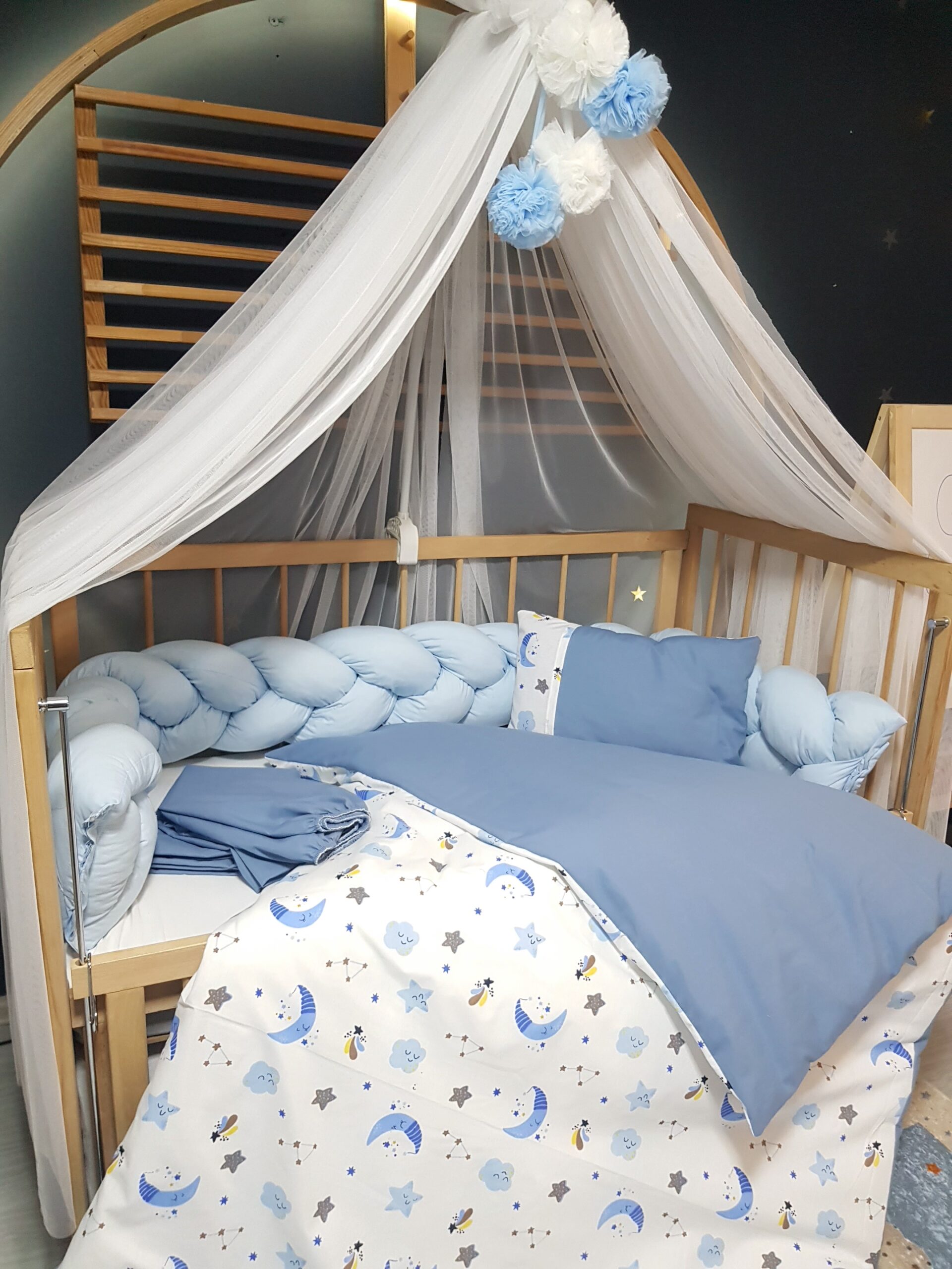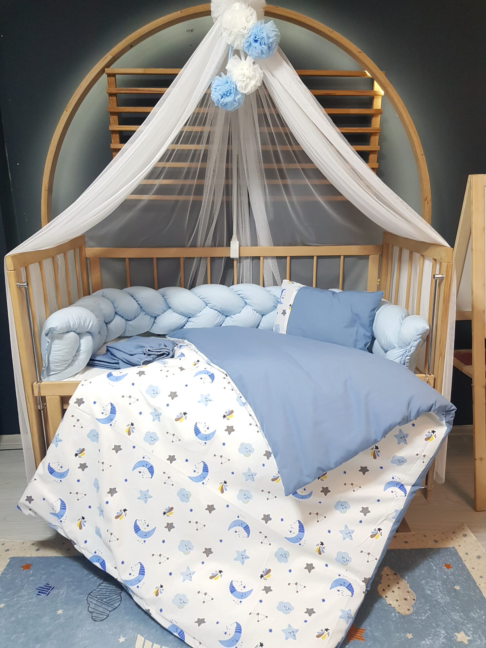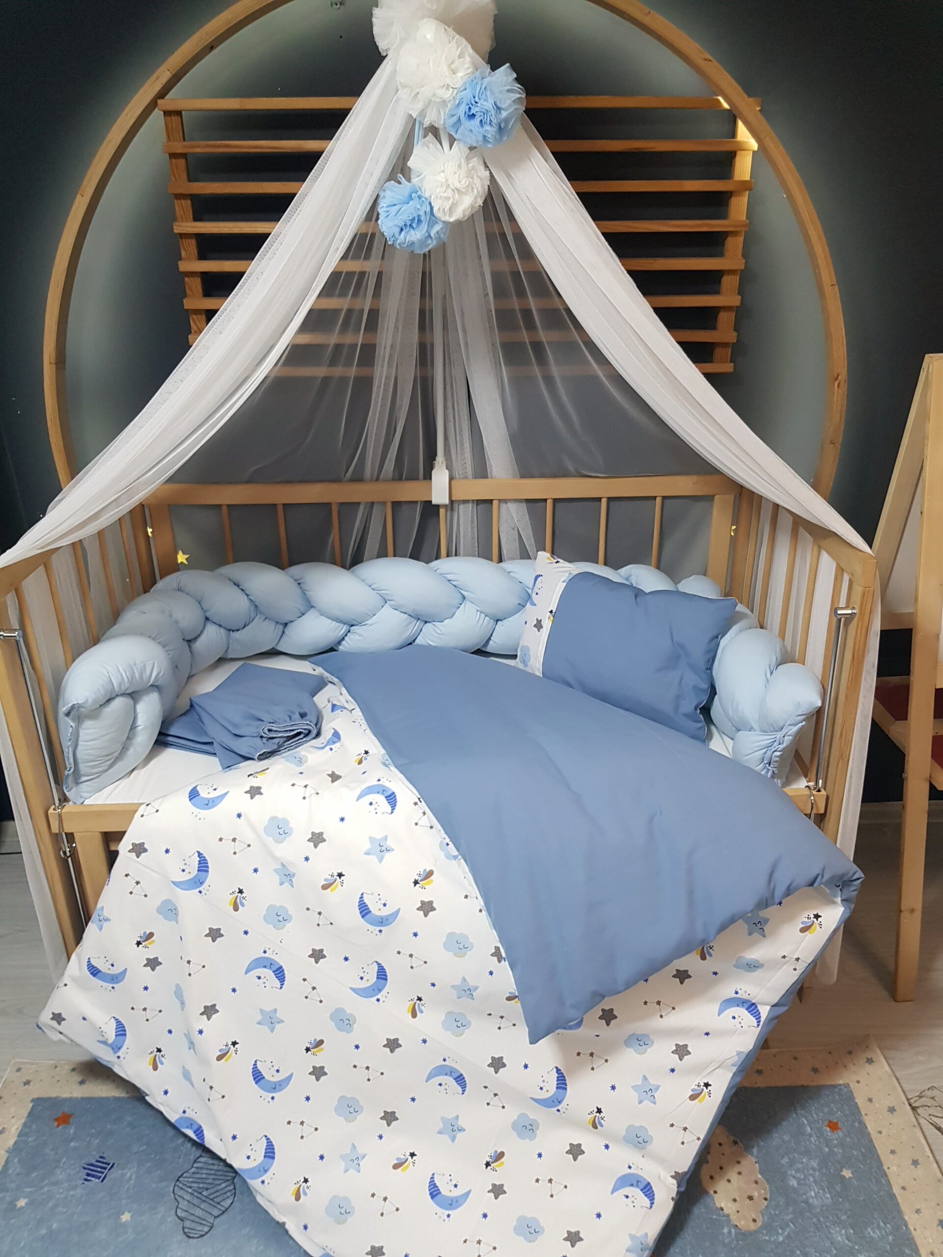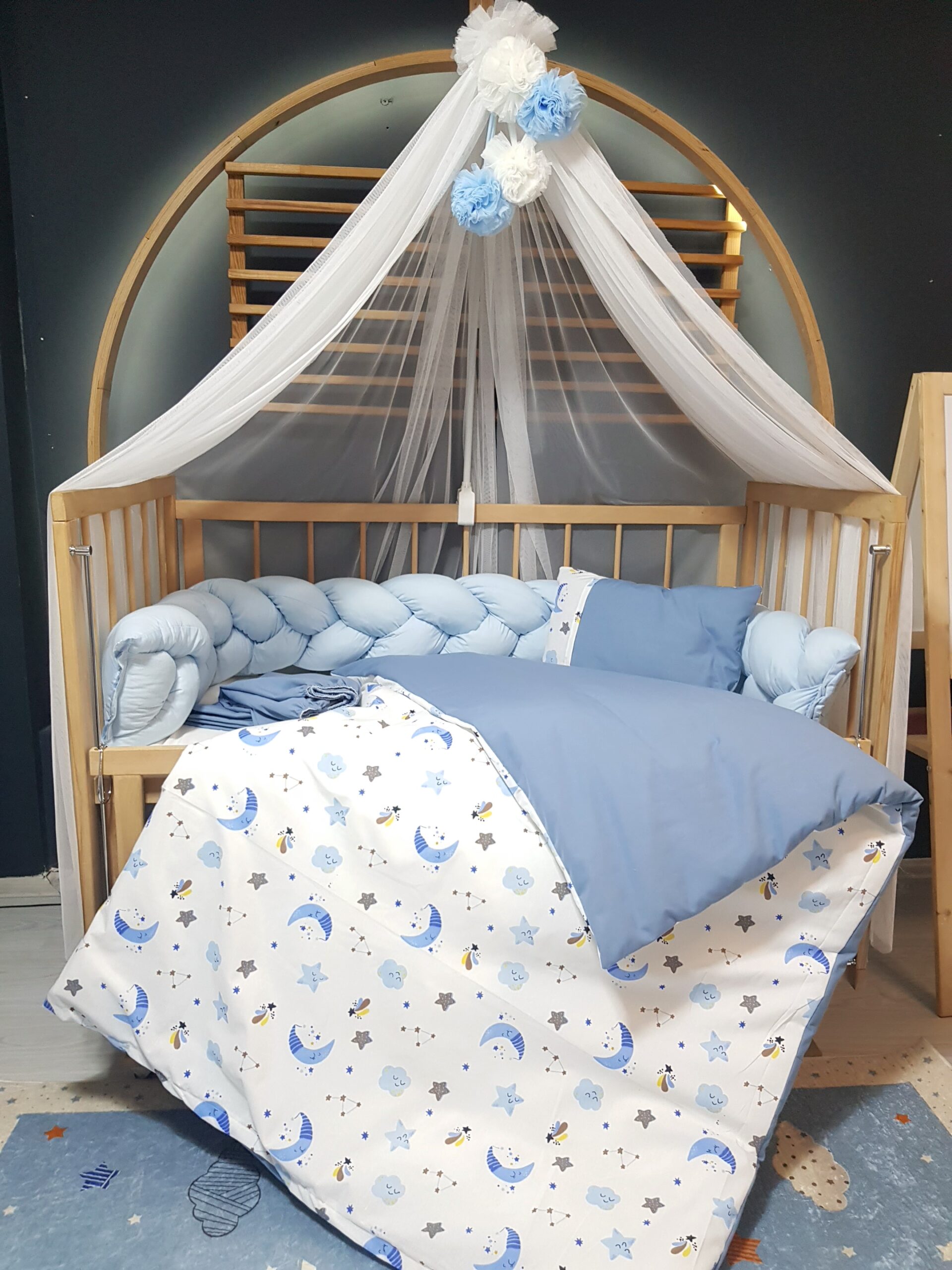 Ay ve yıldız desenli bebek uyku seti, farklı beşik modellerine uygun olarak hazırlanabilir. Setin içeriği, tercihinize göre seçilebilecek çeşitli parçaları içermektedir.