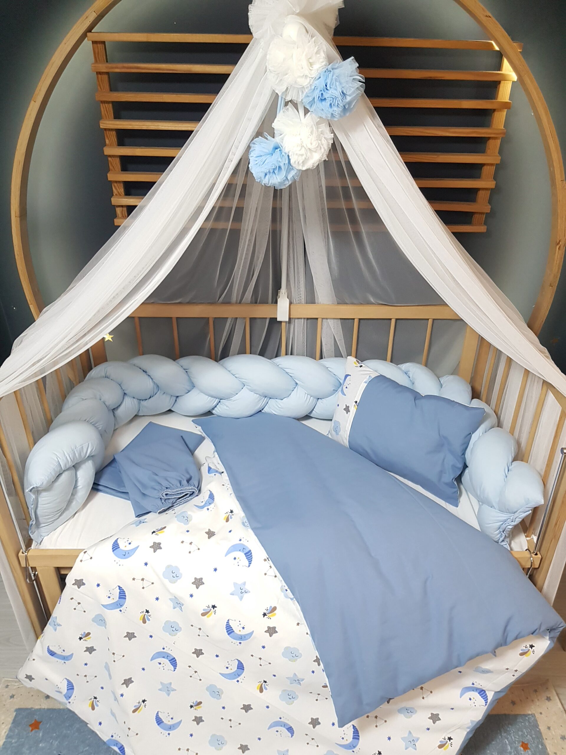 Bebeğinizin konforu ve güvenliği için özenle tasarlanan örgülü bebek uyku seti, pamuklu kumaşı ve şık tasarımıyla bebek odalarına zarif bir görünüm kazandırır.