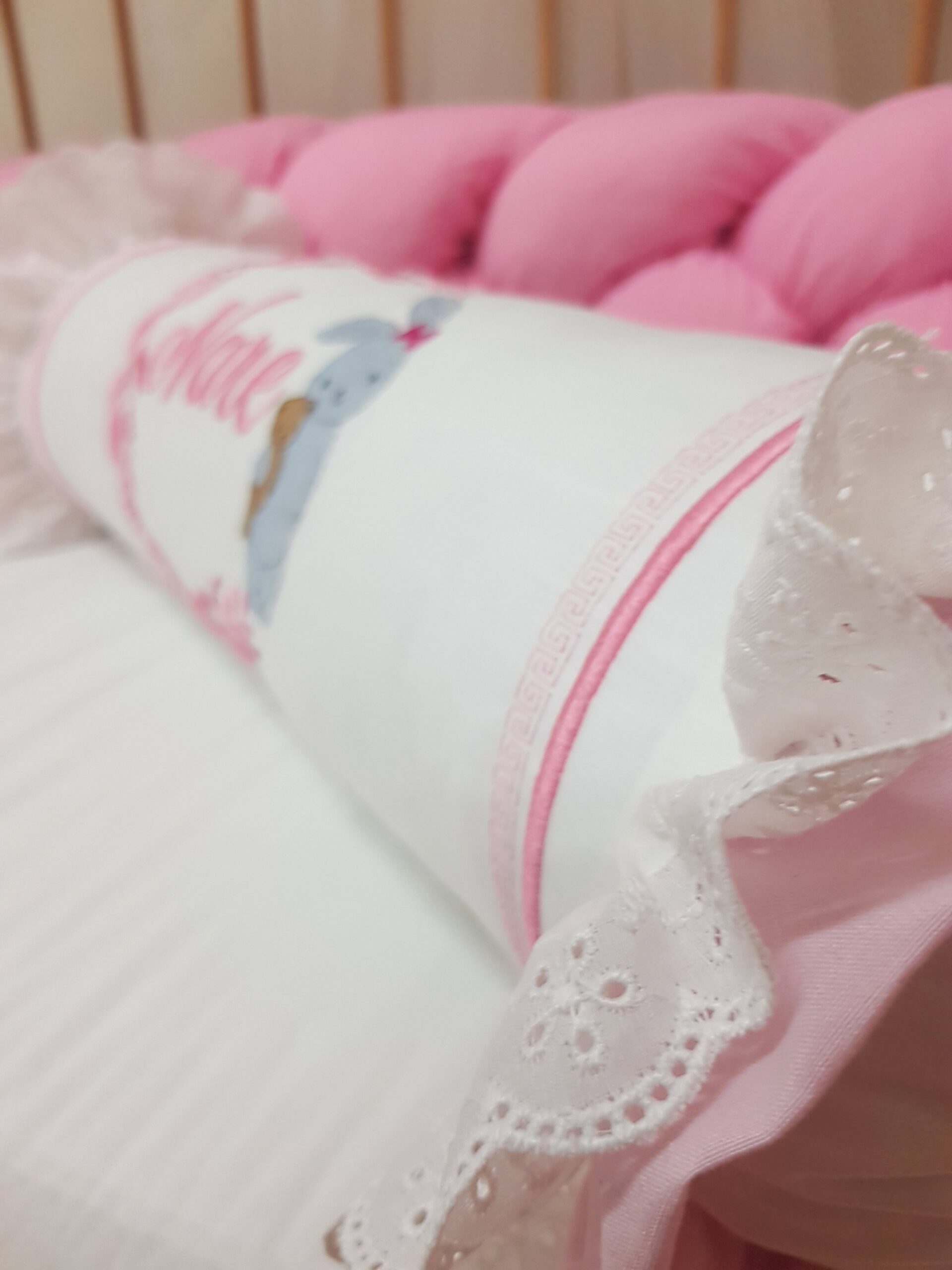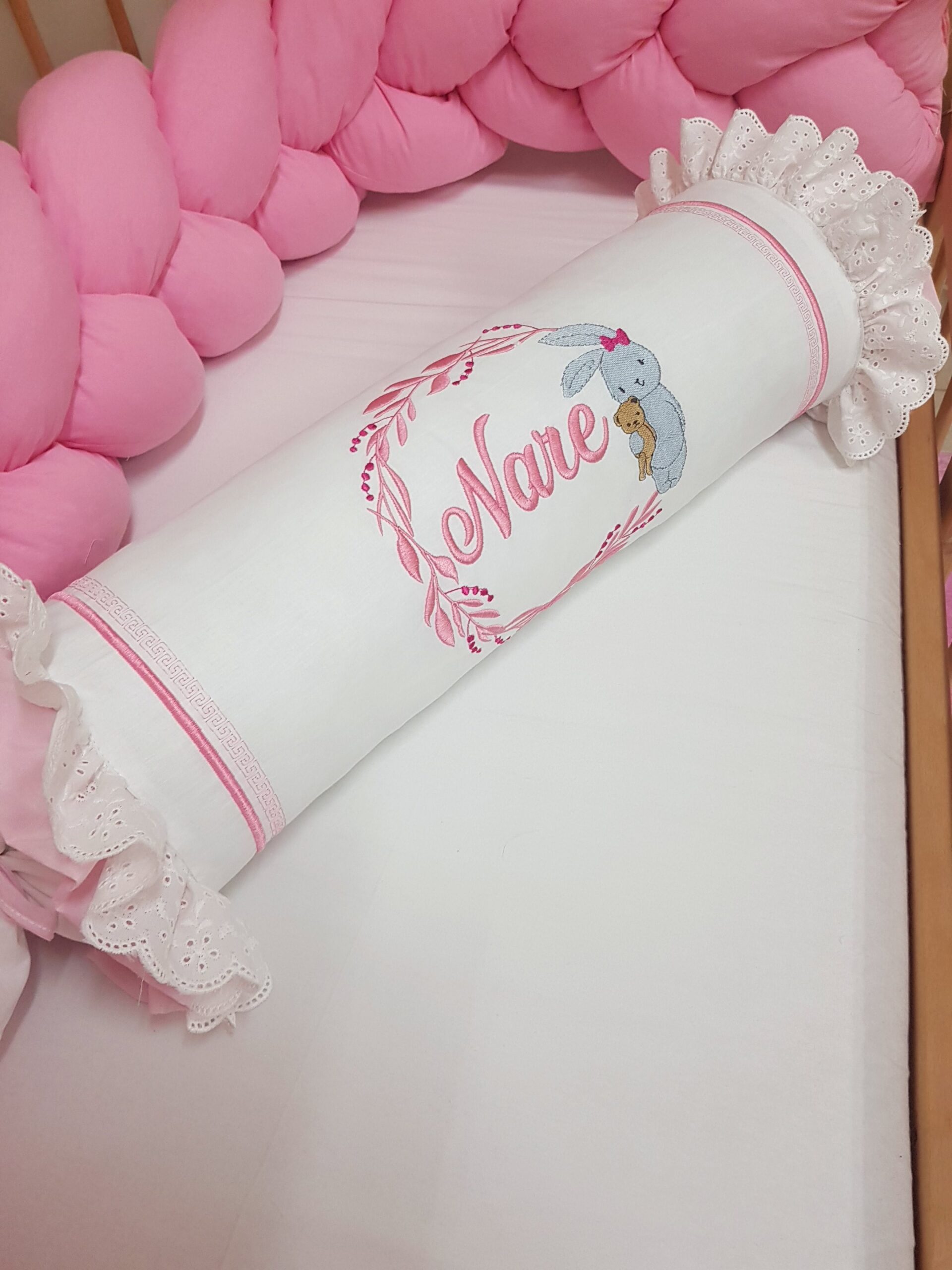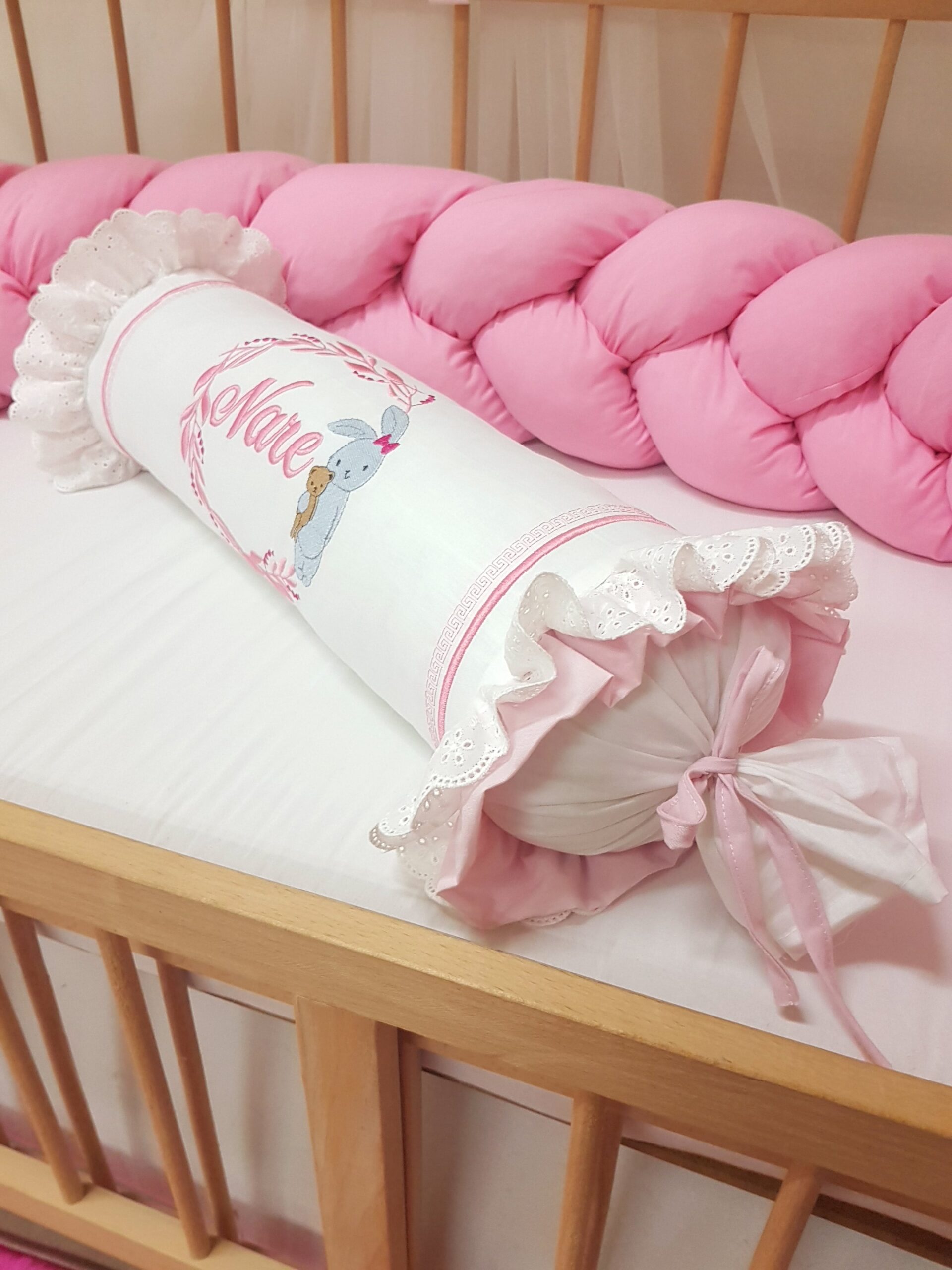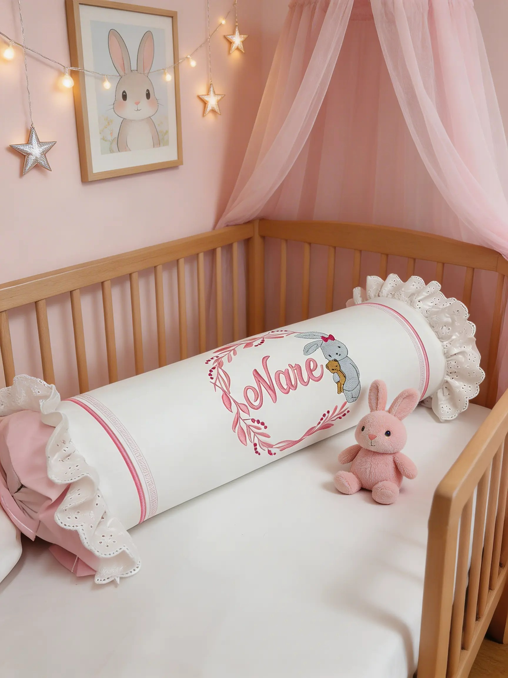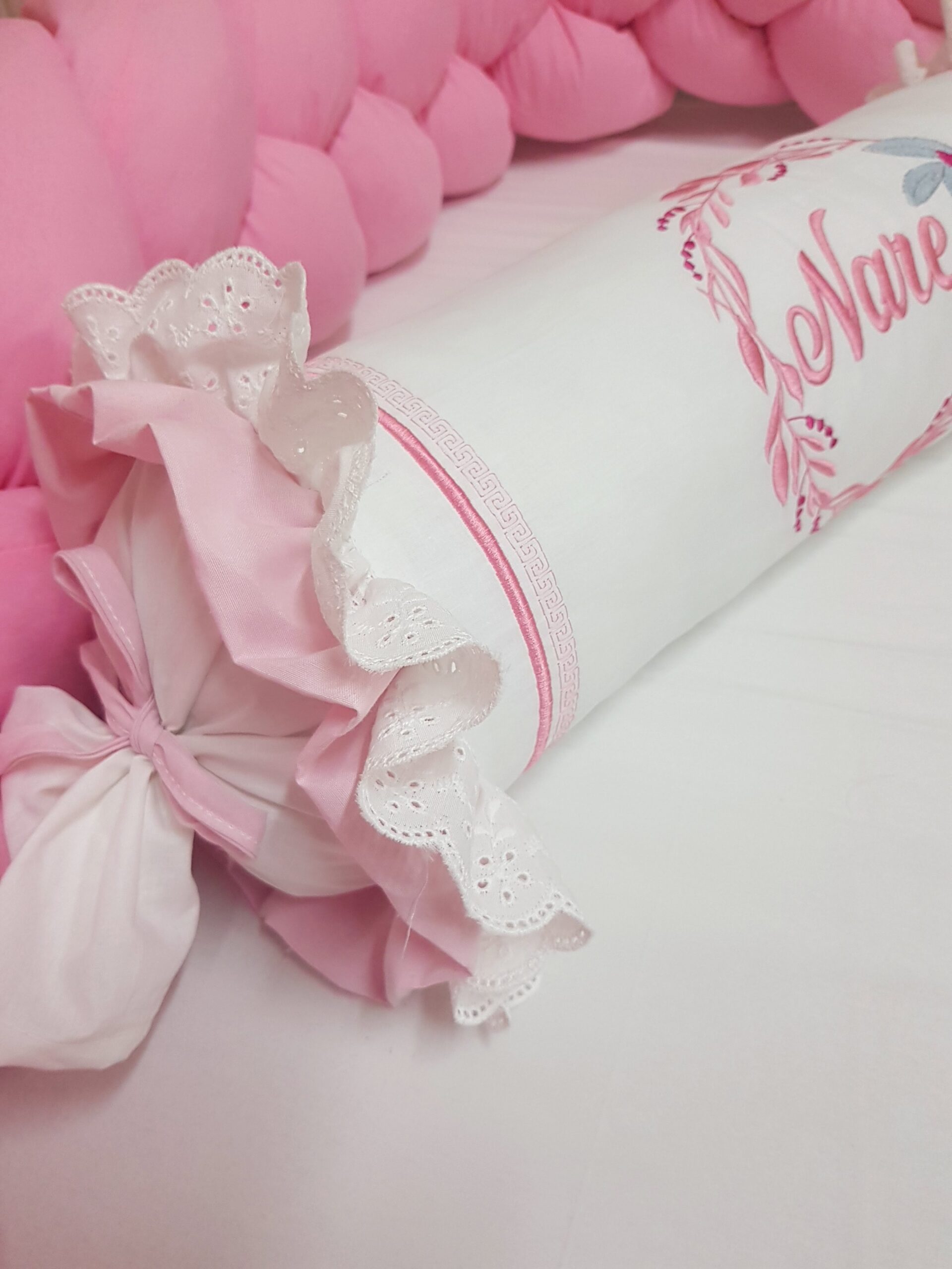 Bebek odalarına zarif bir görünüm katmak için hazırlanan kişiye özel şeker yastık, dantel ve nakış detaylarıyla dekoratif bir tamamlayıcıdır. Silindir formu sayesinde bebek odası dekorasyonu için şık bir görünüm oluşturur.