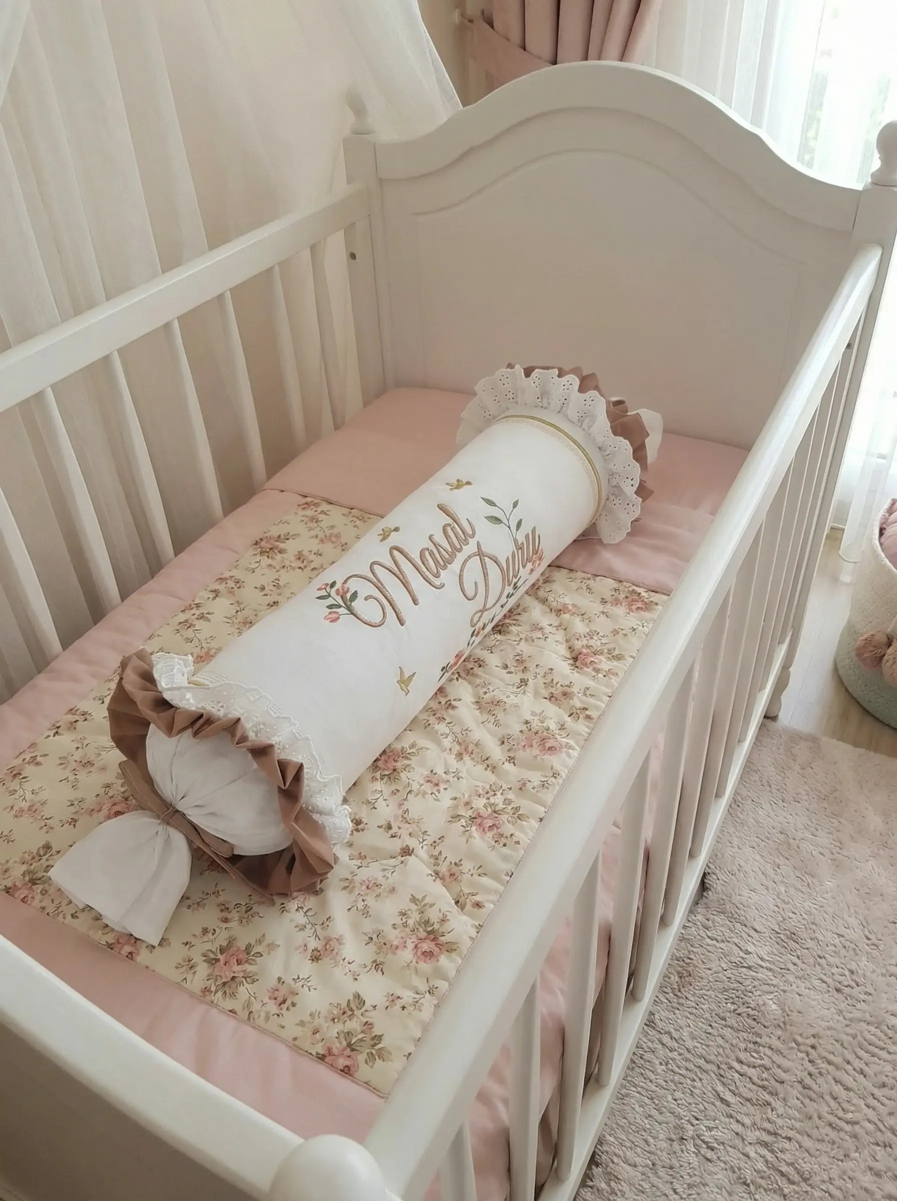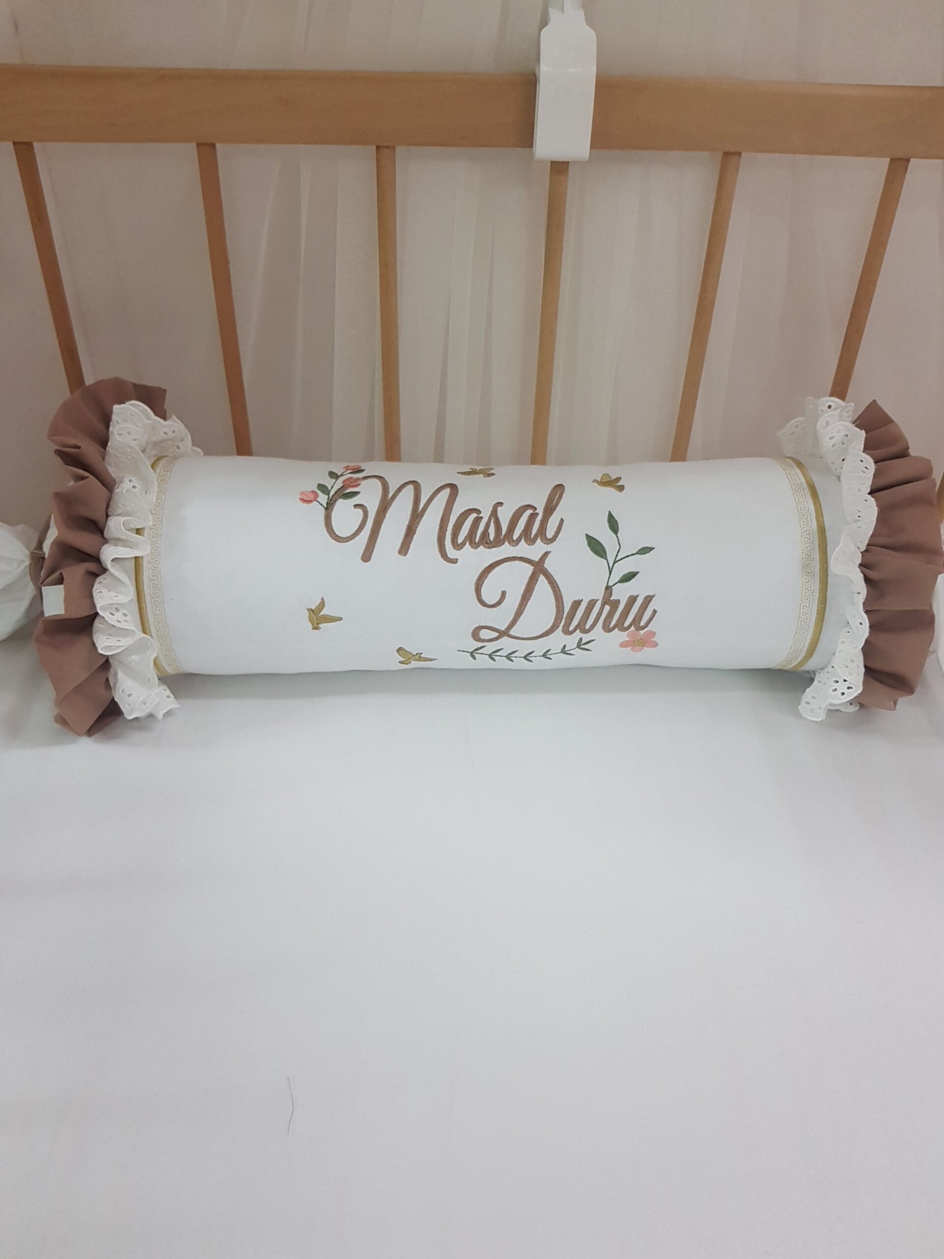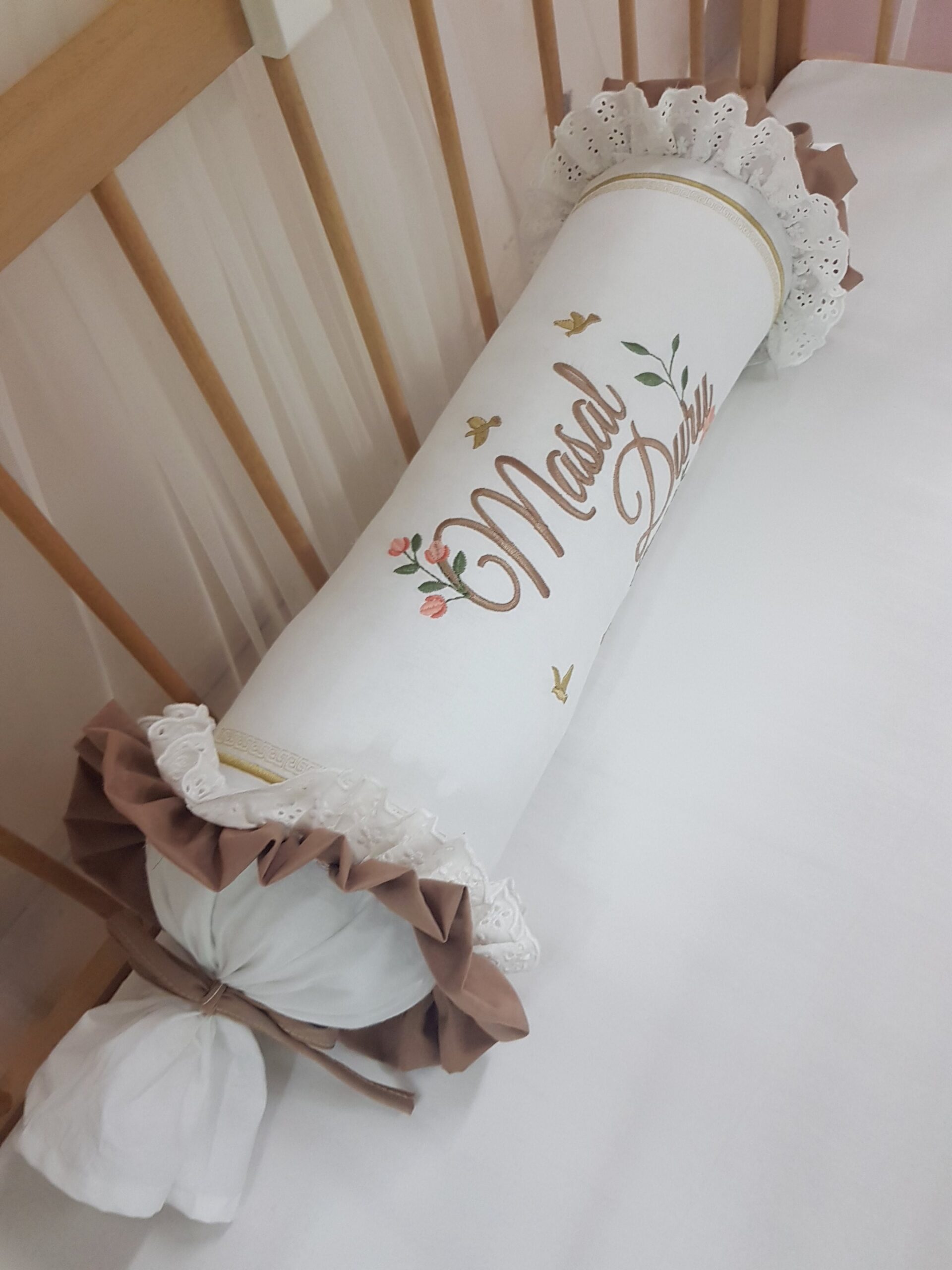 Bebek odalarına zarif bir görünüm katmak için hazırlanan kişiye özel şeker yastık, dantel ve nakış detaylarıyla dekoratif bir tamamlayıcıdır. Silindir formu sayesinde bebek odası dekorasyonu için şık bir görünüm oluşturur.