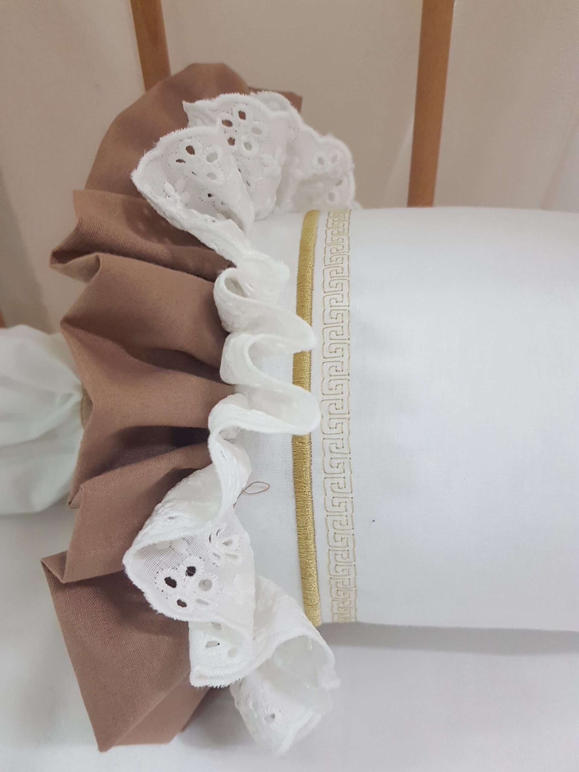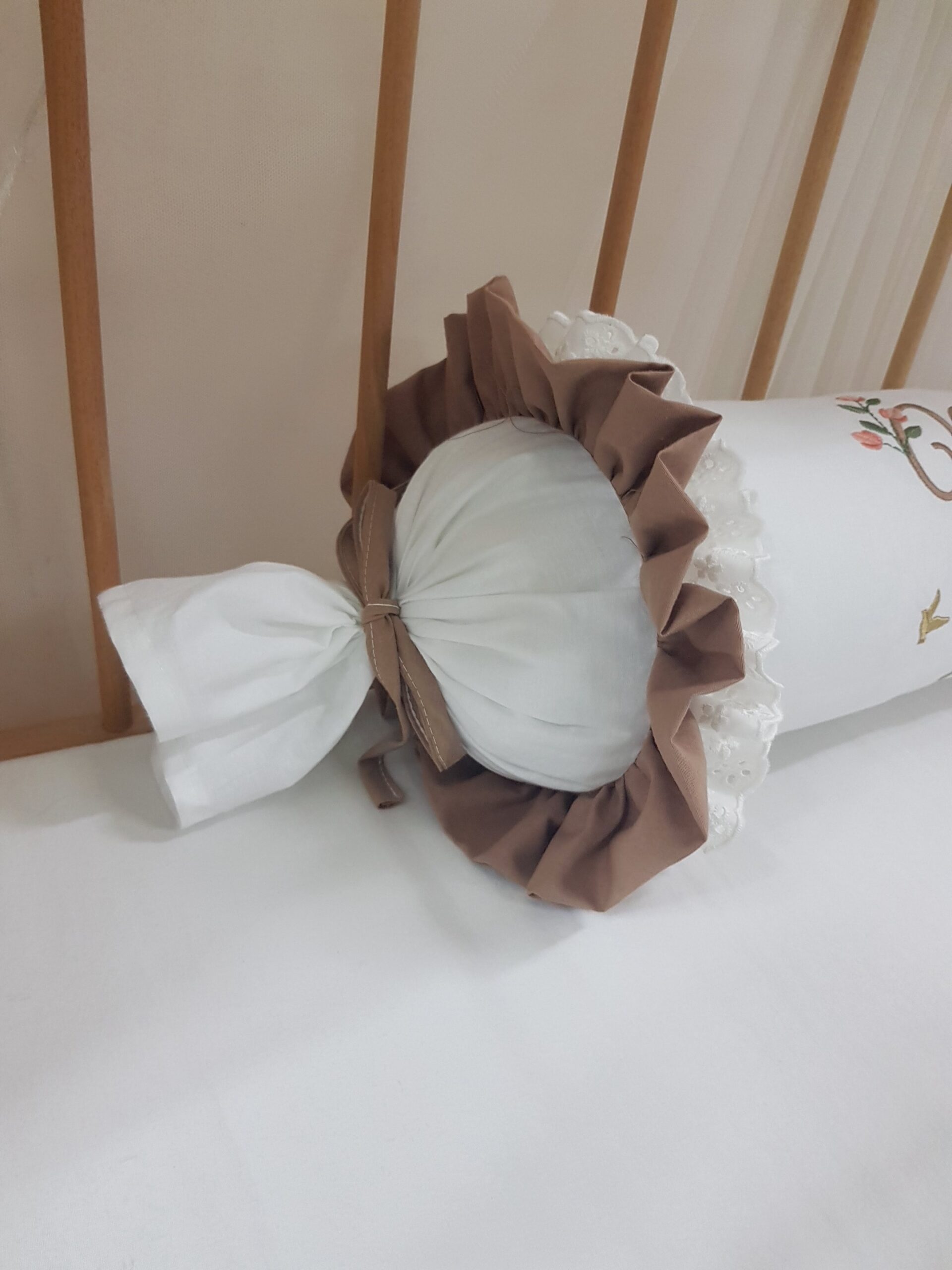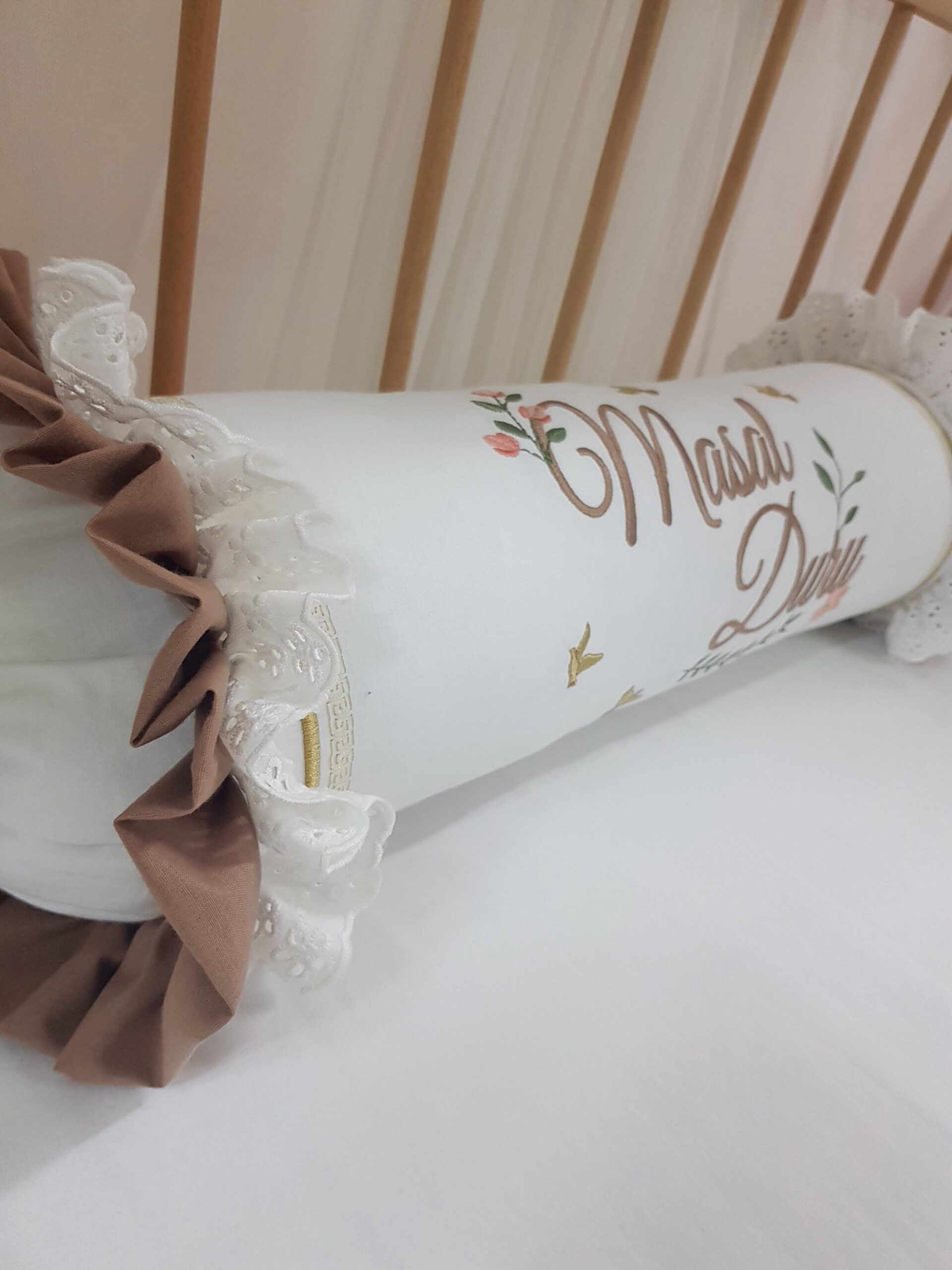 Bebek odalarına zarif bir görünüm katmak için hazırlanan kişiye özel şeker yastık, dantel ve nakış detaylarıyla dekoratif bir tamamlayıcıdır. Silindir formu sayesinde bebek odası dekorasyonu için şık bir görünüm oluşturur.